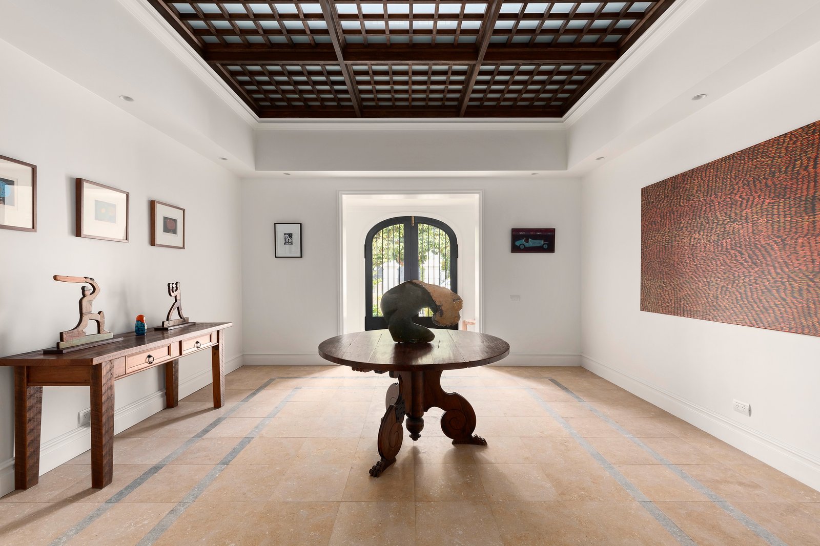 Grand European influences including Georgian-inspired columns, arched doorways, travertine flooring, and spherical foyers introduce the signature style elements and impeccable attention to detail of original architect, Nicholas Day. Curated contemporary designer lighting including pendants and sconces illuminate the home’s expansive interior dimensions, while an open central staircase lined by a wall of northerly facing glass draws in an abundance of natural light, and leads to an equally architecturally impressive custom upper-level extension.