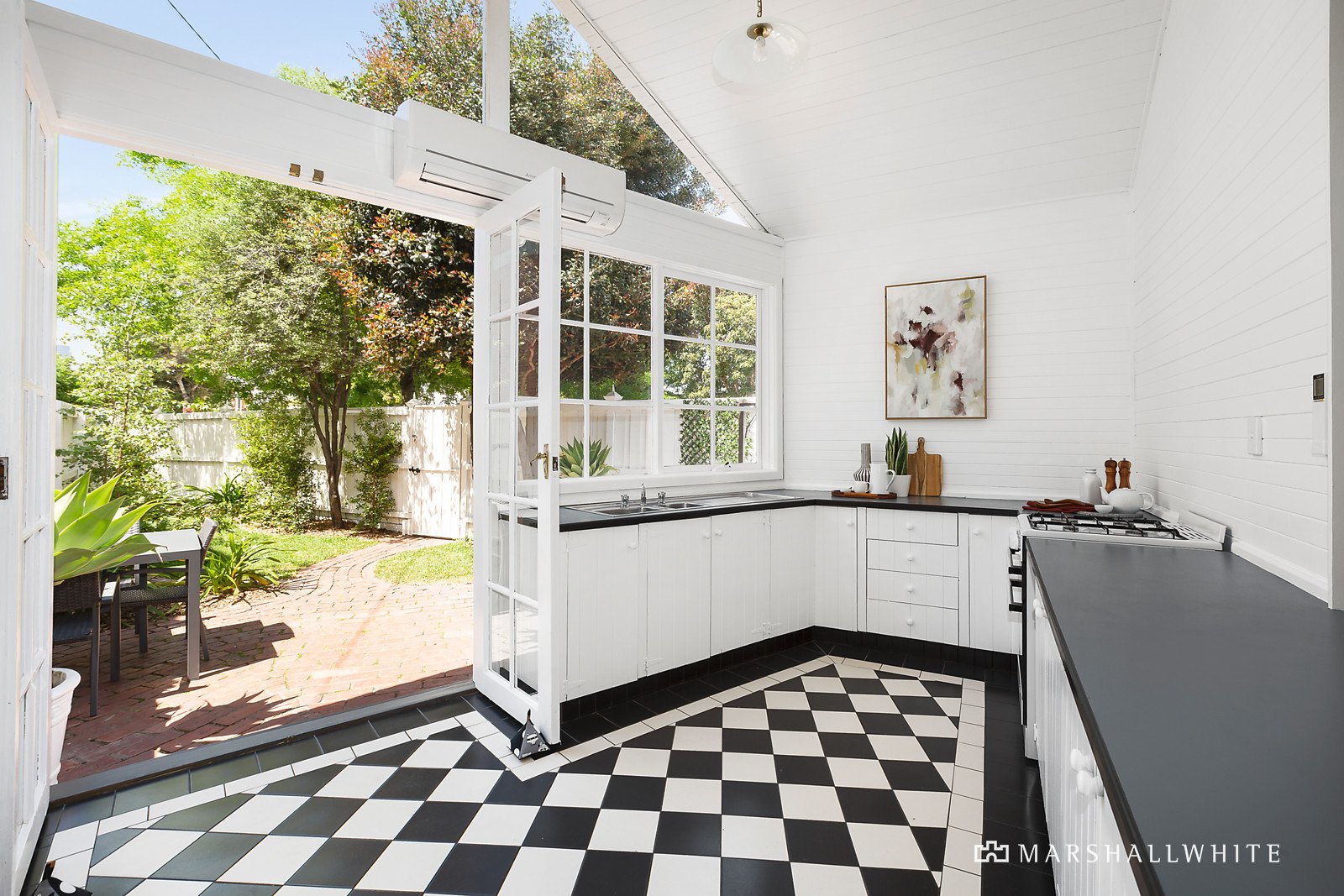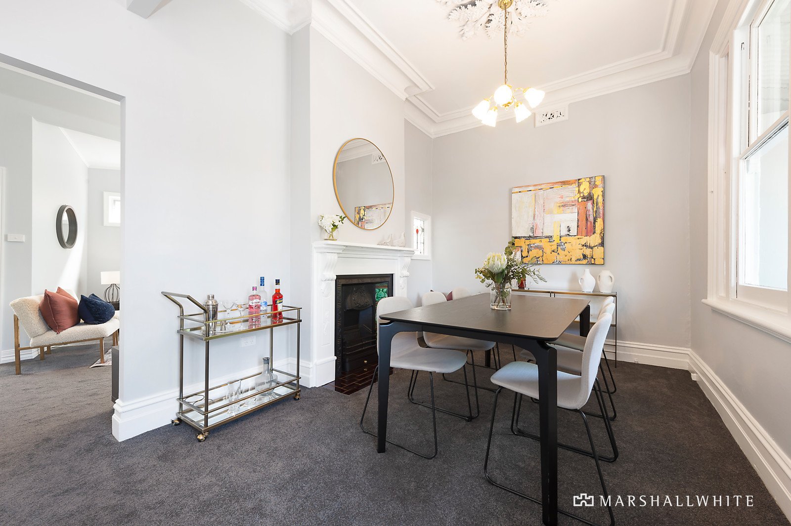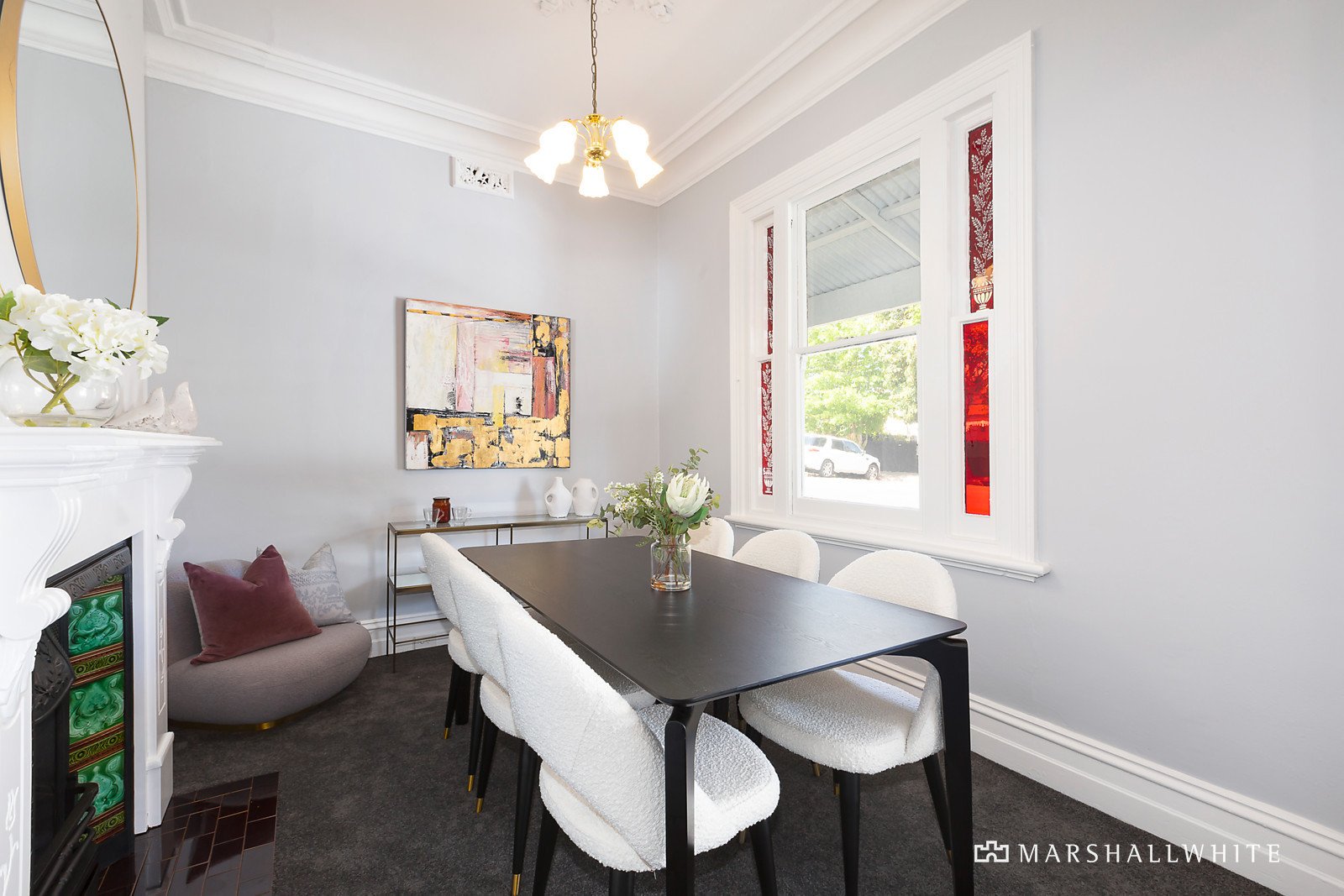 High ceilings accentuate the sense of space in the inviting lounge room (or possible 3rd bedroom) with an open fire, a spacious living/meals room and the bright well-appointed kitchen with breakfast bar. French doors open to the gorgeous private garden. The spacious main bedroom with a study nook accompanies a second double bedroom with fire place and built in robe and a stylish bathroom.