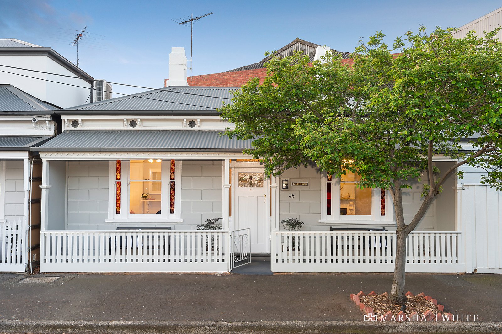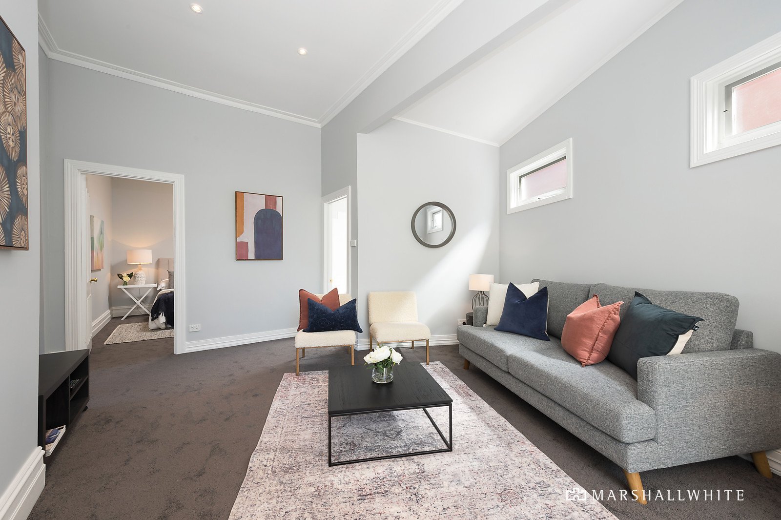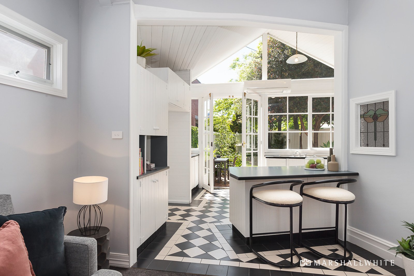 High ceilings accentuate the sense of space in the inviting lounge room (or possible 3rd bedroom) with an open fire, a spacious living/meals room and the bright well-appointed kitchen with breakfast bar. French doors open to the gorgeous private garden. The spacious main bedroom with a study nook accompanies a second double bedroom with fire place and built in robe and a stylish bathroom.