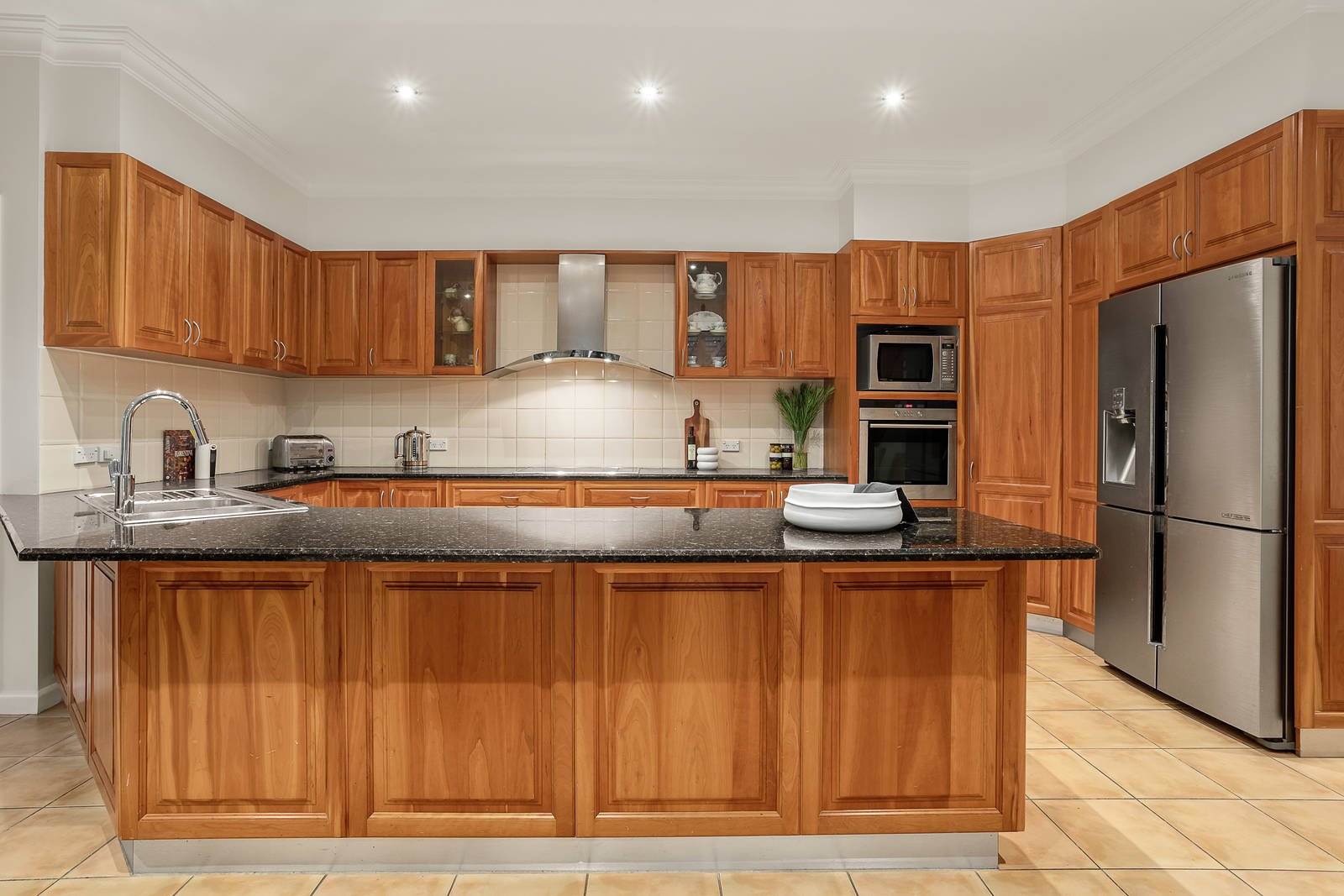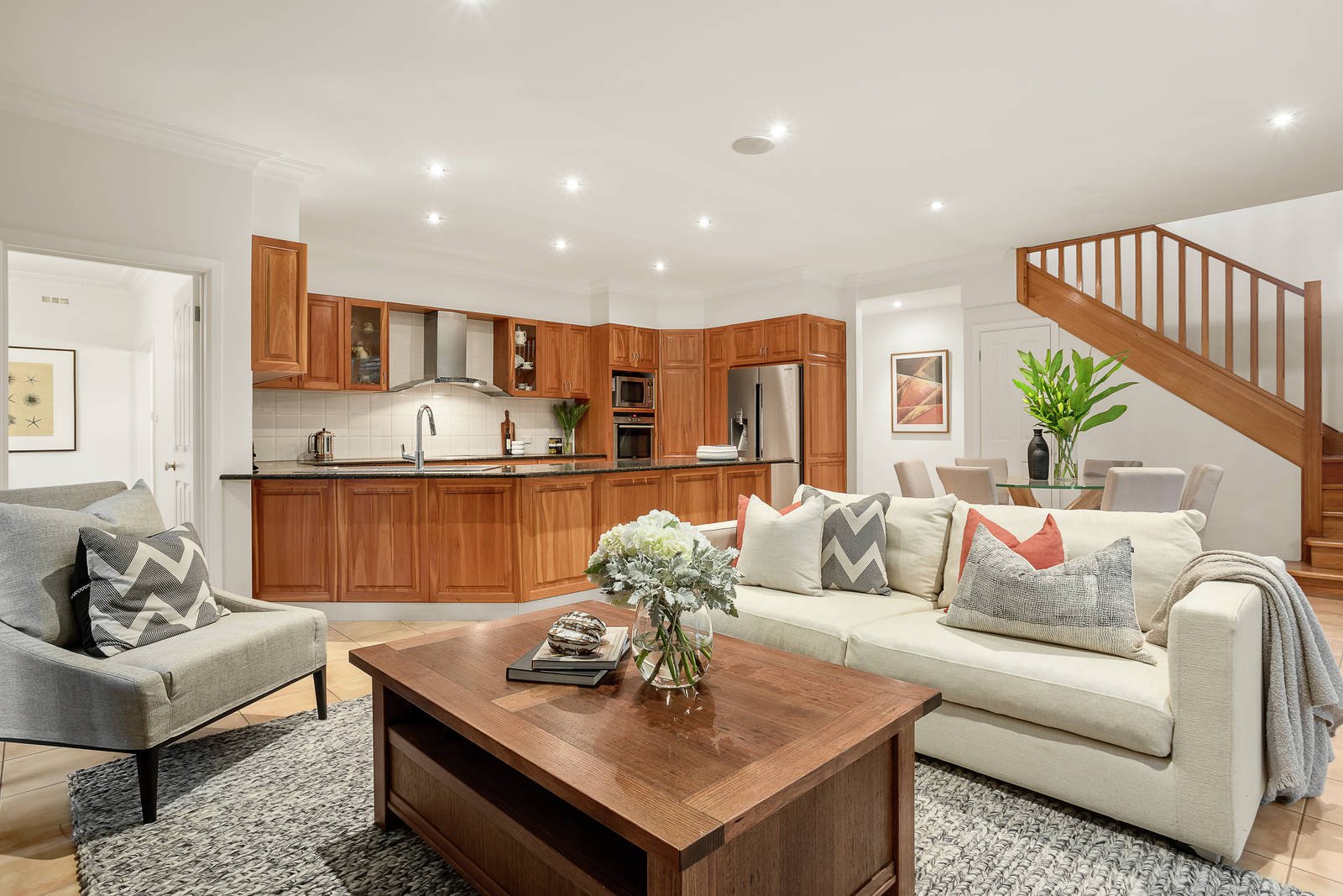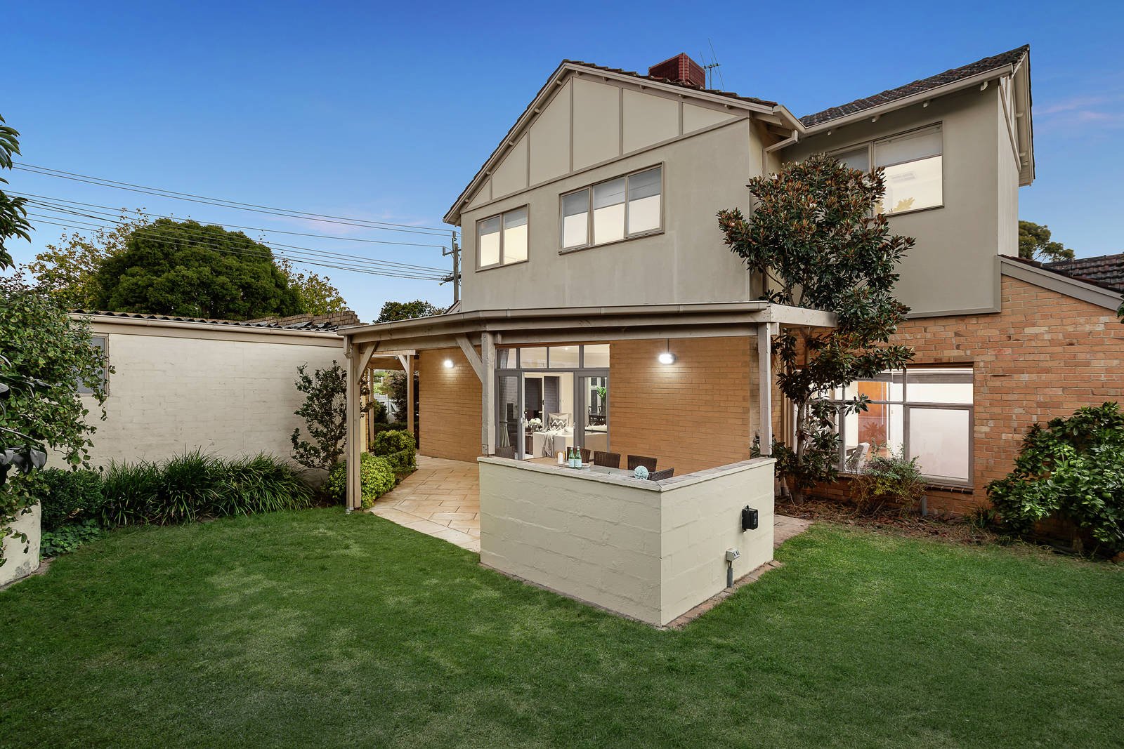 Original 1950's character including timber floors and high ceilings defines the wide entrance hall, sunny sitting room with a feature stone fireplace and the formal dining room. A large family kitchen appointed with European appliances and granite benches and the generous living and dining room open to a covered terrace with water feature and the deep private garden. The main bedroom with en suite and walk in robe and a home office or 5th bedroom are conveniently situated downstairs while a superb children's zone upstairs comprises three additional bedrooms with built in robes, a retreat and bright bathroom.