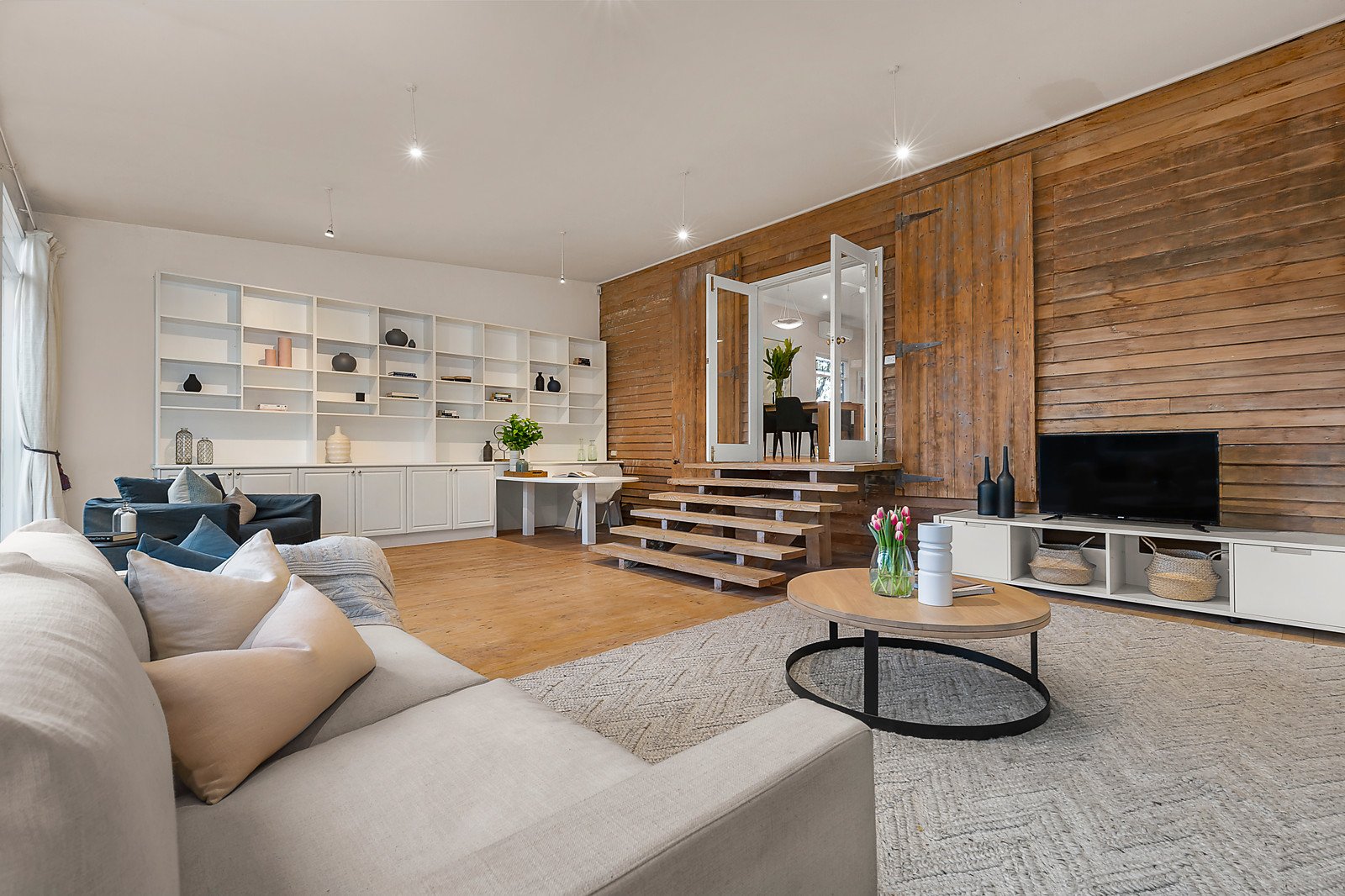 The beautifully scaled living and dining spaces featuring a rustic brick fireplace and Baltic pine floors overlook the private north-facing garden and spectacular circular pool. An equally spacious light-filled additional living area or retreat and study with a character-rich 130 year old timber barn doors opens to the private leafy rear garden. The central kitchen is appointed with stainless steel oven and timber benches.