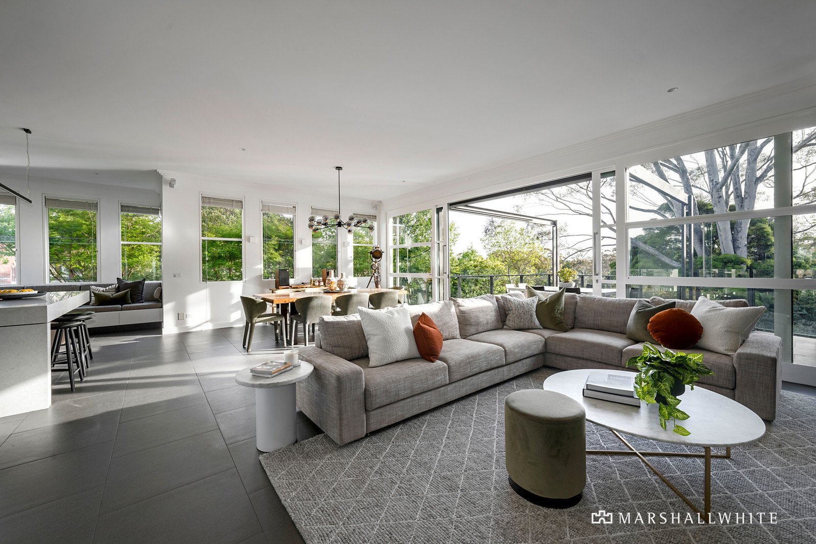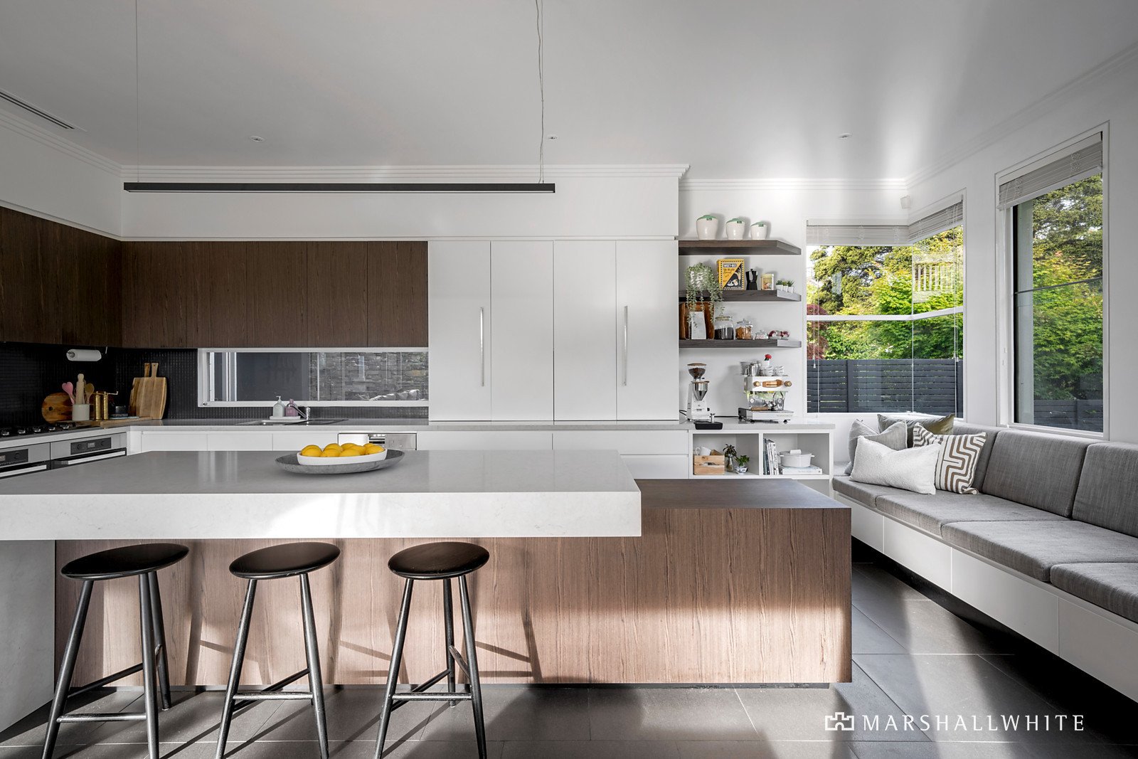 Beautifully positioned to capture 180-degree views, the designer kitchen with its stone island bench anchors the space. Here, two Miele ovens, cooktop and dishwasher are complimented by two-pack and laminate cabinetry and a clever pantry with concertina doors. The sumptuous banquette seating provides the perfect place to hang out at any time of day.