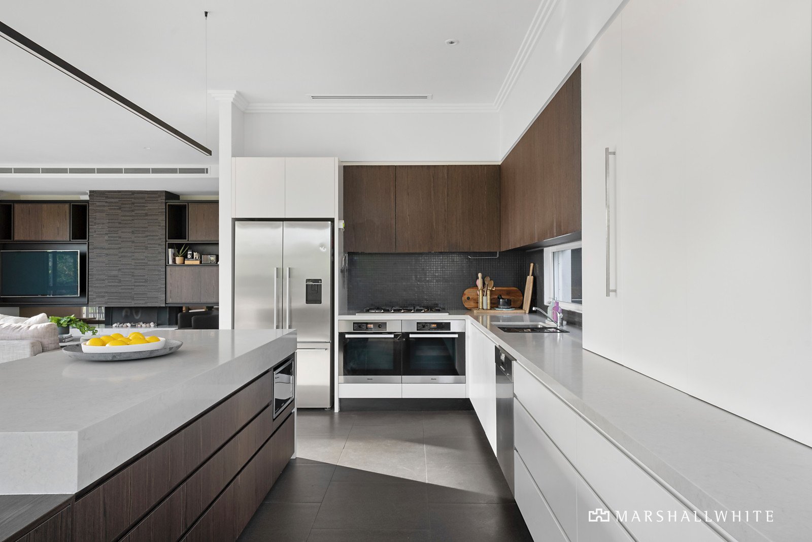 The stylish entry affords treetop views across the large family area and balcony providing a sense of seclusion and privacy unique to this esteemed address. The main living area is positioned around a gas fireplace on a marble hearth and surrounded by stone and laminate timber joinery. The dining area is defined by pendant lighting, and flanked by picture windows. The large balcony with its steel beams, retractable roof and undercover BBQ area with outdoor sink, is seamlessly connected to this family zone by timber sliding doors.