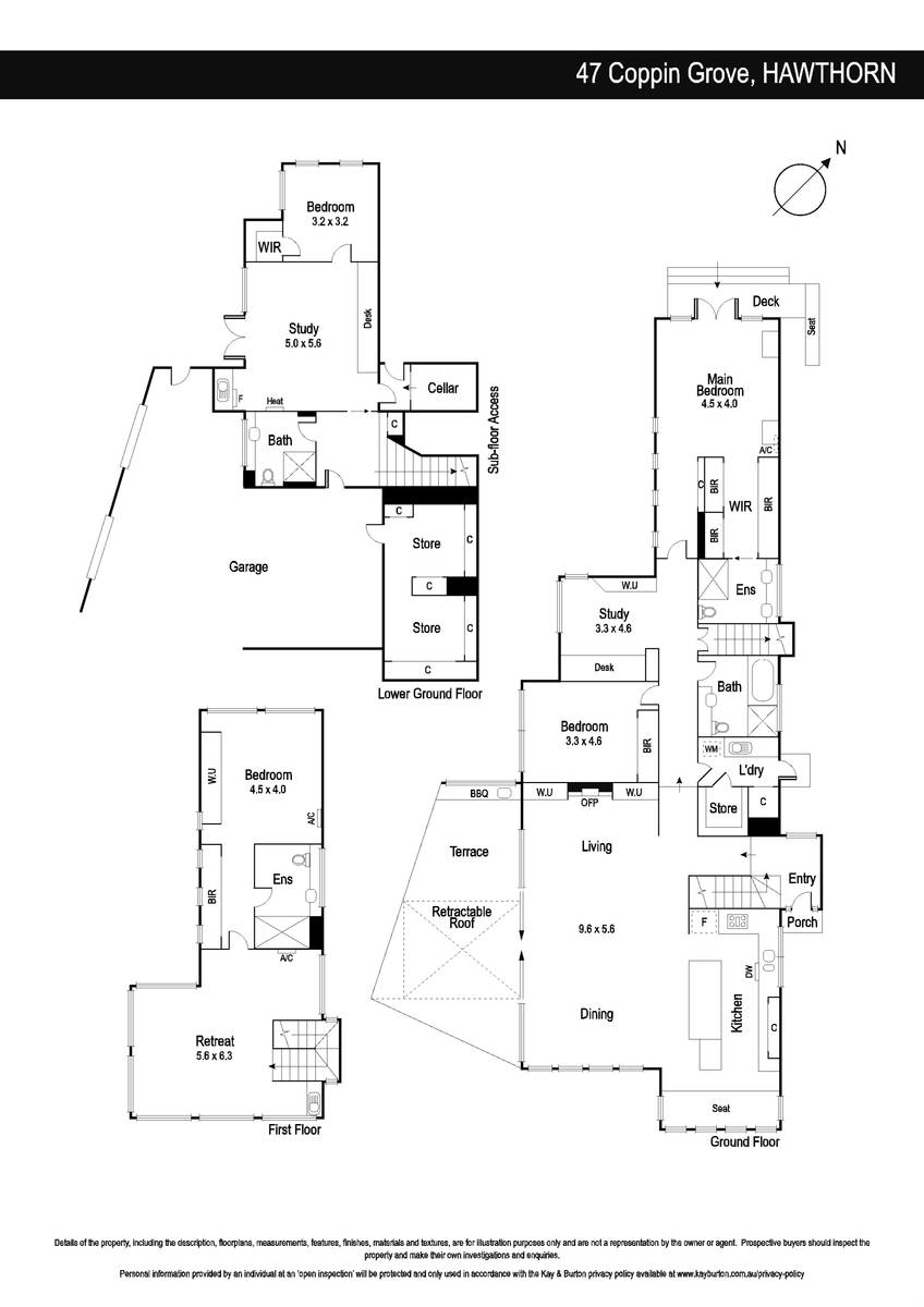 The lower ground floor is again appointed with a casual living area with kitchenette, bedroom and bathroom, and access to its own courtyard. On this level, the 3-car garage, with large storage rooms, and automatic gate access to Coppin Grove makes arriving home easy. A large cellar here could be retrofitted with a lift to the laundry above if desired.
