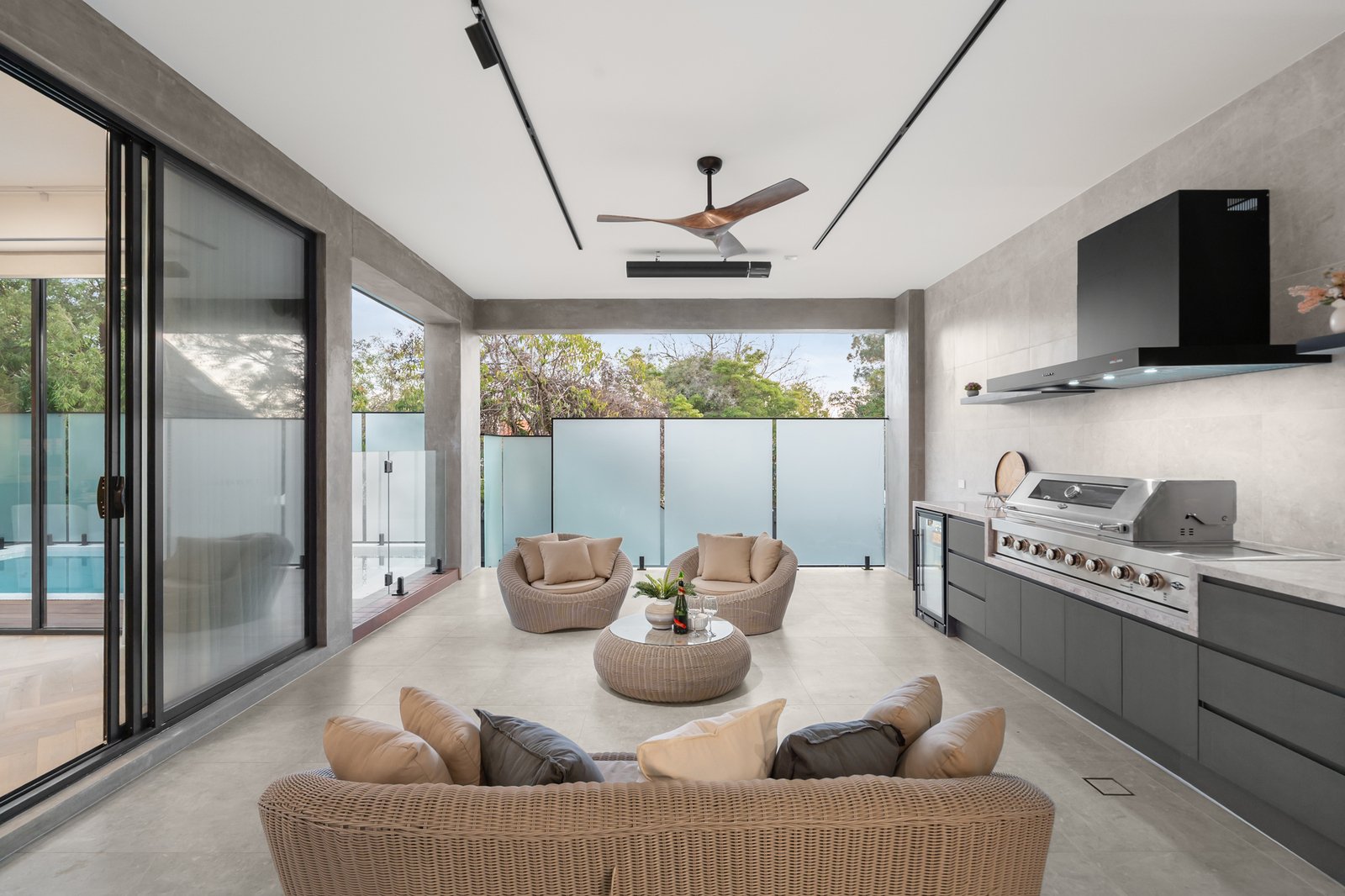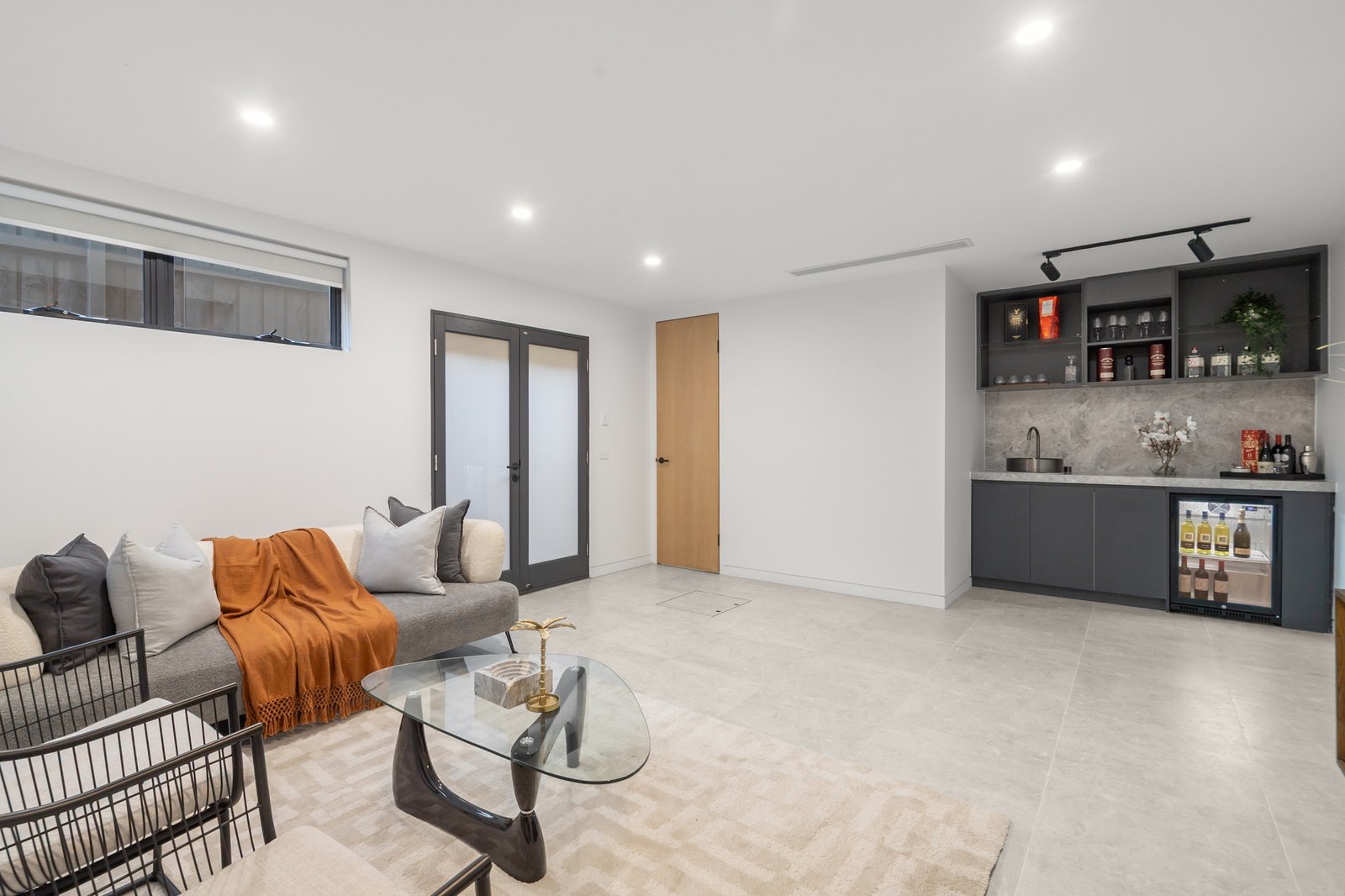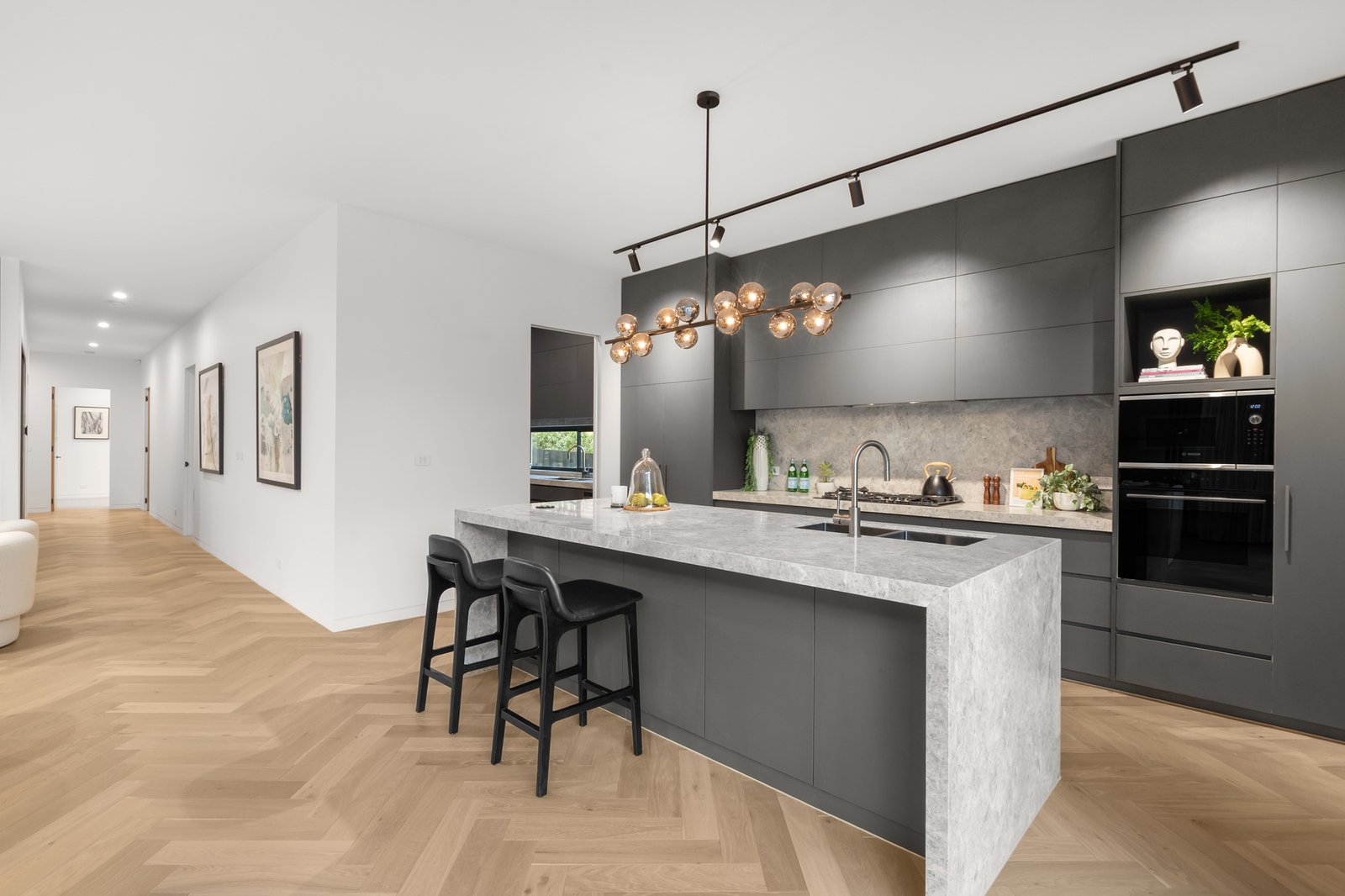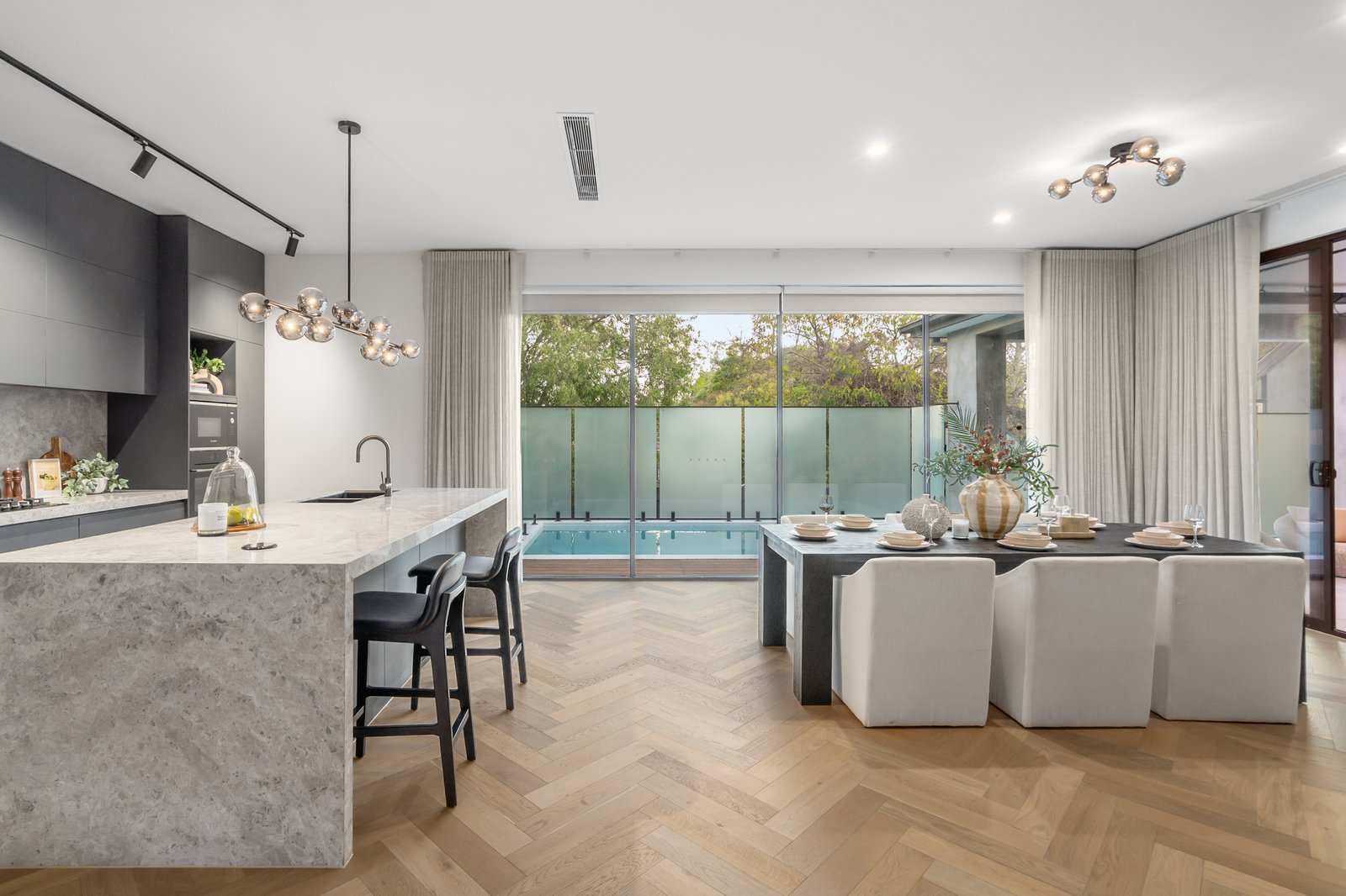 A soaring timber pivot door reveals an entrance foyer and generous sitting room featuring 3m ceilings and rich oak parquetry floors. The palatial open plan living and dining domain is impeccably served by a state-of-the-art kitchen appointed with stone benches, premium Bosch appliances, integrated Miele fridge/freezer and a fully equipped 2nd kitchen. Stacking glass sliders open to a fabulous undercover al fresco zone equipped with a deluxe BBQ kitchen, outdoor heaters and fan, and overlooking a picturesque mosaic tiled heated pool.