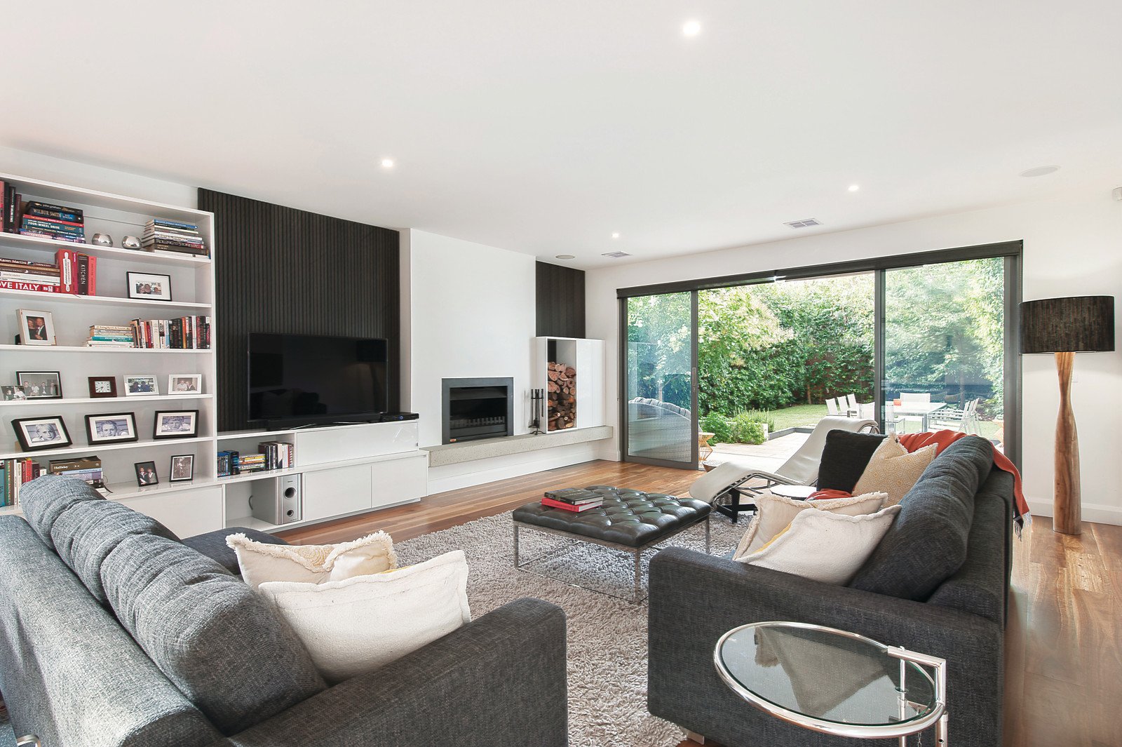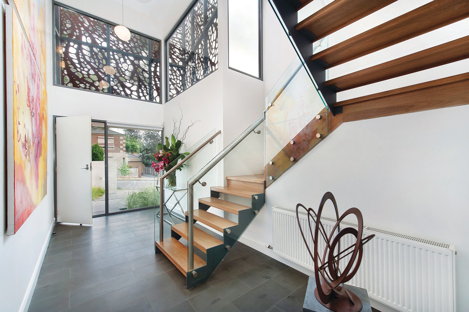 Behind a striking, custom-made screen, double height ceilings and honed bluestone floors create a wonderful first impression through the soaring entrance foyer. Spotted Gum floors define the generous open plan living and dining room, with open fireplace and sleek white stone gourmet kitchen boasting Miele appliances, a walk in pantry and garden views through the large windows. Designed for inside and alfresco entertaining, the living area opens onto a tranquil, low-maintenance north-facing garden with covered BBQ terrace. Feature open stairs lead up to the beautiful main bedroom with designer en-suite and walk in robe, two additional double bedrooms with built in robes, a stylish bathroom and bright retreat with elevated views.