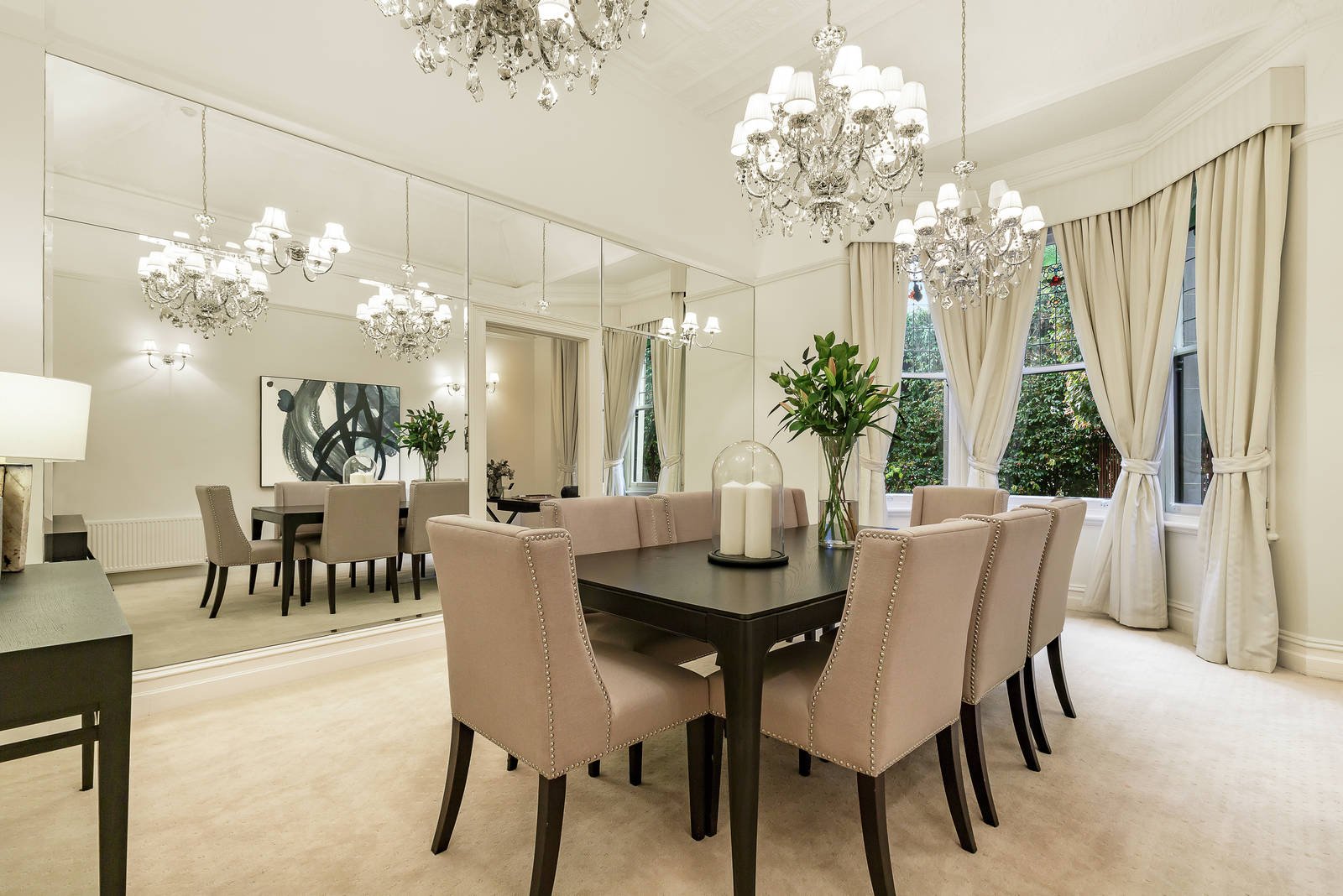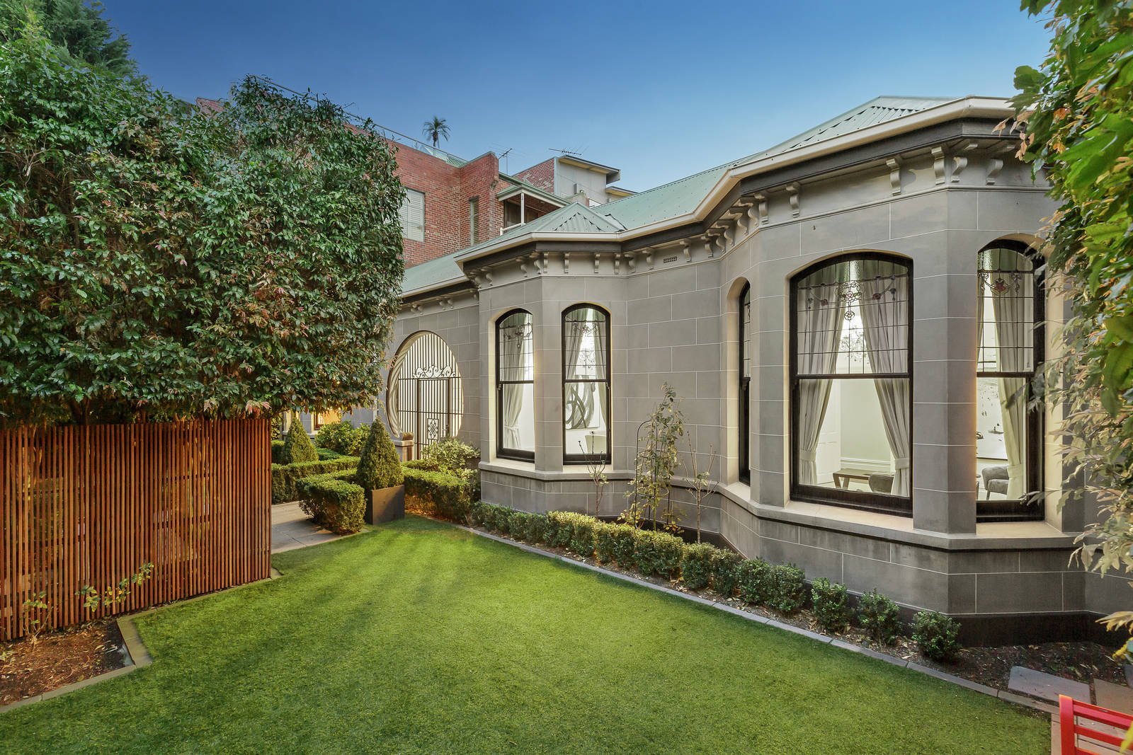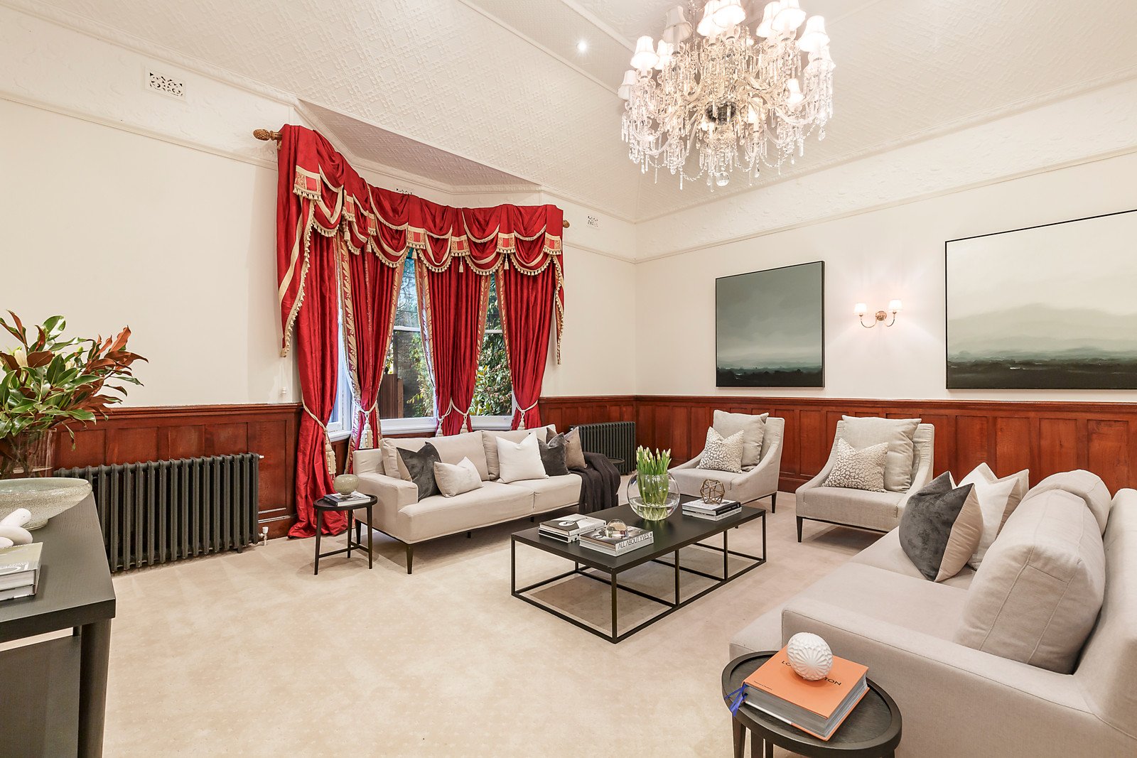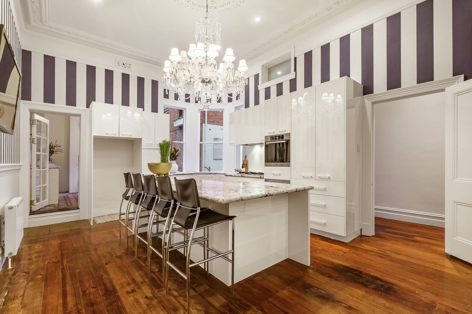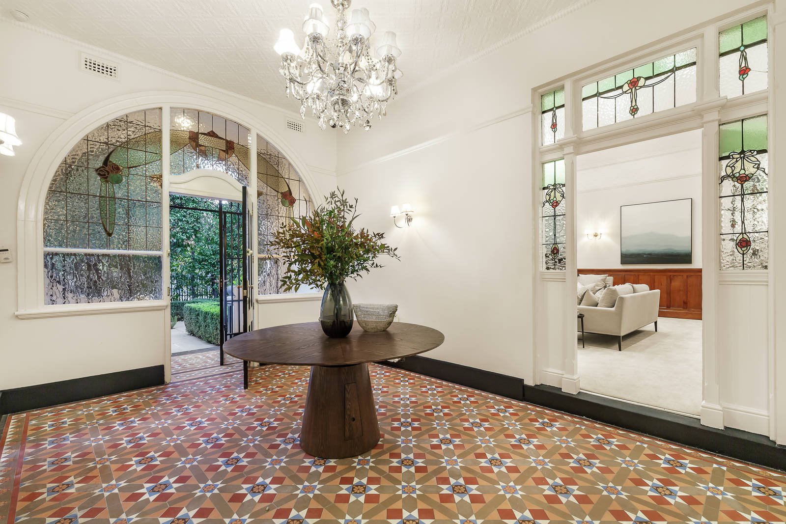 Glimpsed from the street through a high hedge and landscaped gardens, the distinctive exterior reveals an imposing central tessellated reception hall between a magnificent sitting room with open fire, gracious formal dining room and a refined home office, all featuring beautiful vaulted pressed metal ceilings and bay windows. An elaborate ceiling rose and stunning chandelier preside over the impressive gourmet kitchen appointed with lavish granite benches and Miele appliances. Flexible family accommodation comprises a double bedroom with en suite, two additional bedrooms, a bathroom and powder-room downstairs, while upstairs there is the main bedroom with a dressing room and two bathrooms. Ideal for entertaining, the easily maintained private garden includes a powder-room and converted double storey stables providing fabulous self-contained accommodation with 2 bedrooms, a living room and bathroom.