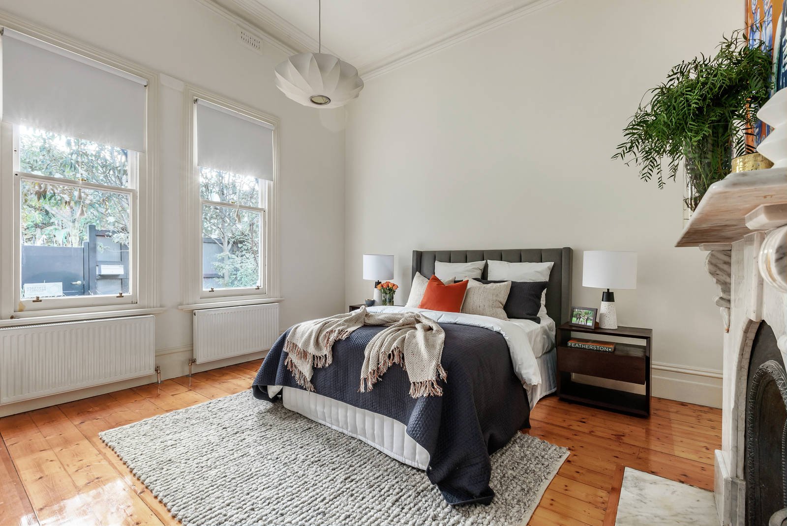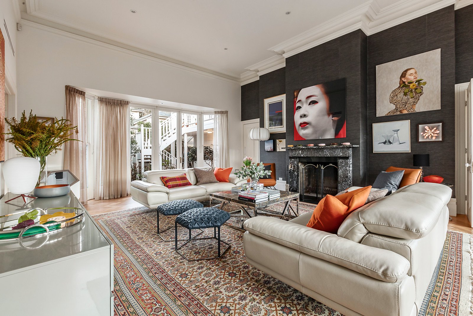 Bathed in year-round natural light and featuring parquetry timber floors, an expansive sitting room with marble open fire opens out to the glorious west-facing private landscaped garden and heated plunge pool. An equally spacious living room with a gas log fire and refined formal dining room both open through bi-fold doors to the picturesque north-facing private garden and large paved entertaining terrace. In a separate wing, a wide arched hallway introduces an elegant library/home office with marble open fire and an inviting retreat with marble fireplace overlooking the garden. The gourmet kitchen appointed with stone benches and a 90cm Smeg oven and the family dining room also open to the garden. Superbly zoned family accommodation comprises in one wing, the main bedroom with open fire, stylish en suite and walk in robe and a second bedroom with marble open fire. In a second wing there are two additional bedrooms with open fires and a chic bathroom. Above the double garage, a self-contained studio apartment with kitchenette and bathroom can be independently accessed via a gate to St James Rd.