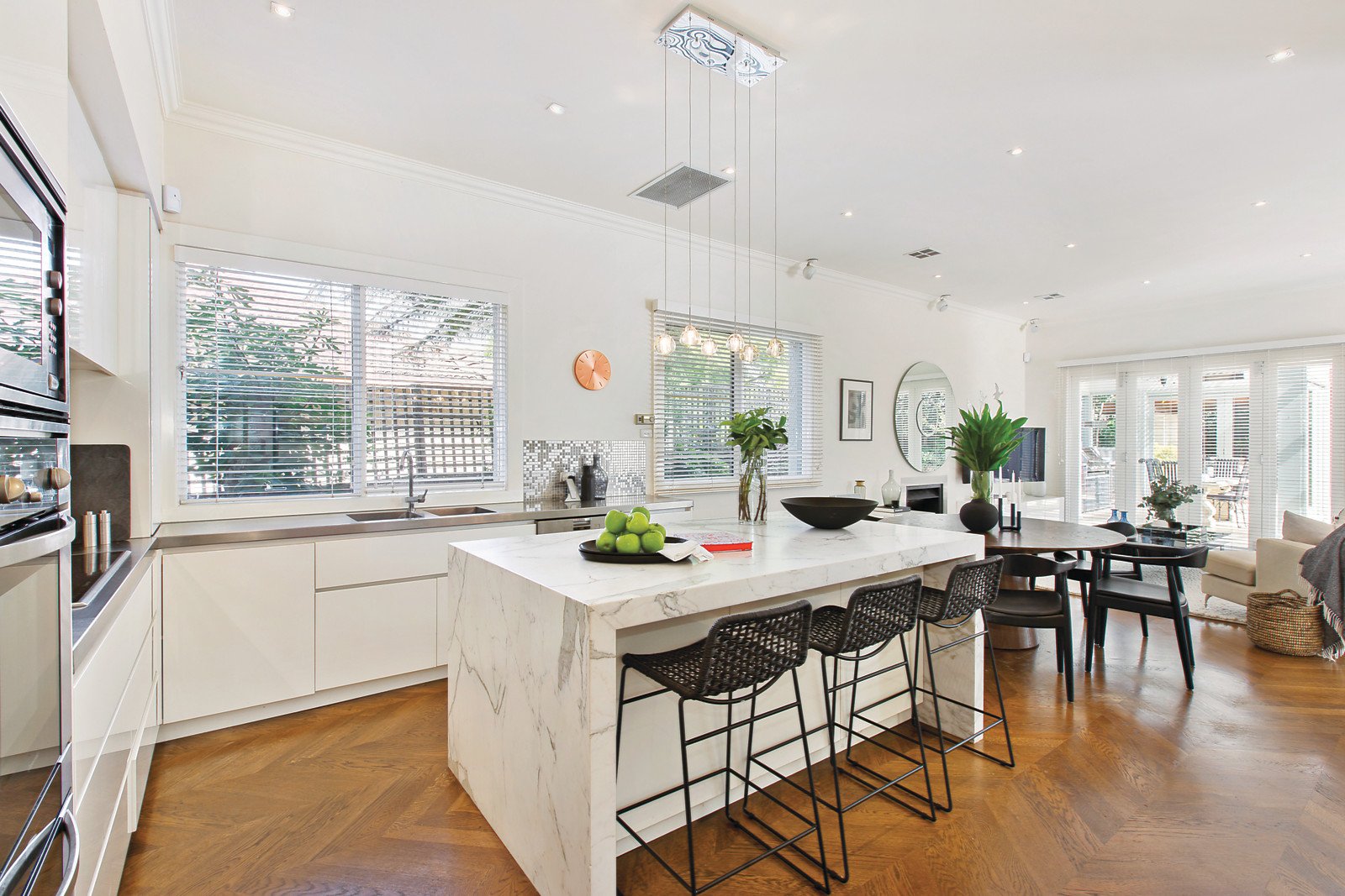 Effortlessly blending the charm of the 1920's and modern contemporary style, this beautiful 5 bedroom entertainer provides the ultimate family lifestyle and enviably positioned on a leafy garden allotment in the prestigious Golf Links Estate. The home is highlighted by a rendered and feature brick façade with coloured leadlight glass plus decorative ceilings typical of its era. The gracious interior features parquetry entrance hall leading to a formal sitting and dining room, four zoned bedrooms, main with WIR and ensuite/spa bath, two upstairs alongside a study/5th bedroom, home cinema with bar and a family bathroom. Downstairs also includes a bathroom, second large bedroom plus a generous family living and dining room with a kitchen equipped with Euro appliances, stainless steel and marble bench-tops and adjacent laundry; flowing to a brilliant covered outdoor dining and recreation domain, complete with heated pavilion, barbeque and outdoor kitchen overlooking a solar heated pool within a private garden. Other features include alarm, ducted heating, gas logFPs, workshop/gymnasium with R/C air conditioner and off-street parking.