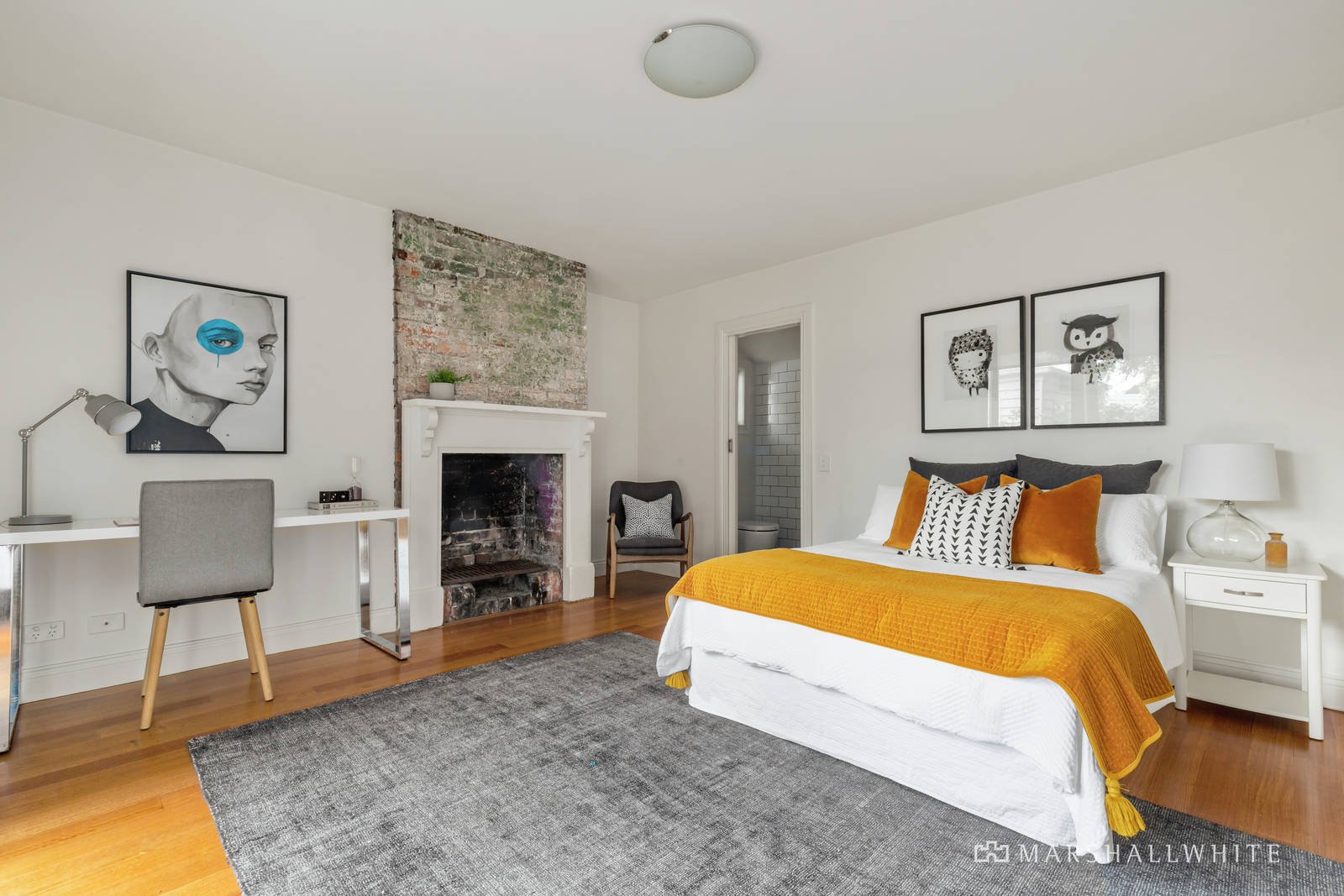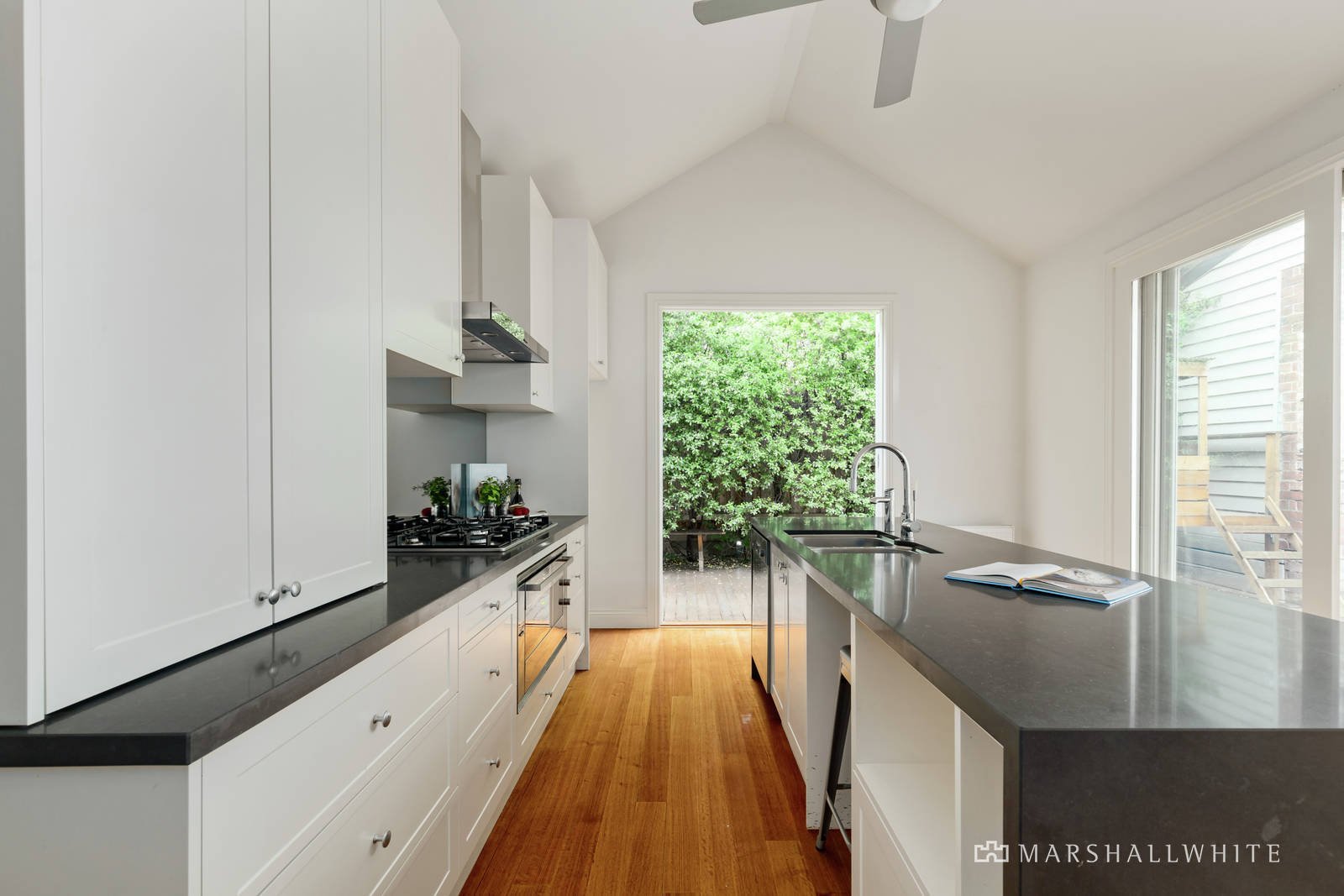 High ceilings and timber floors define the central hall introducing two double bedrooms with fireplaces and built in robes and a stylish bathroom. Beneath vaulted ceilings, the gourmet kitchen boasting Bosch appliances and stone benches and the generous open plan living and dining room open through stacking glass sliders to the private leafy northeast garden with a freestanding studio/home office, chic bathroom and an open fire, also ideal as guest accommodation.