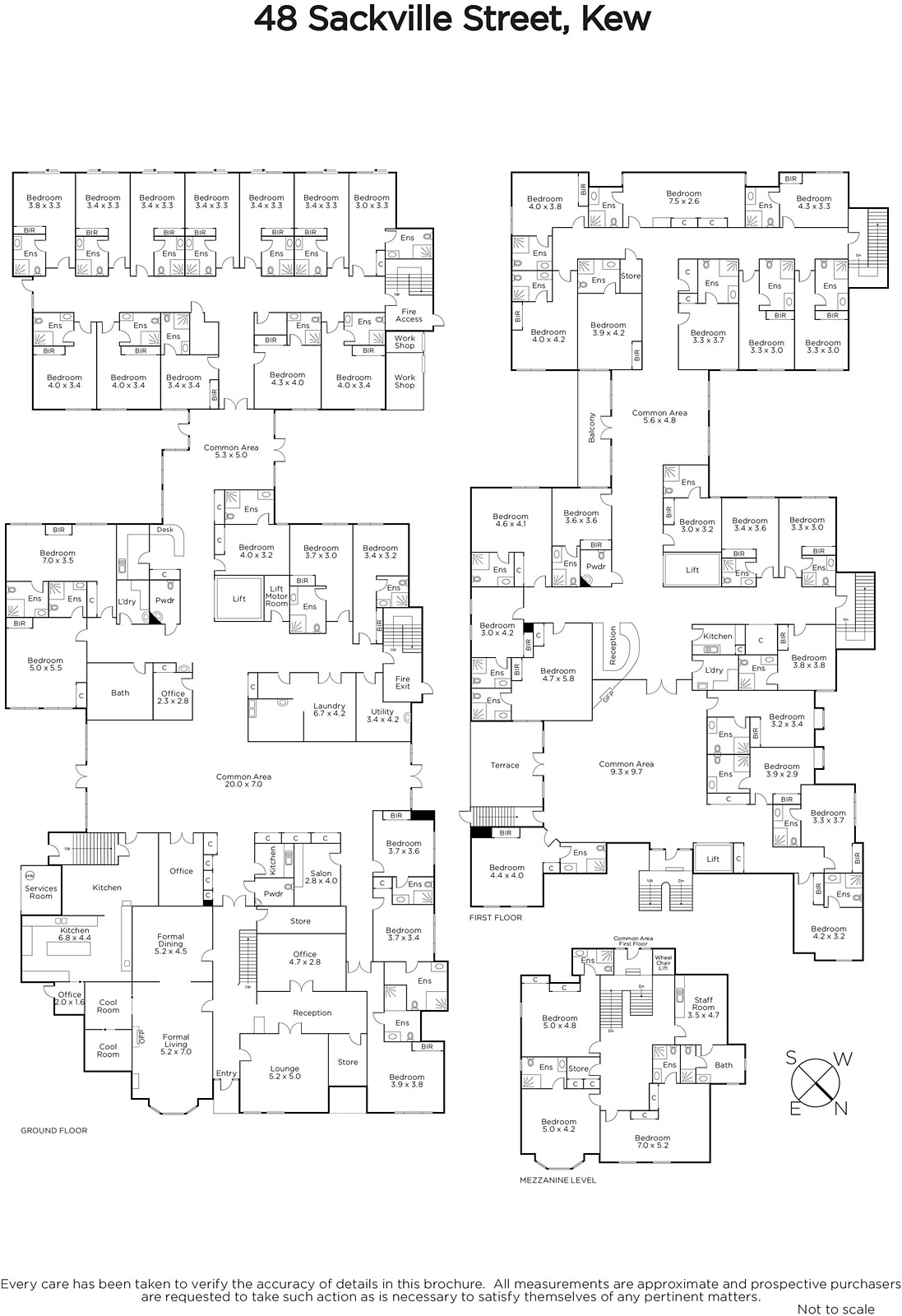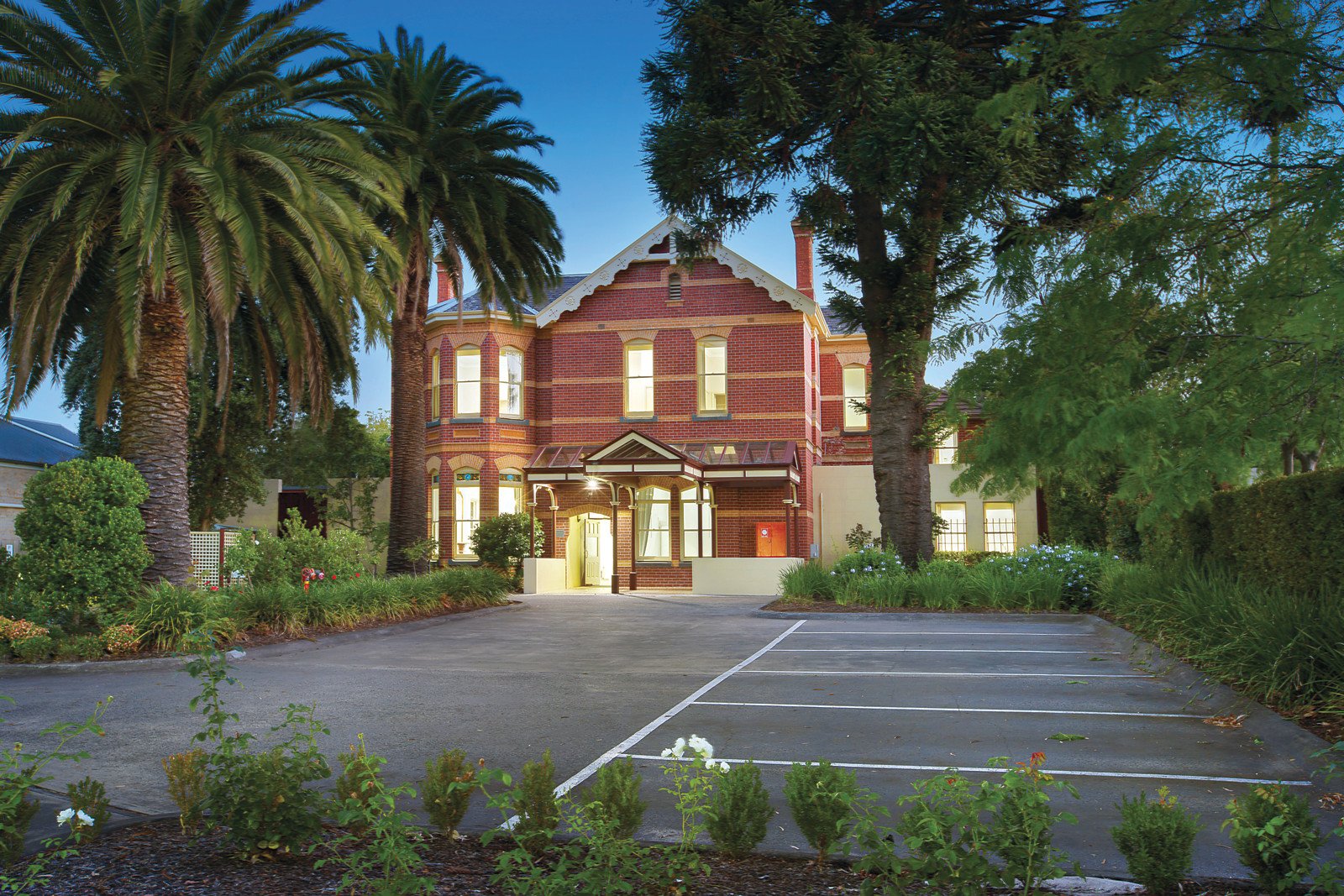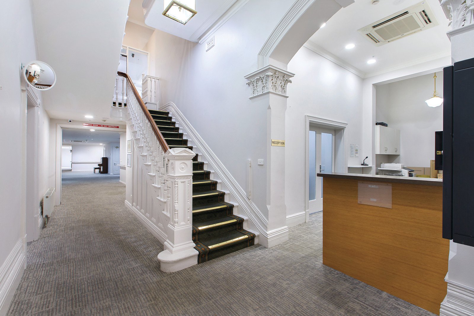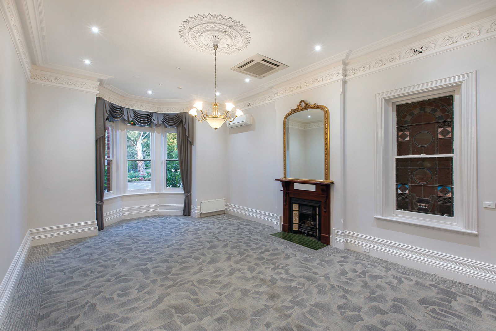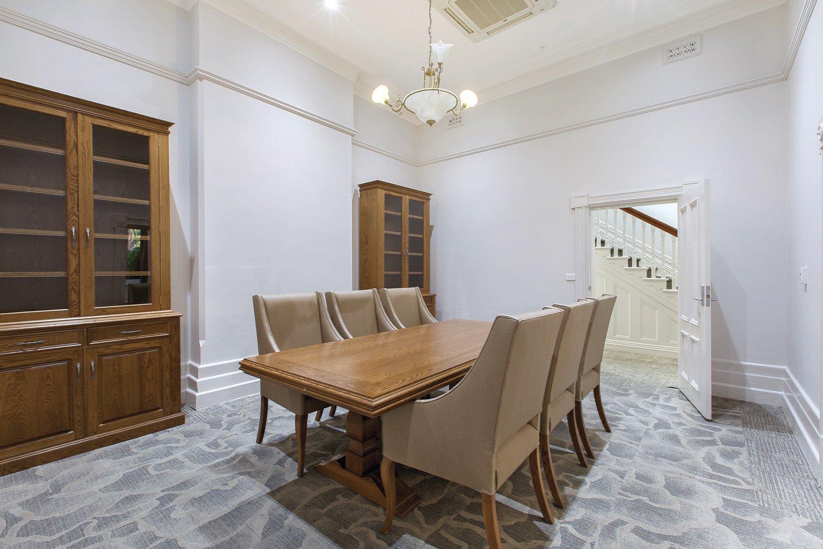Set behind a deep garden planted with Canary Island Date Palms, the heritage listed original residence retains its majestic elegance, grandeur and floorplan. A wide reception hall introduces three glorious reception rooms beneath soaring ornate ceilings and featuring intricate leadlight windows. Accessed by a stately staircase, the two levels of the original residence accommodate a variety of offices, meeting rooms, a commercial kitchen and laundry, residential rooms and assorted utility areas.