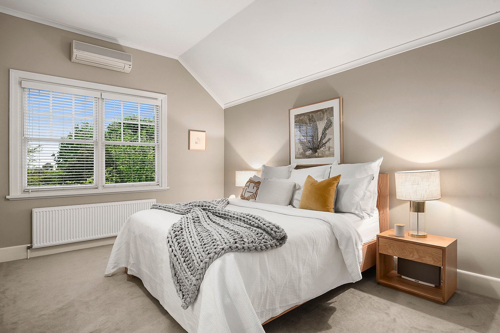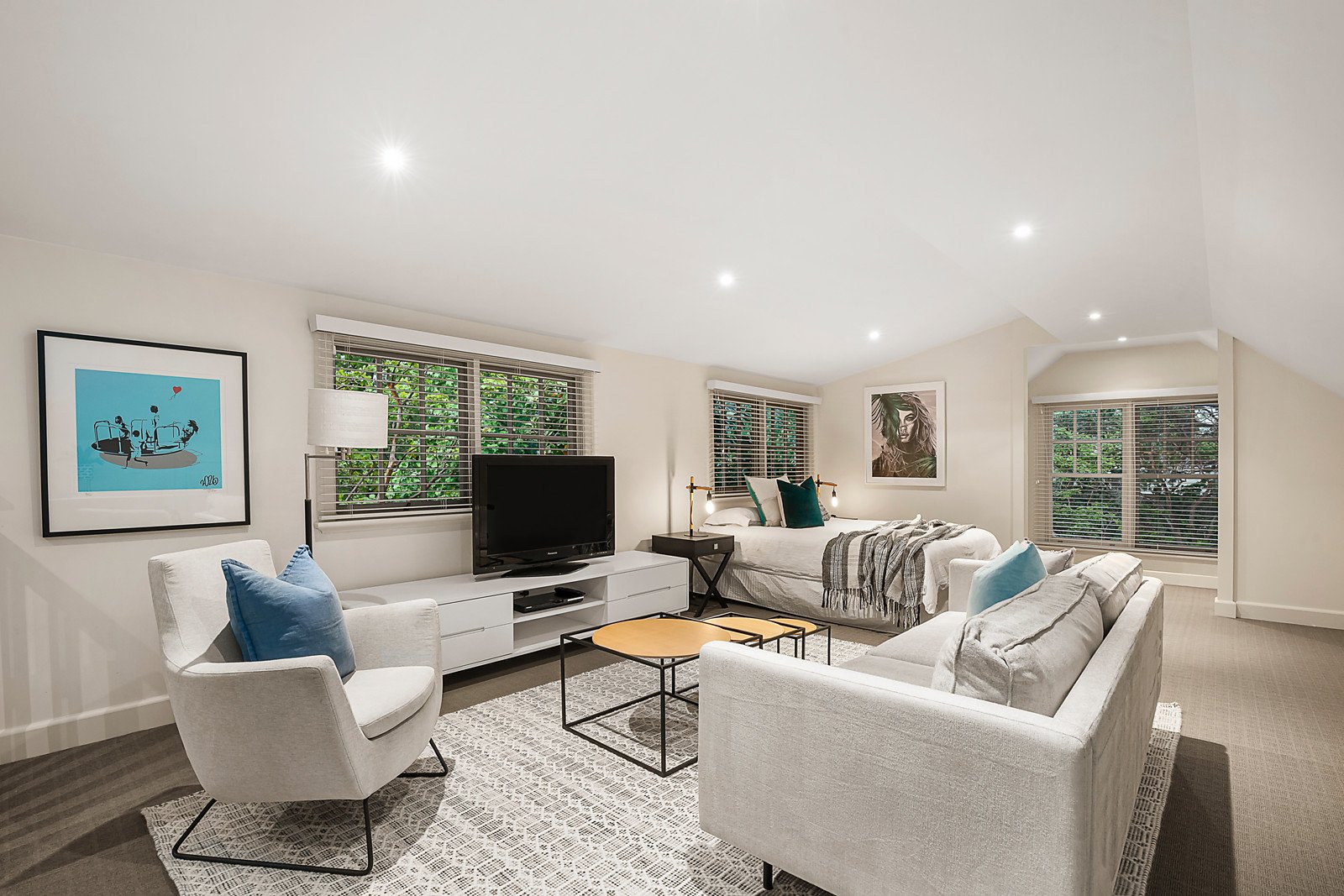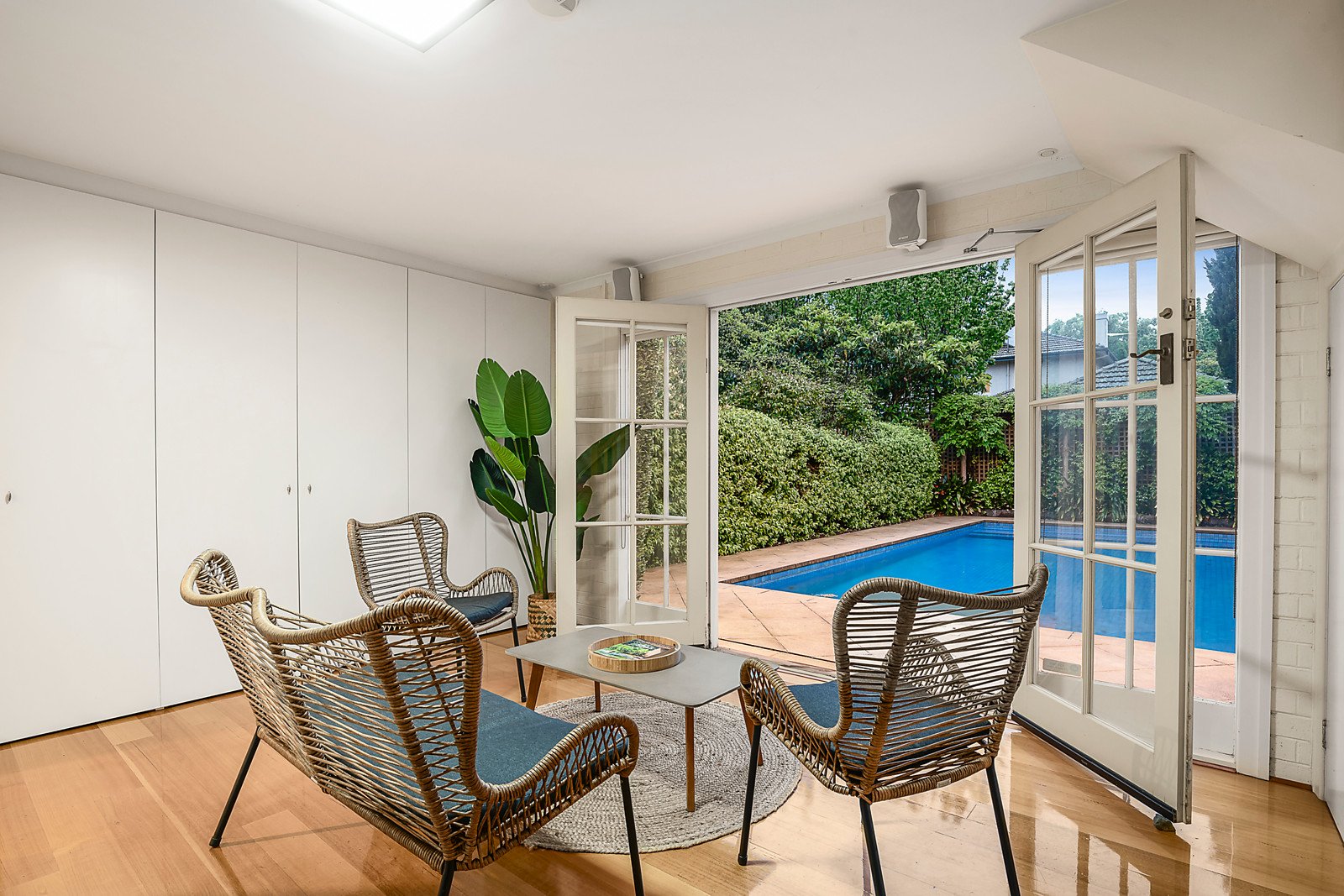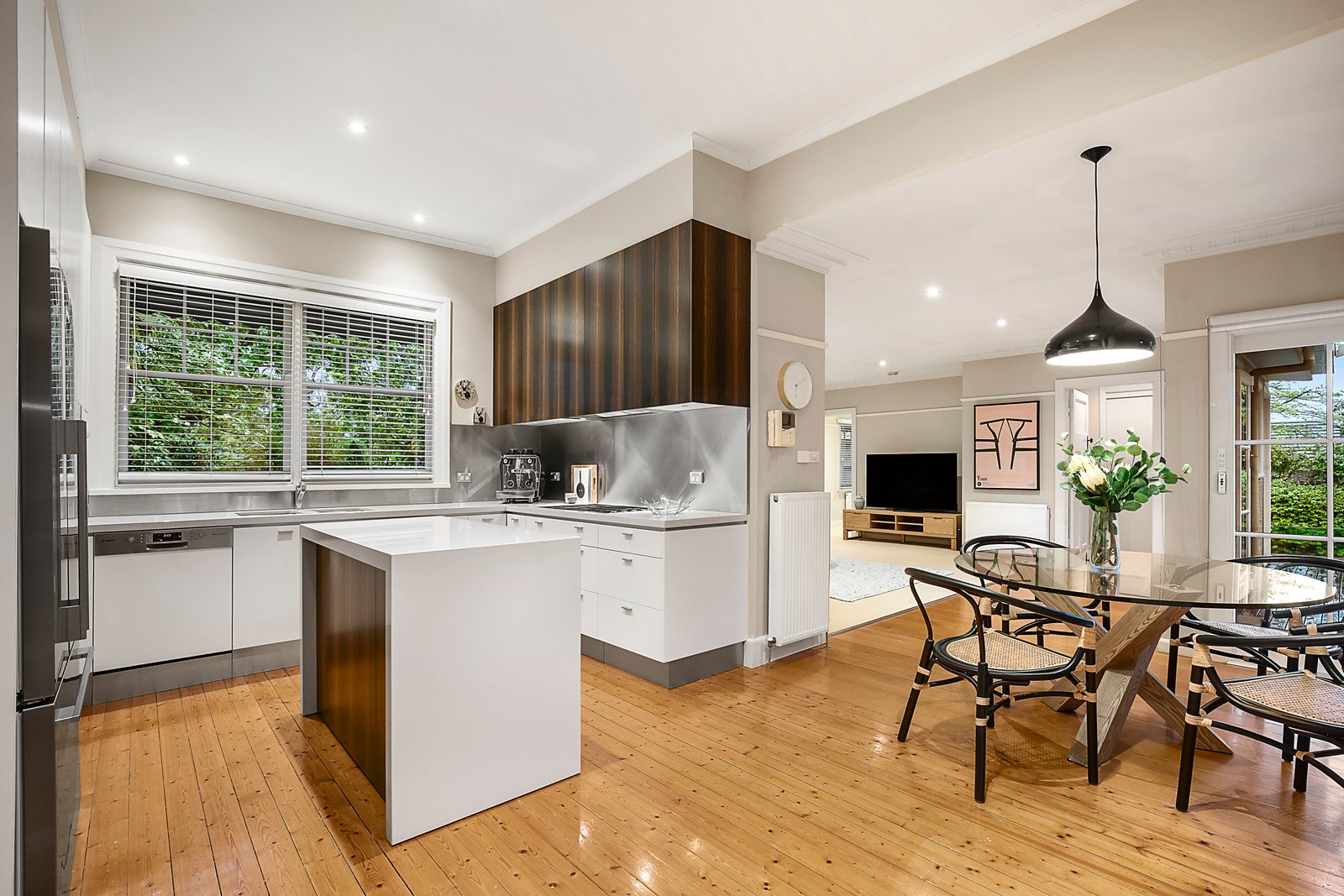 A magical entry beneath a magnificent Wisteria covered verandah sets the scene for an interior defined by period charm, contemporary style and superb proportions. Boasting Baltic pine floors, high ceilings and leadlight windows, the entrance foyer flows through to a spacious home office with gas fire and a glorious dining room, also with a gas fire, opening to a serene deep north-facing garden with an expansive entertaining terrace, perfect for afternoon drinks. A music room connects to the generous living room, family dining area and the sleek gourmet kitchen appointed with Bosch appliances and white stone benches. The living spaces open out to a picturesque solar-heated pool and large deck with outdoor heater and automated awning, ideal for year-round alfresco dining. An exceptionally spacious family room is also a sensational media room. An abundance of flexible accommodation comprises on the ground level a guest bedroom with robe and bathroom, while upstairs there are three additional bedrooms with robes, a study, stylish bathroom and the main bedroom with chic ensuite and walk in robe. A self-contained apartment with downstairs living or gym, bathroom and huge upstairs bedroom with an abundance of storage is attached to the double garage contribute fantastic flexibility as well as offering a second driveway for a boat/caravan.