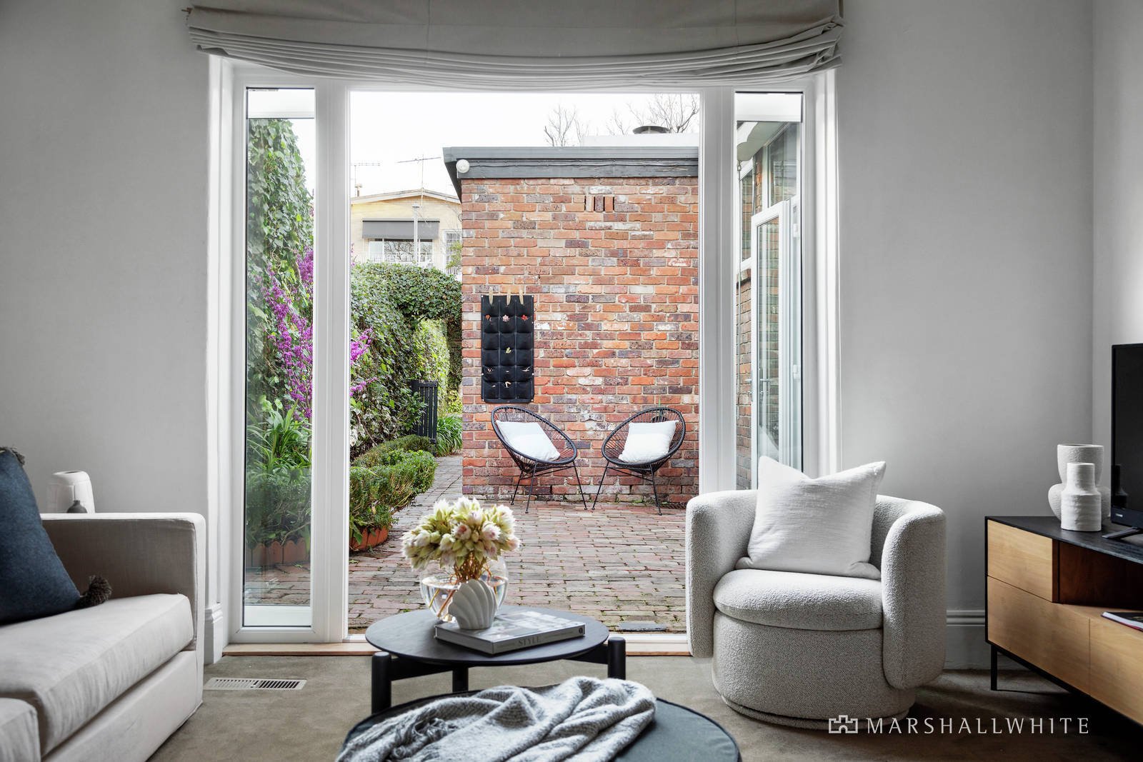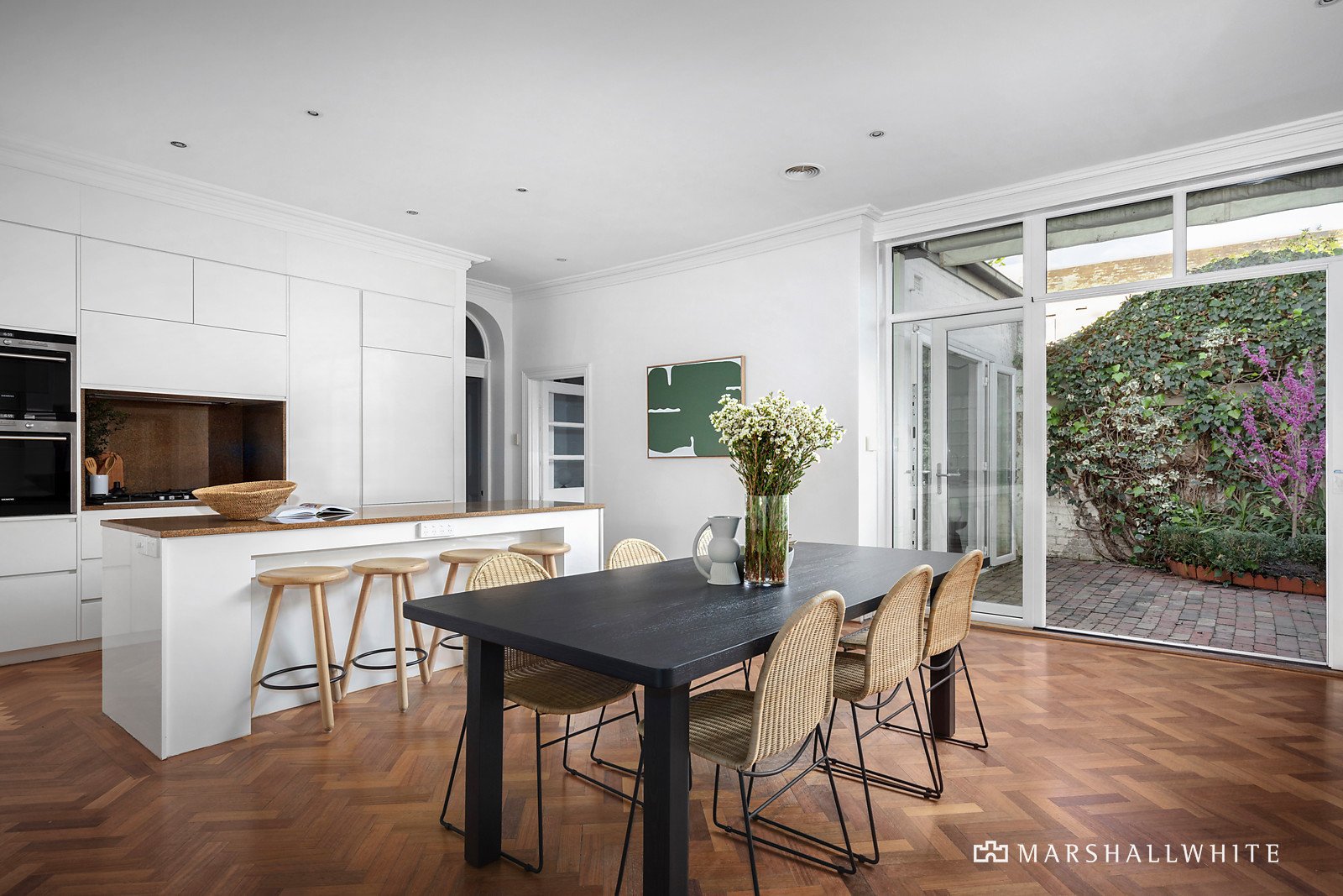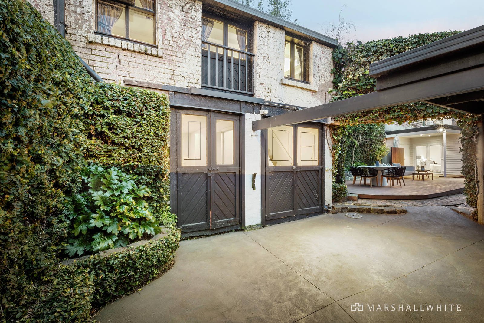 Behind a high walled sun-lit courtyard, an ornate oak front door reveals the central arched hallway, a refined executive study with a marble fireplace and the expansive sitting and living rooms with a marble fireplace. Parquetry floors flow through the sleek gourmet kitchen appointed with Siemens appliances, integrated fridge/freezer and stone benches and the spacious dining area opening through French doors to a private paved courtyard. The main bedroom with marble en suite/bathroom and walk in robe is set apart from two additional double bedrooms with robes, a study and second marble bathroom with separate powder-room. Surrounded by ivy covered walls, the tranquil rear garden with extensive decking is the perfect setting for outdoor entertaining and dining while a converted 2-storey stables provides convenient self-contained accommodation with a bedroom, bathroom/laundry, upstairs living and kitchenette. There are also 2 secure car spaces accessed via the side lane.