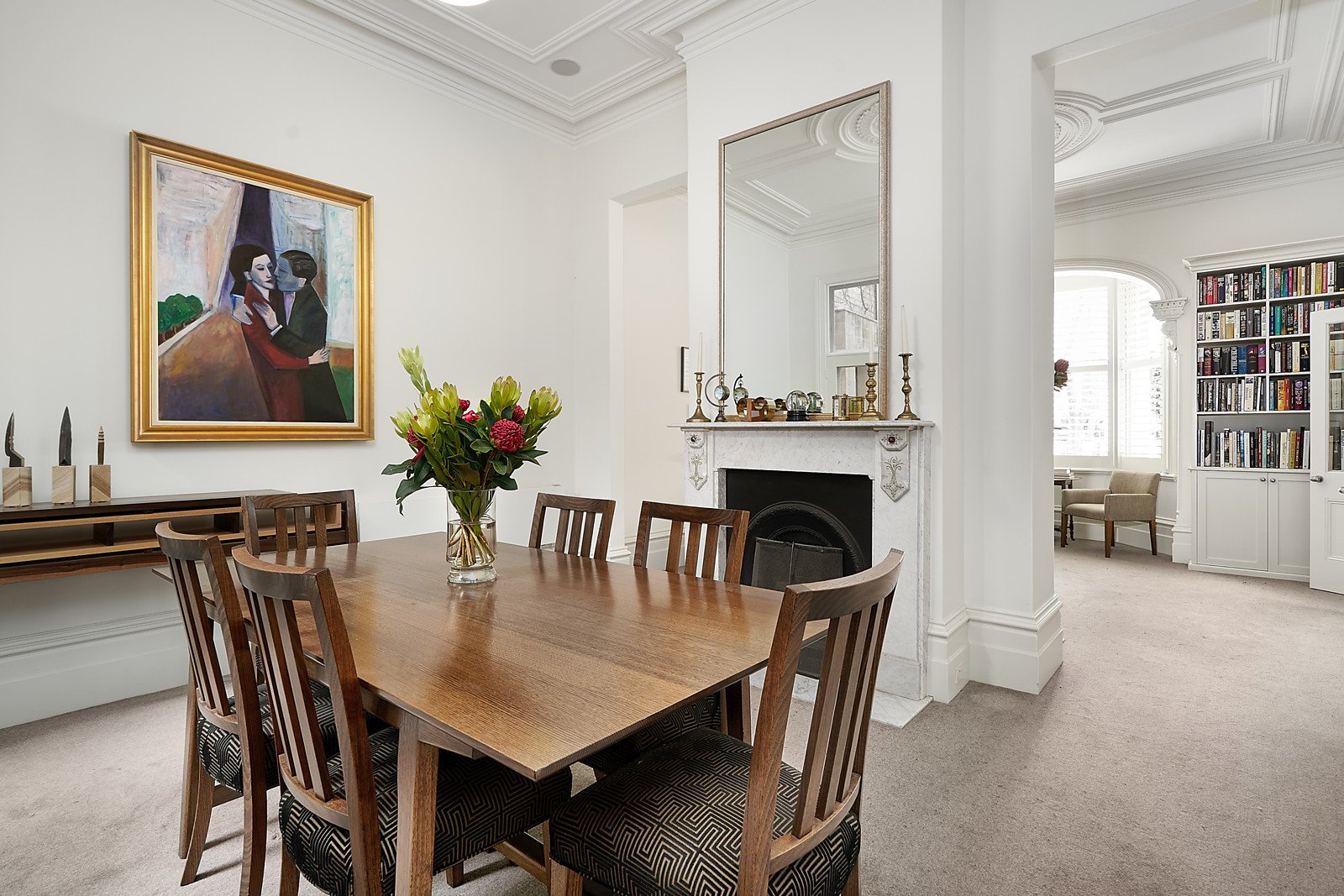 A welcoming arched hallway introduces a gracious sitting room with marble gas fire, ornate ceiling and bay window and an elegant formal dining room with marble fireplace overlooking a lush central lightwell. An architecturally stunning extension maximises the flow of natural light through the striking gourmet kitchen boasting ceramic benches, ample storage space and integrated fridge/freezer and the inviting living and dining room opening to a leafy landscaped paved courtyard. Upstairs, there are three double bedrooms with robes, two bright bathrooms, a balcony overlooking the park. On the level above, there is a 4th bedroom with built in robe and en suite and a large north-facing roof-top deck commanding panoramic views to the city.