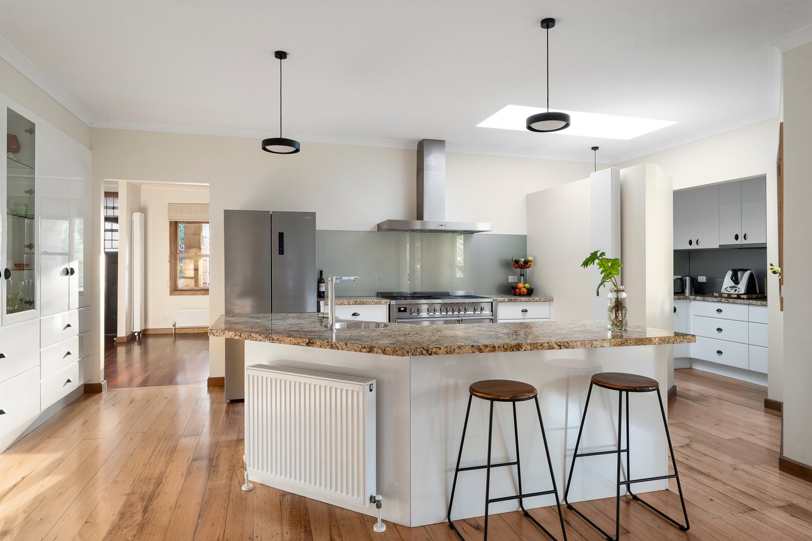A landmark Dandenong Ranges residence, crafted from solid limestone with five bedrooms and a clear entertainers’ spirit, this sweeping family home has been meticulously renovated with an eye for detail and a passion for natural materials. Set in pristine bushland and enriched by the use of recycled timber complemented by natural stone as it flows to a remarkable entertainers’ deck, the residence exudes a unique warmth and welcoming atmosphere while forming a perfect synergy with its environment and offering broad mountain views.