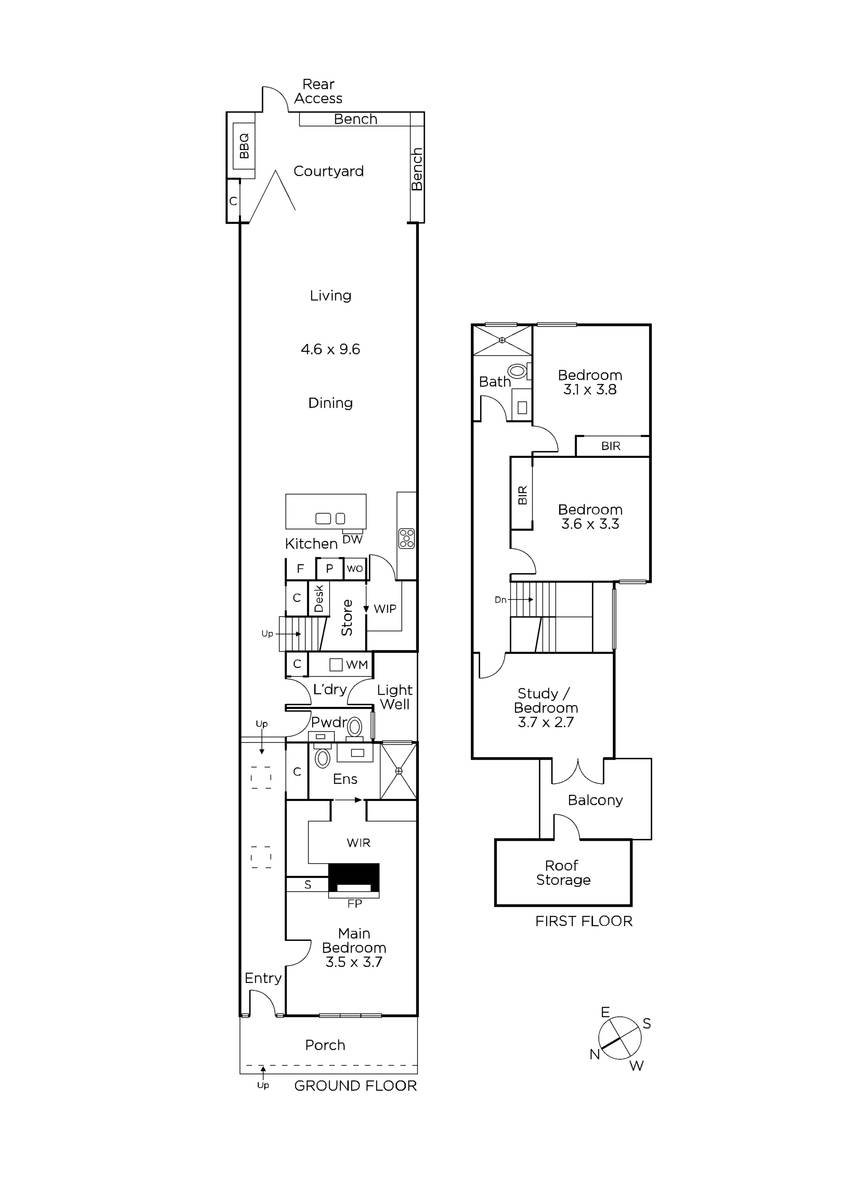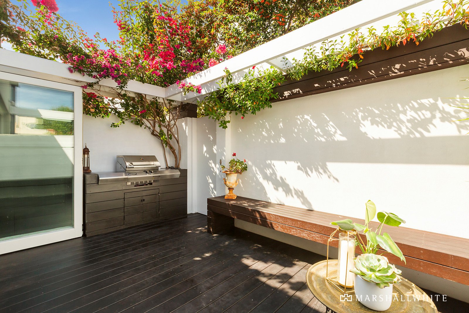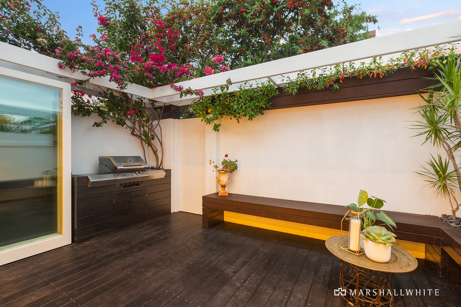 Richly hued hardwood floors and high ceilings define the sky lit arched hall and expansive open plan living and dining room with a sleek gourmet kitchen boasting Miele appliances, stone benches, butler's pantry and wine storage. The living area opens to a private decked courtyard with built in BBQ and seating, and gate to the pedestrian right of way. The sublime main bedroom with open fire, walk in robe and designer en suite is on the ground level while upstairs there are two additional bedrooms with built in robes, a stylish bathroom and home office or 4th bedroom accessing a sunny rooftop terrace.