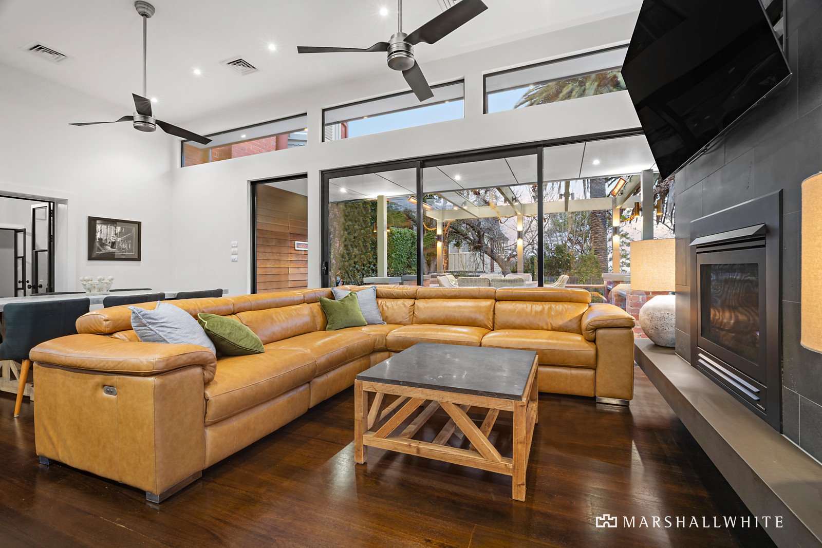 Overlooking the rear landscaped gardens and in-ground swimming pool/spa, is the glass-encased family living and culinary space, which opens via stacker sliding doors to an elevated alfresco dining deck beneath a vine-draped pergola. Defined by a lengthy island bench, the gleaming gourmet kitchen is appointed with Miele appliances including an induction cooktop and baker's oven, and the adjoining butler's pantry has plenty of storage and food prep space.