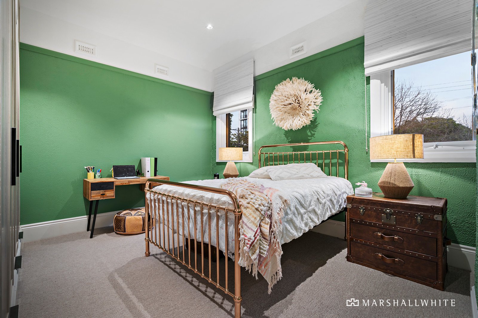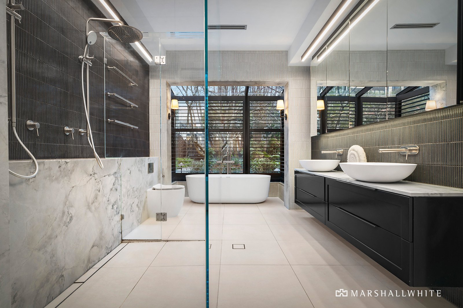 The opulent master bedroom, on the ground floor, is complemented by a luxe ensuite with a double walk-in shower backed by a wall of navy blue and white finger tiling, a twin marble-topped vanity, and a free-standing tub set in a fully glassed alcove lined with louvre shutters. On the upper level, resplendent with stucco walls and classic features, there are a further three fitted bedrooms including one with an ensuite, along with another luxe bathroom, and a beautifully fitted study with lovely tree-top views.