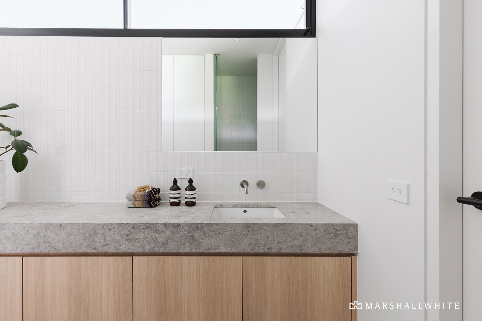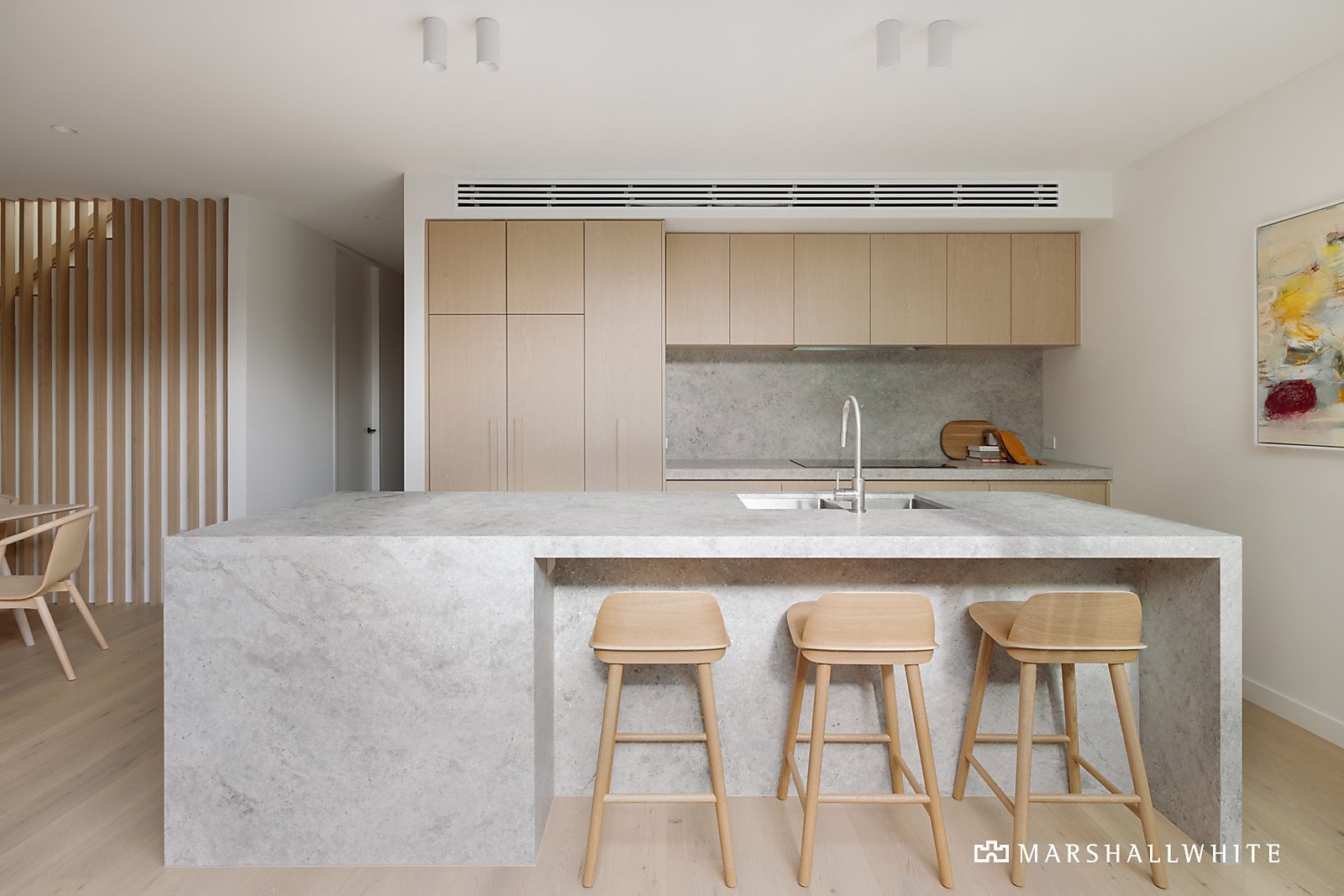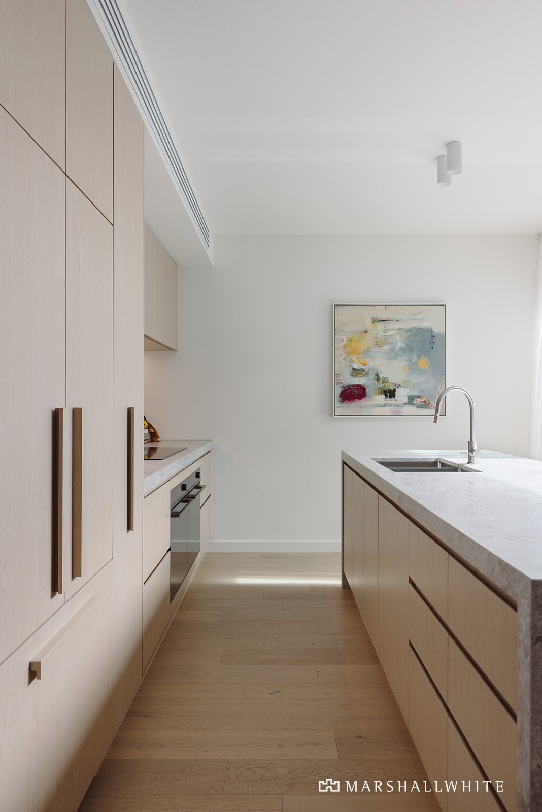 The exterior profile of slim-lined bricks and Eco charred timber makes an immediate impression matched inside by a warm palette of Woodcut oak floors, Tundra marble and blond timber joinery. The expansive open plan living and dining room and state of the art premium kitchen appointed with Tundra marble benches and integrated fridge/freezer open through corner sliders to a private landscaped west-facing courtyard with limestone paved terrace. A double bedroom and stylish bathroom are conveniently positioned on the ground level while upstairs beneath soaring raked ceilings there is the beautiful main bedroom with bespoke robes and lavish en suite with X-Bond walls, a third double bedroom with robes and designer en suite and a retreat.