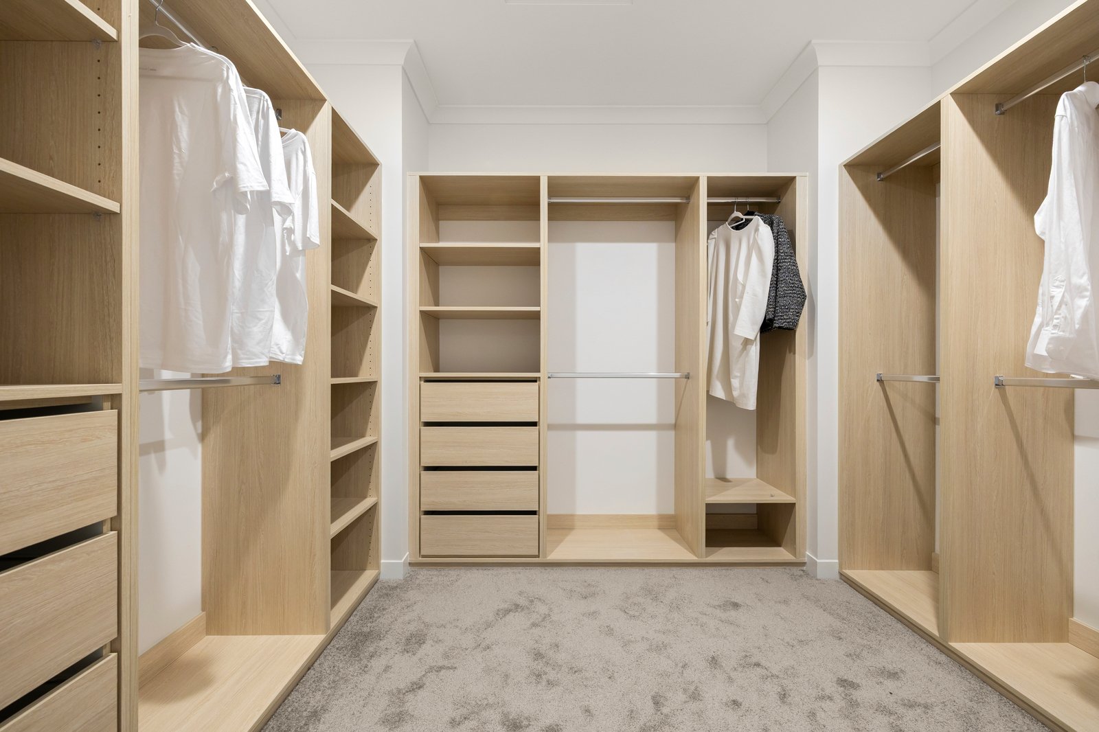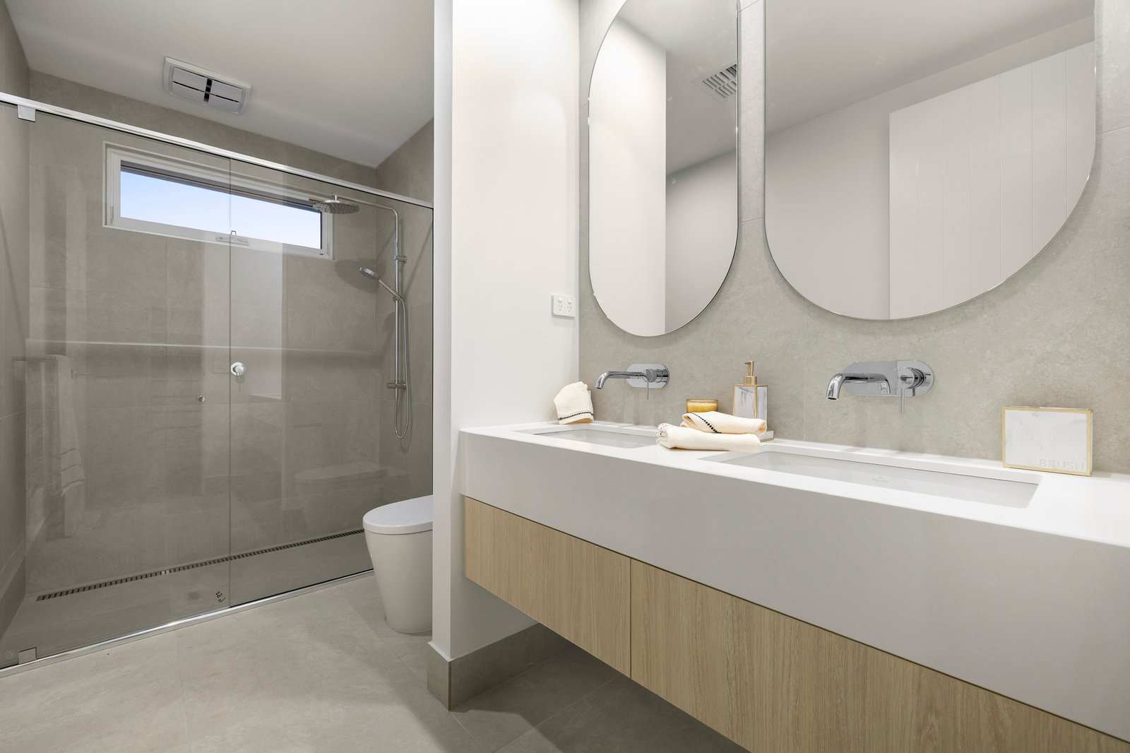 Centrally positioned, the gourmet kitchen has a large stone-topped island bench and is equipped with top-of-range Bosch appliances including an induction cooktop, 900mm pyrolytic oven and a semi-integrated dishwasher, while the adjoining butler’s pantry/laundry adds to the amenity. Having access to a dual-entry bathroom, the light-filled lower level bedroom with built-in robes could also function as a second master for single-level living, or as a study or second living space. A custom oak staircase connects to the equally well-proportioned upper level where a curved wall enhances the architectural style, and two front-facing bedrooms with built-in robes have northerly treetop outlooks across the leafy neighbourhood. The indulgently appointed main bathroom has a deep built-in tub and walk-in dual head shower, while the lavish main bedroom suite has a large walk-in robe/dressing room, (with space for a central island), and a luxe shower ensuite with twin stone-topped vanities and a dual-head walk-in shower.