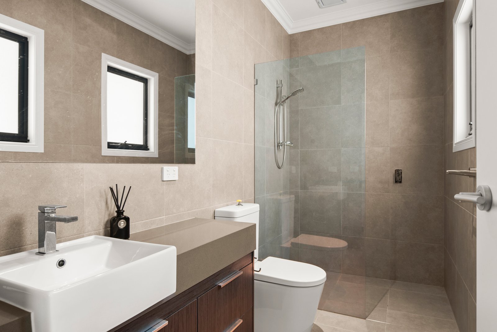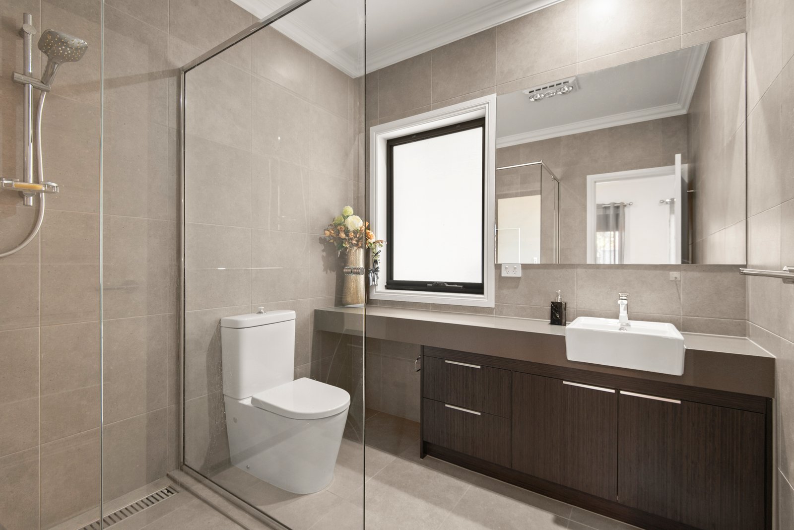 The main bedroom is a spacious parental sanctuary, set upstairs with an impressive wall of built-in robes and its own fully-tiled ensuite, whilst downstairs, a guest bedroom is similarly appointed with built-in robes and another ensuite. Further highlights of this impeccably crafted home include a double lock-up garage, a third bathroom set upstairs, a powder room and a laundry, as well as full double glazing, ducted vacuum, a security alarm and reverse cycle heating / air conditioning.