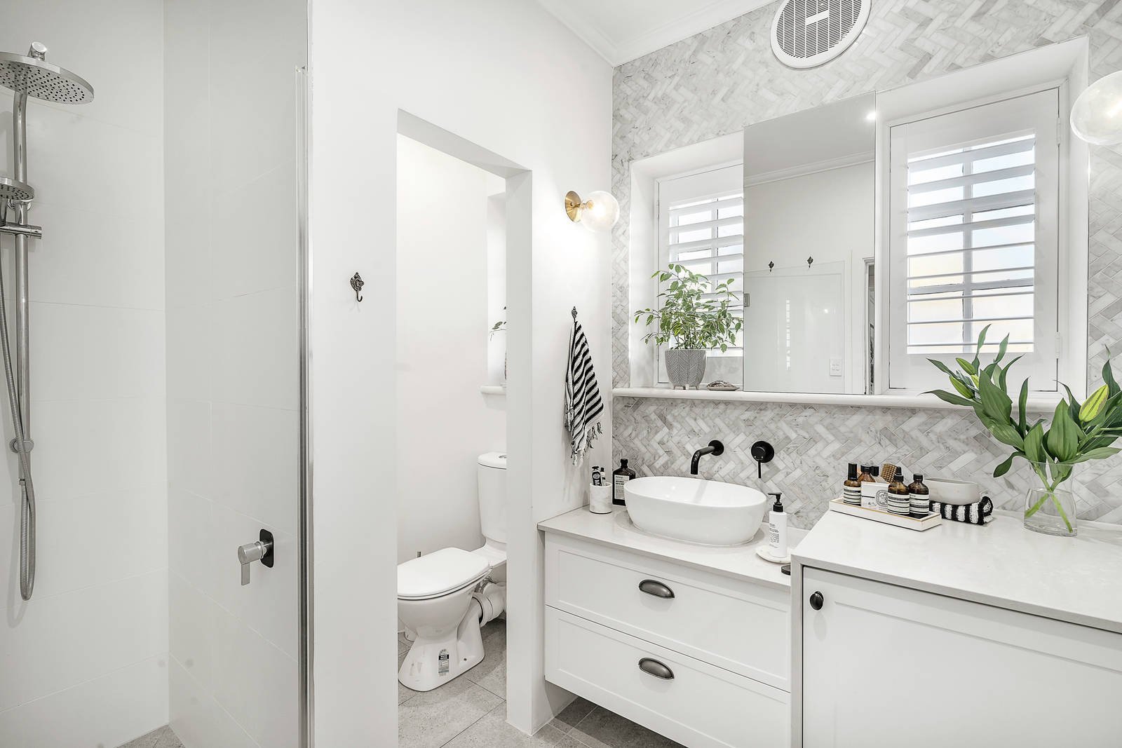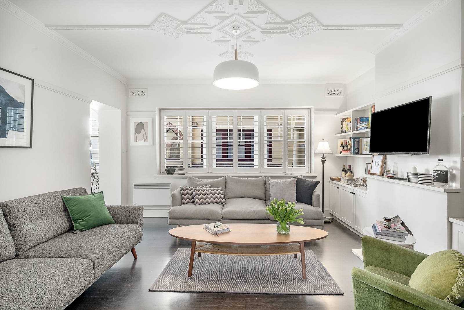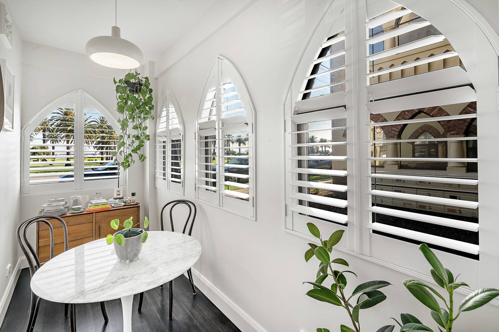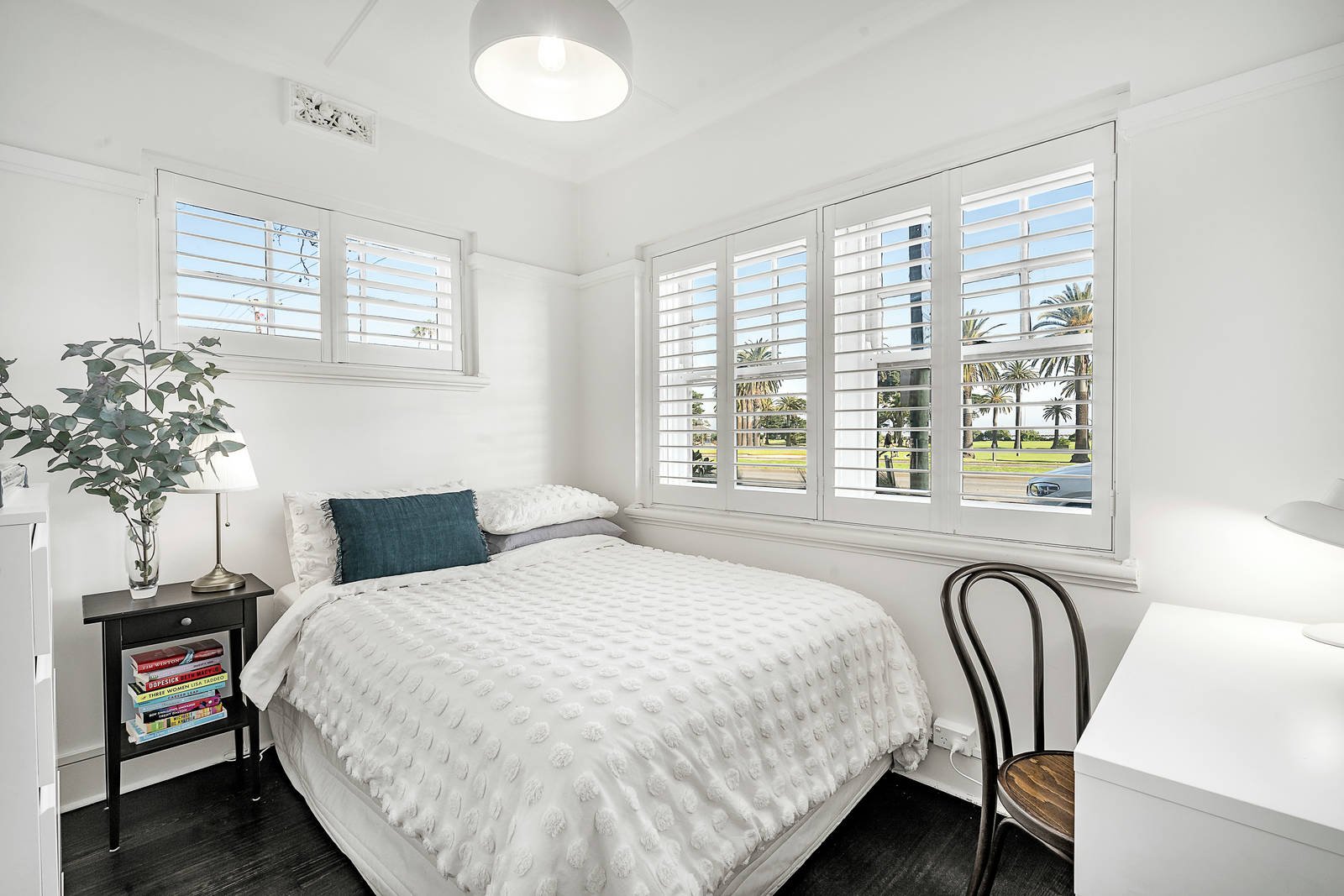 A vivid white colour palette complements modern plantation shutters and dark timber flooring in a contemporary renovation that has faithfully preserved the home's defining arched windows, detailed ceiling roses and fine Deco charms. With Bosch appliances and Caesarstone bench tops, the kitchen is the epitome of timeless style as it flows easily to a lounge room with a traditional fireplace and to a semi-attached dining/home office that reveals a brilliant waterfront perspective. Accessed securely by intercom entry, the home also features a central bathroom, substantial built-in robes in the main bedroom, wall panel heating and a rooftop terrace that is available for communal entertaining with brilliant bay views.