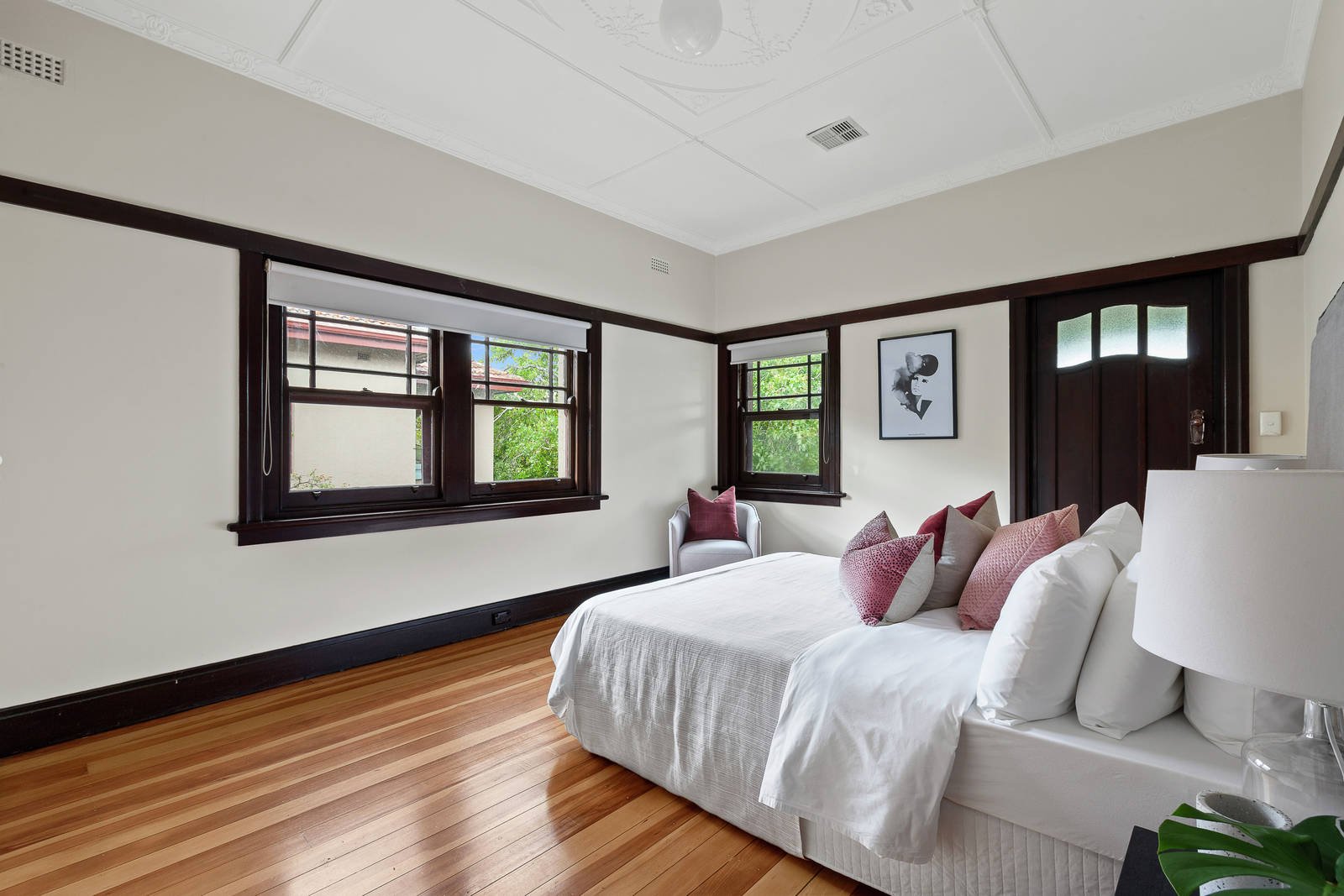 Under ornately detailed ceilings and with polished timber under foot, the home is enriched by dark timber internal doors, skirtings and picture rails as a large kitchen is semi-attached to dining and in-turn to an ambient lounge room in which the original brick fire place is framed by beautiful, recessed, Art Deco cabinetry. Well-removed from living, the bedrooms are each generously sized with large built-in robes and access to a balcony, whilst added features include secure intercom entry, a substantial bathroom, laundry, central heating and, of course, the garage.