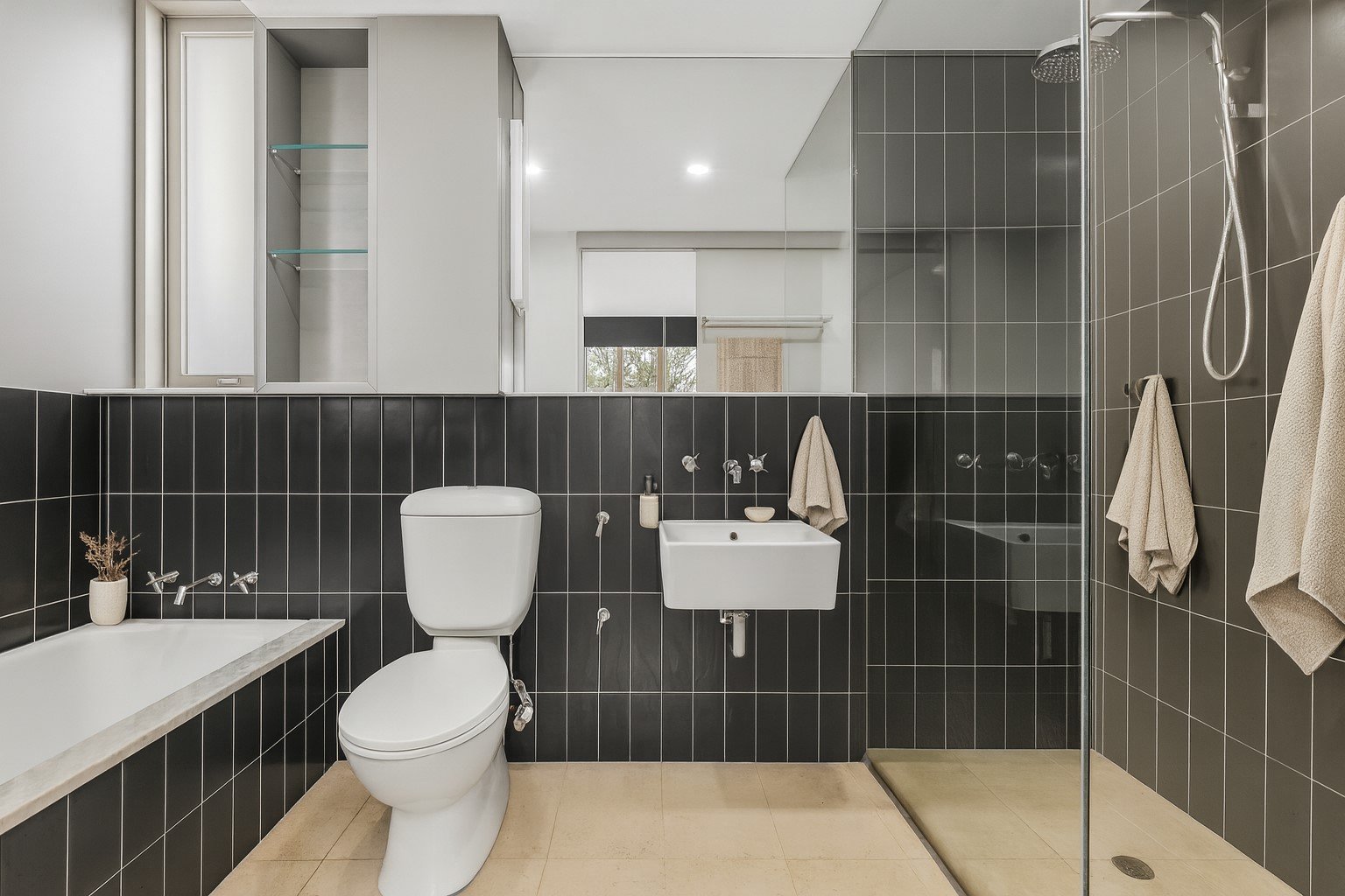 Upstairs, a thoughtfully designed offering three bedrooms (third bedroom is well suited as a home office of nursery) while the other two generously sized bedrooms are complimented with built-in robes and provide peaceful accommodation. The central bathroom is stylishly finished with floor-to-ceiling tiling, a separate shower and bath, and enjoys direct ensuite access from the main bedroom for added privacy and convenience.