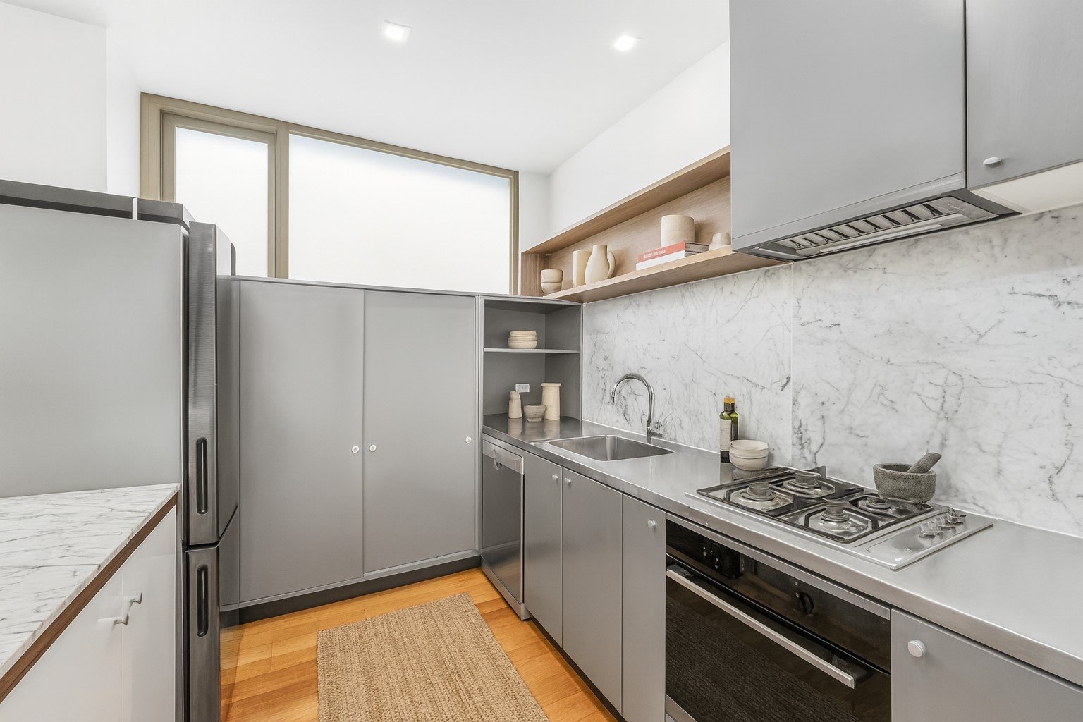 At the heart of the home, the sleek kitchen is beautifully appointed with a Carrera marble splashback, quality stainless steel appliances including a Smeg dishwasher, and a convenient breakfast bar that blends practicality with contemporary style.