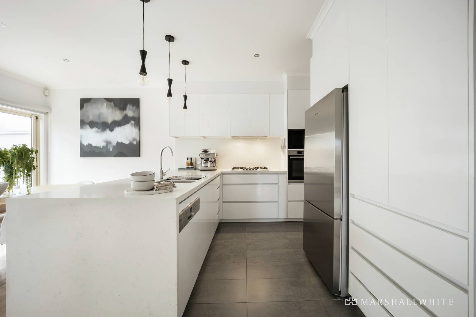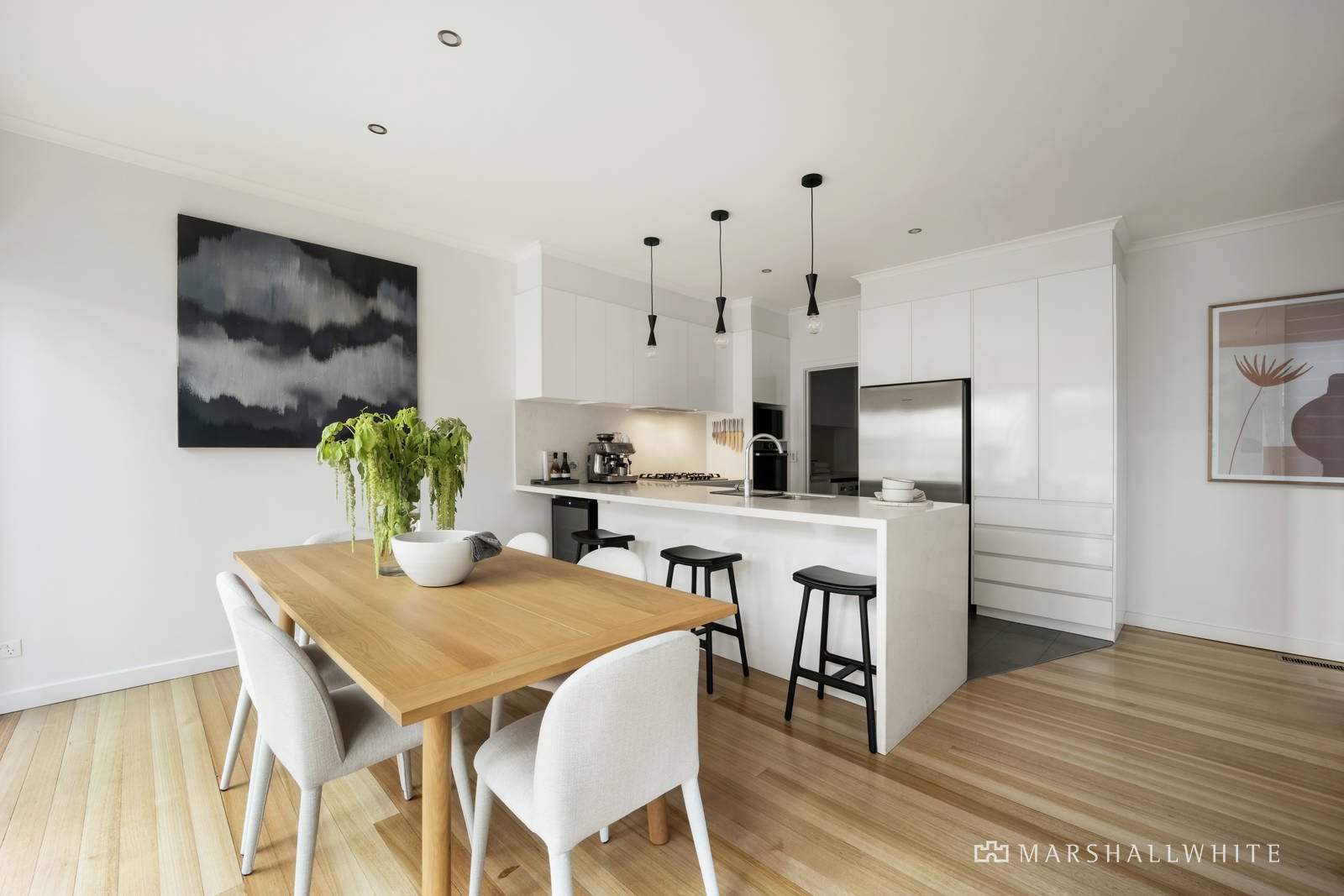 Behind a private northwest garden, timber floors flow through the entrance hall to a light-filled and generously proportioned living room, inviting dining area and a gourmet kitchen boasting stone benches and Bosch appliances. The living areas spill out to a large covered decked al fresco dining space with heaters and fan, ideal for year-round outdoor entertaining. Upstairs, the main bedroom with double glazed windows and a chic en suite and walk in robe is complemented by two additional bedrooms and a stylish bathroom.