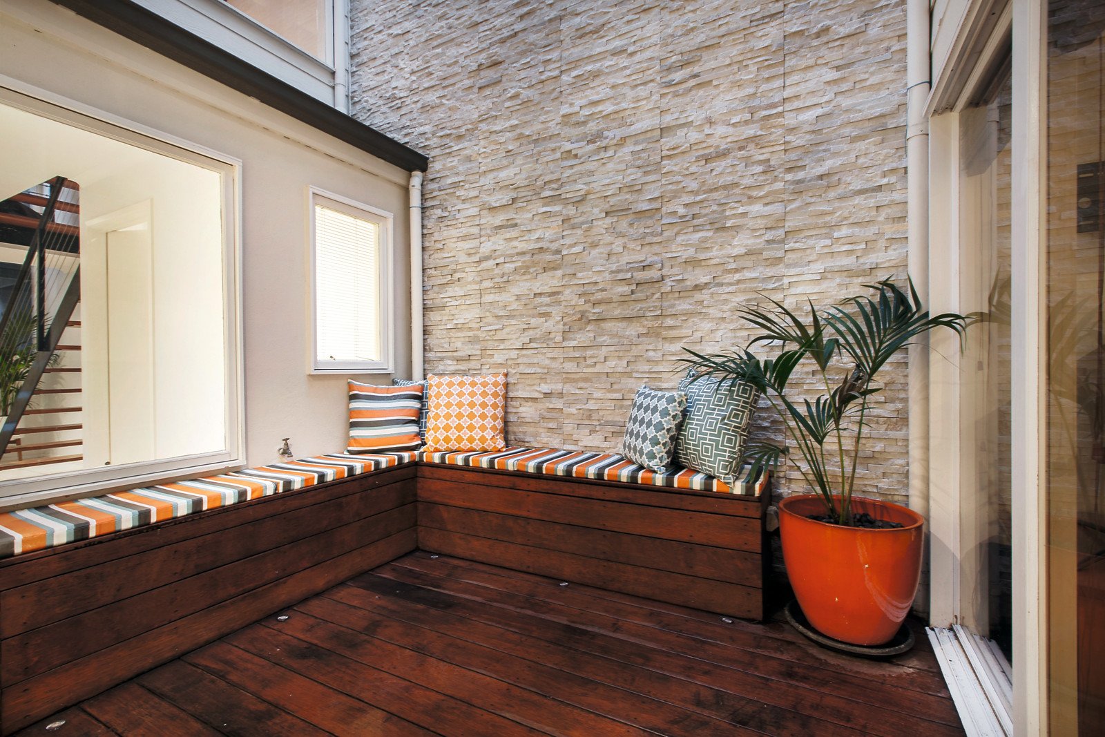 Timber stairs lead up to the impressively spacious living and dining zones on either side of a state of the art Bosch kitchen boasting stone benches and opening out to a west-facing balcony. Two bright double fitted bedrooms on the level above are complemented by a study area and designer bathroom, while on the ground level a spacious third bedroom features a walk in robe, semi en-suite and internal decked courtyard.