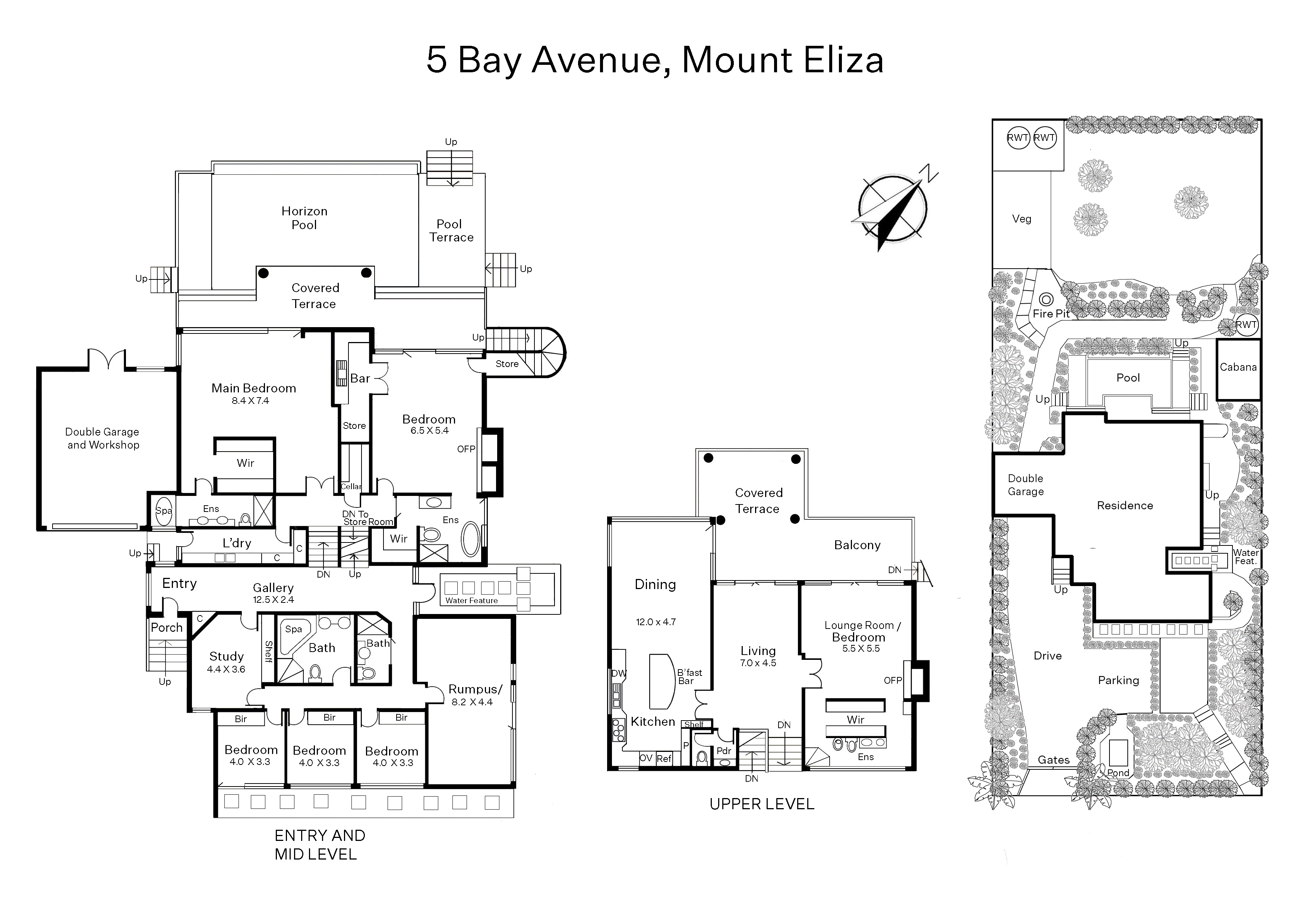 Commanding panoramic water views, the upper-level spaces include an undercover alfresco terrace, living and dining areas, a gourmet stone kitchen with all Miele appliances including an induction cooktop and double ovens, and a guest bedroom suite with wood fireplace (or additional living/entertaining or home office space). With connectivity to the poolside terrace, an expansive lower-level entertaining room, gym, or additional bedroom suite has a built-in wet bar, gas logfire heater, and bathroom, while there are another three fitted bedrooms, all with lovely garden outlooks, an executive study, plus a large rumpus room, that could also serve as a bedroom.