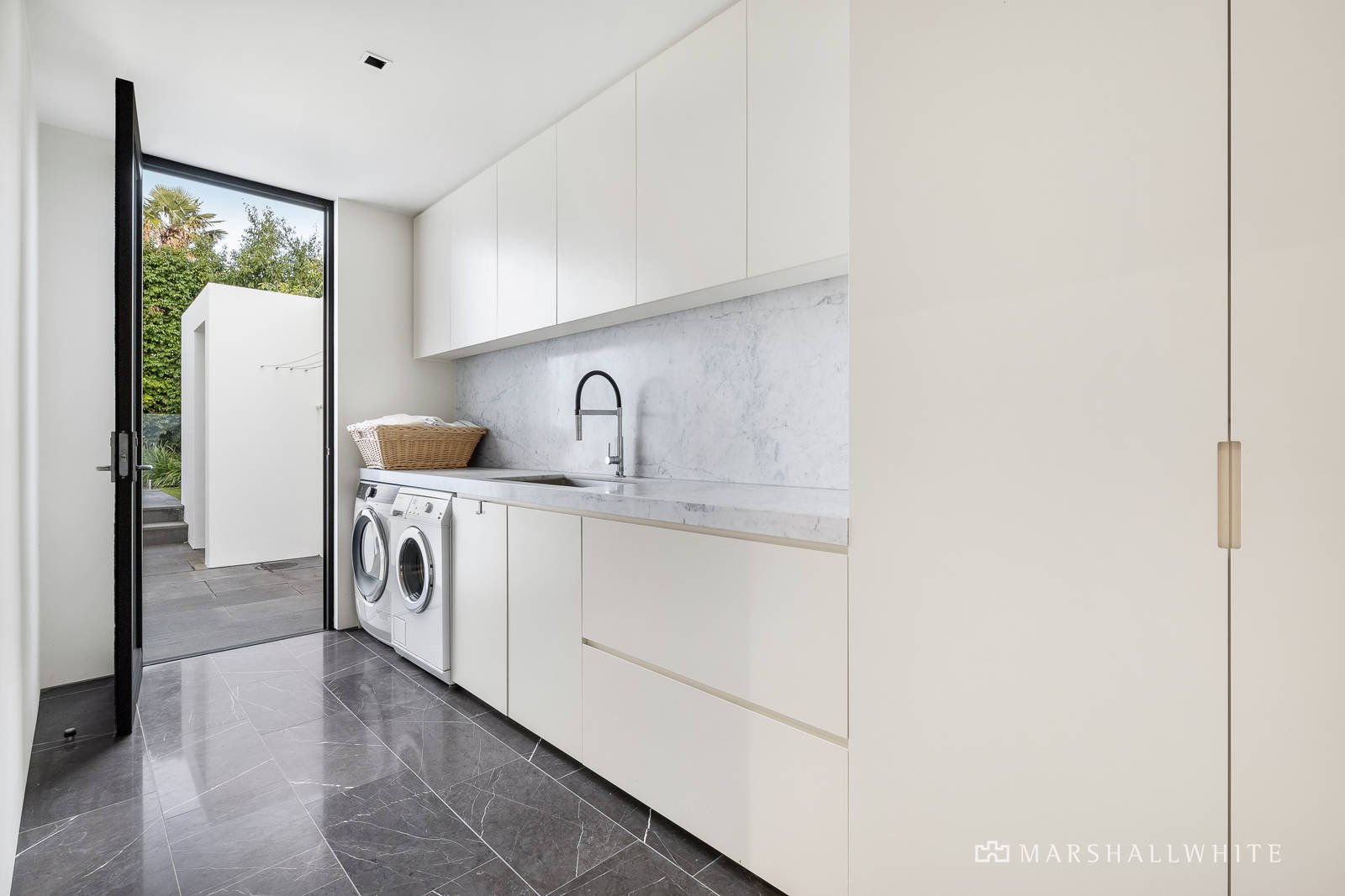 Highlighting an extensive use of the very finest Travertine Marble and with rich American Oak underfoot, the home's heart is an open-plan kitchen/dining/living in which a vast island bench is both a showpiece and an inviting gathering place, all overlooking a kitchen where Miele appliances are tastefully complemented by soft close cabinetry and a sleek undermount sink. Floor-to-ceiling glass sliding doors connect seamlessly to paved outdoor living and a solar-heated in-ground swimming pool with non-salt (non-staining) mineral chlorination, whilst a separate lounge offers a valuable sense of sanctuary.