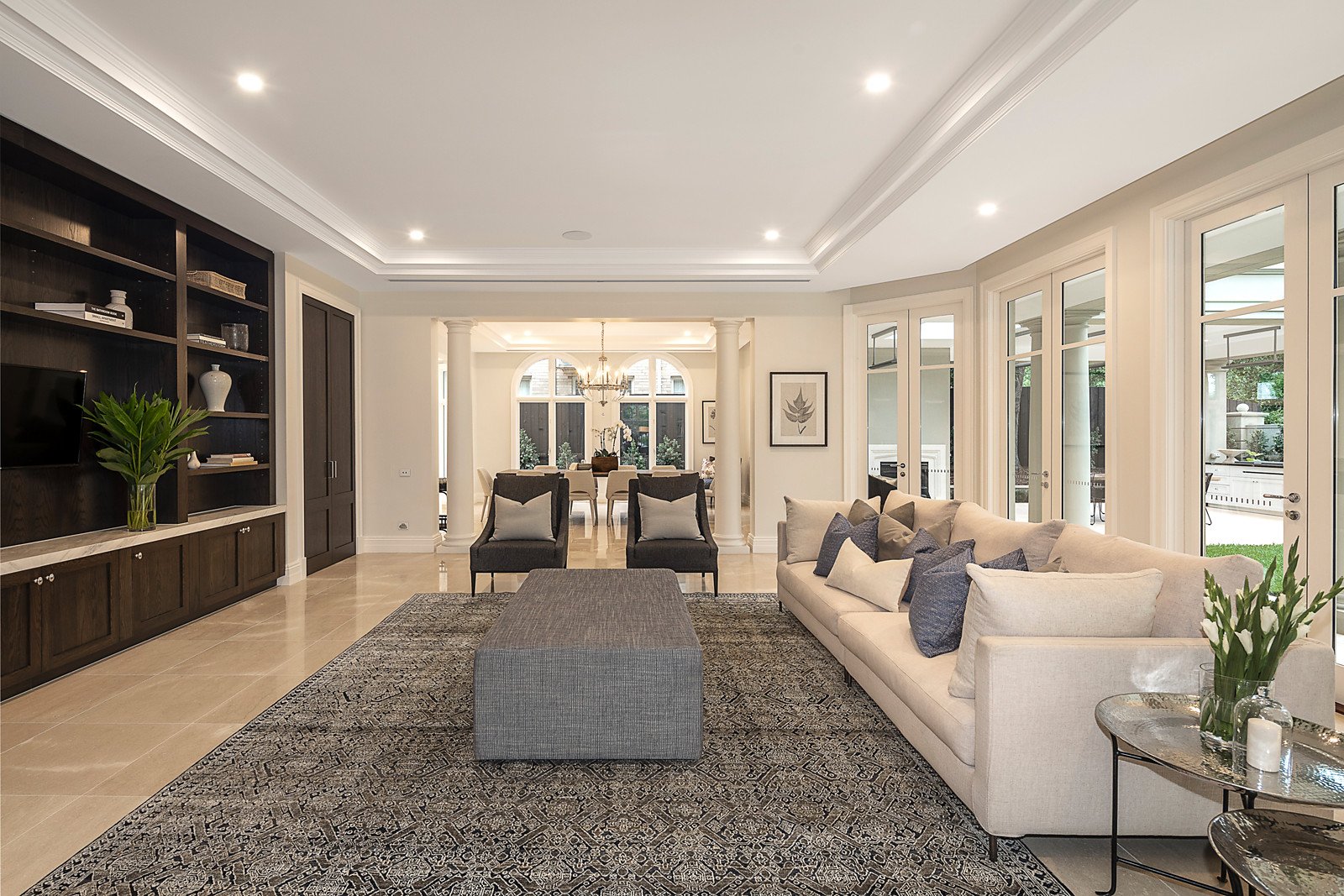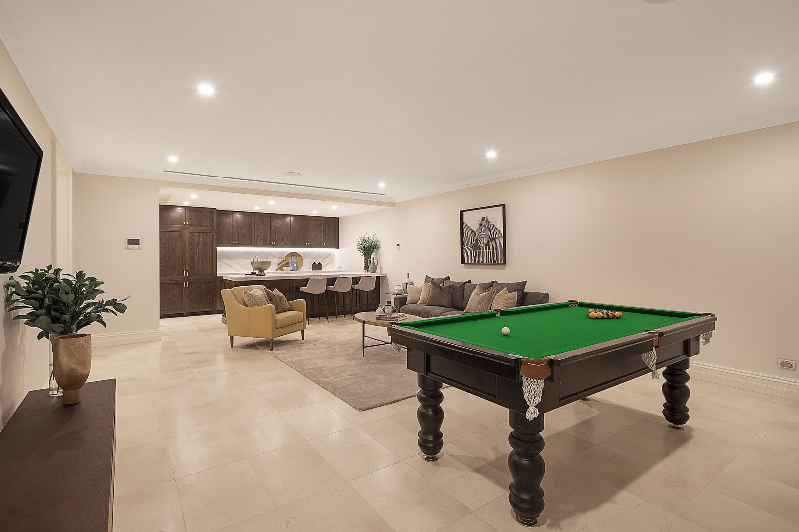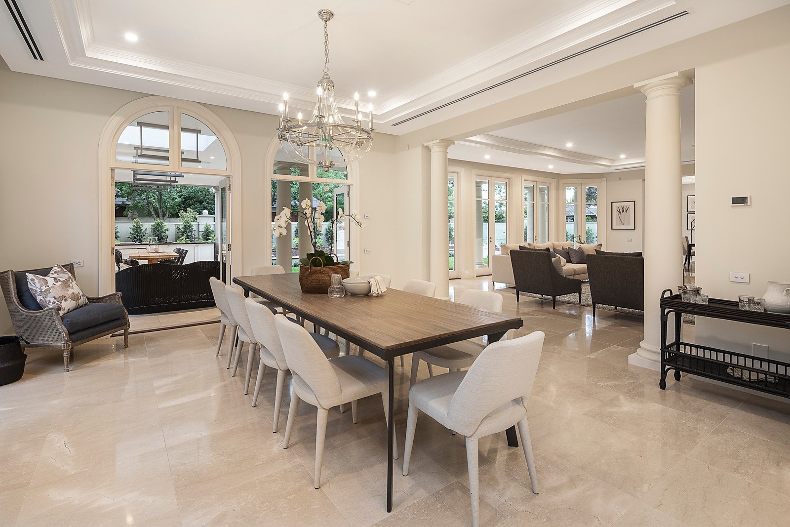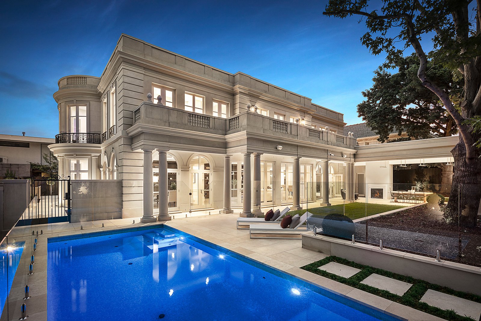 The palatial reception hall boasting a soaring double height coffered ceiling, limestone floors and an Italian chandelier creates an unforgettable first impression. Majestically proportioned and ideal for entertaining on a lavish scale, the sumptuous formal sitting and dining rooms with gas fireplace flow out to a landscaped limestone terrace. On the north-side of the hall, a refined fitted library, expansive living room and glorious dining area open to the stunning north-facing landscaped garden with a premium solar-heated pool and wonderful al fresco terrace complete with BBQ kitchen, gas fireplace, outdoor heaters and powder-room. A triumph of form and function, the sublime kitchen is appointed with Calacatta marble benches, top of the range Miele appliances, integrated fridge/freezers and a full butler's pantry. A seductively curved staircase featuring customized wrought ironwork and a lift ascend to the accommodation level comprising the opulent main bedroom with luxurious en-suite, dual walk in robes and north-facing balcony, three additional double bedrooms with built in robes and stylish en-suites, 5th bedroom with built in robe and a generous lounge room or retreat. An entertainment zone on the basement level includes a huge fully fitted home cinema, fabulous recreation/billiards room with wet-bar and evocative wine room, a gym, bathroom and 5-car garage.