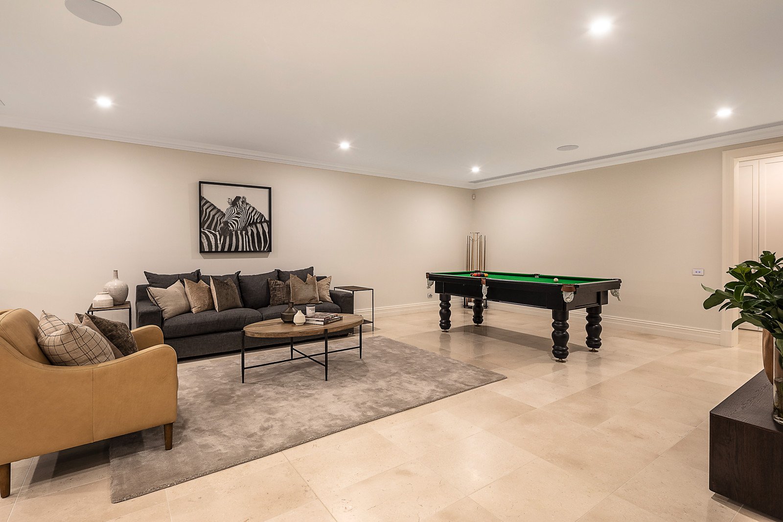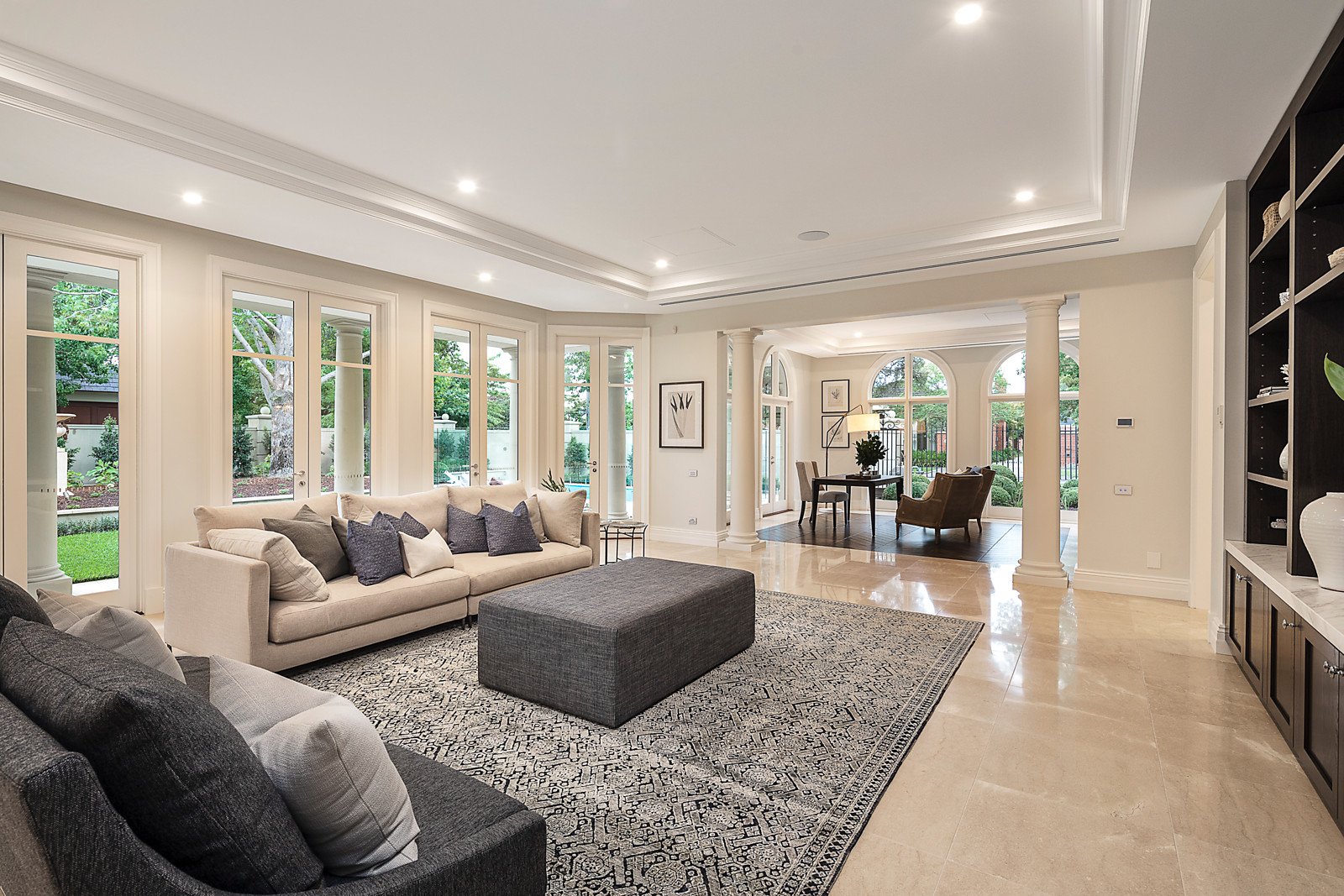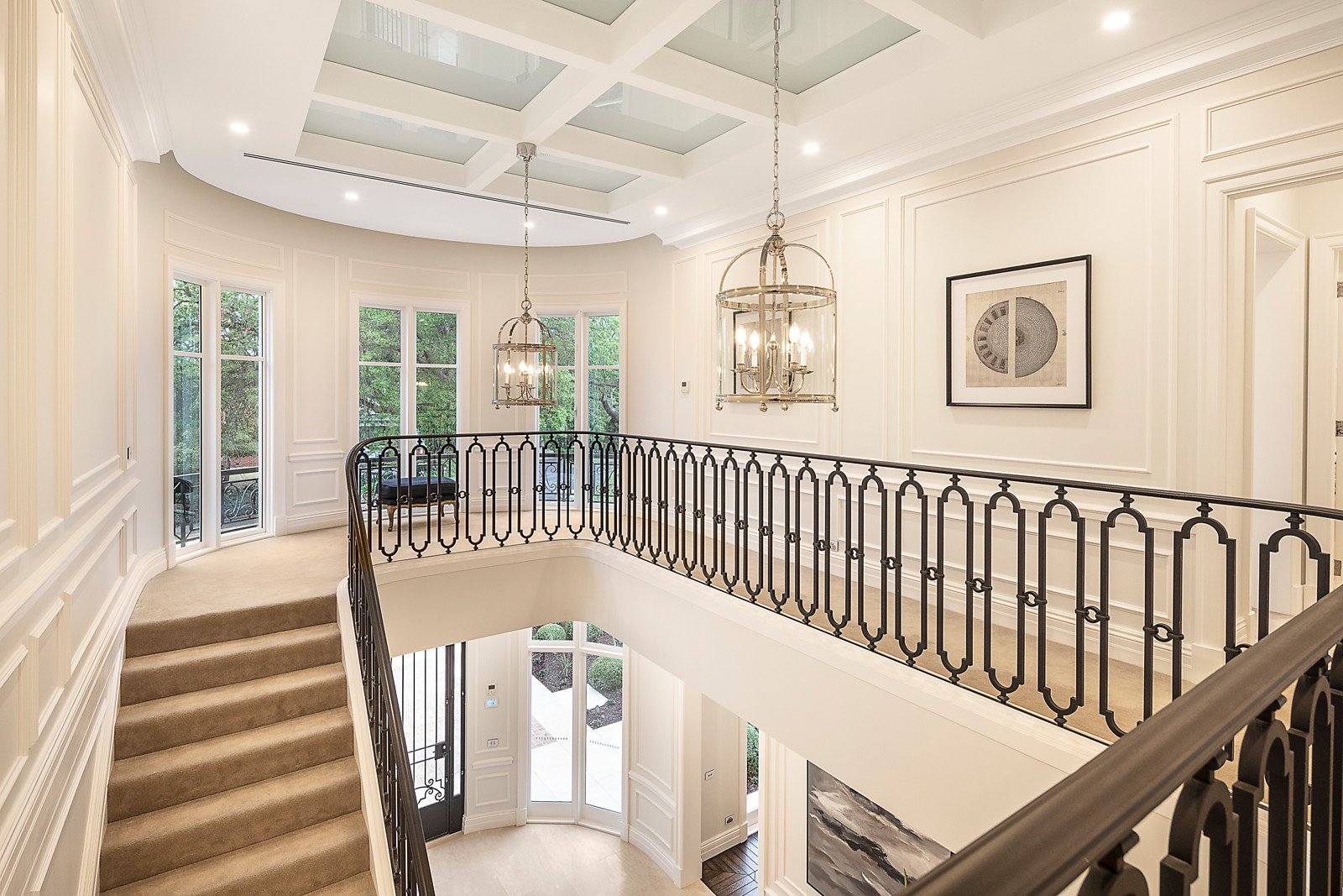 The palatial reception hall boasting a soaring double height coffered ceiling, limestone floors and an Italian chandelier creates an unforgettable first impression. Majestically proportioned and ideal for entertaining on a lavish scale, the sumptuous formal sitting and dining rooms with gas fireplace flow out to a landscaped limestone terrace. On the north-side of the hall, a refined fitted library, expansive living room and glorious dining area open to the stunning north-facing landscaped garden with a premium solar-heated pool and wonderful al fresco terrace complete with BBQ kitchen, gas fireplace, outdoor heaters and powder-room. A triumph of form and function, the sublime kitchen is appointed with Calacatta marble benches, top of the range Miele appliances, integrated fridge/freezers and a full butler's pantry. A seductively curved staircase featuring customized wrought ironwork and a lift ascend to the accommodation level comprising the opulent main bedroom with luxurious en-suite, dual walk in robes and north-facing balcony, three additional double bedrooms with built in robes and stylish en-suites, 5th bedroom with built in robe and a generous lounge room or retreat. An entertainment zone on the basement level includes a huge fully fitted home cinema, fabulous recreation/billiards room with wet-bar and evocative wine room, a gym, bathroom and 5-car garage.