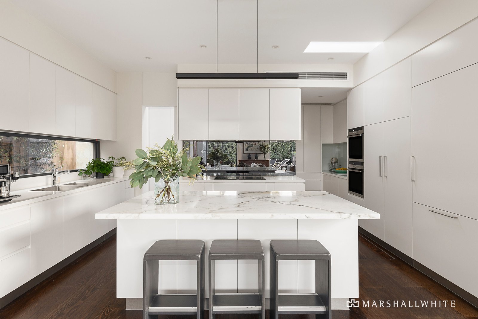 A marble island bench highlights the refined sophistication of the central kitchen, equipped with European appliances, an integrated fridge/freezer, a Vintec wine fridge, and a Billi tap (sparkling/hot/filtered) in the butler's pantry. High ceilings, plantation shutters and Blackbutt flooring accent the home, with the main bedroom boasting built-in robes and a sky-lit contemporary ensuite.