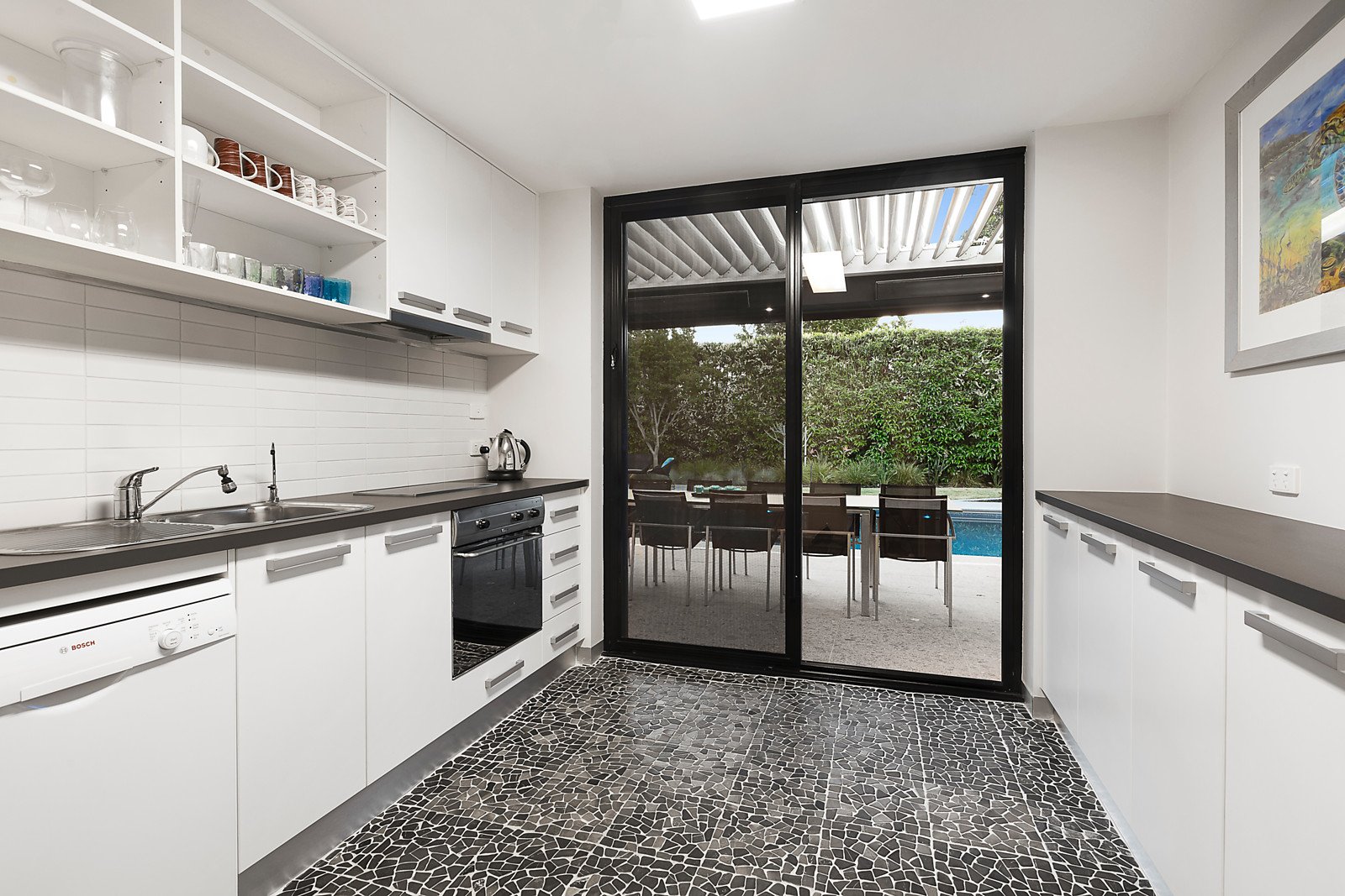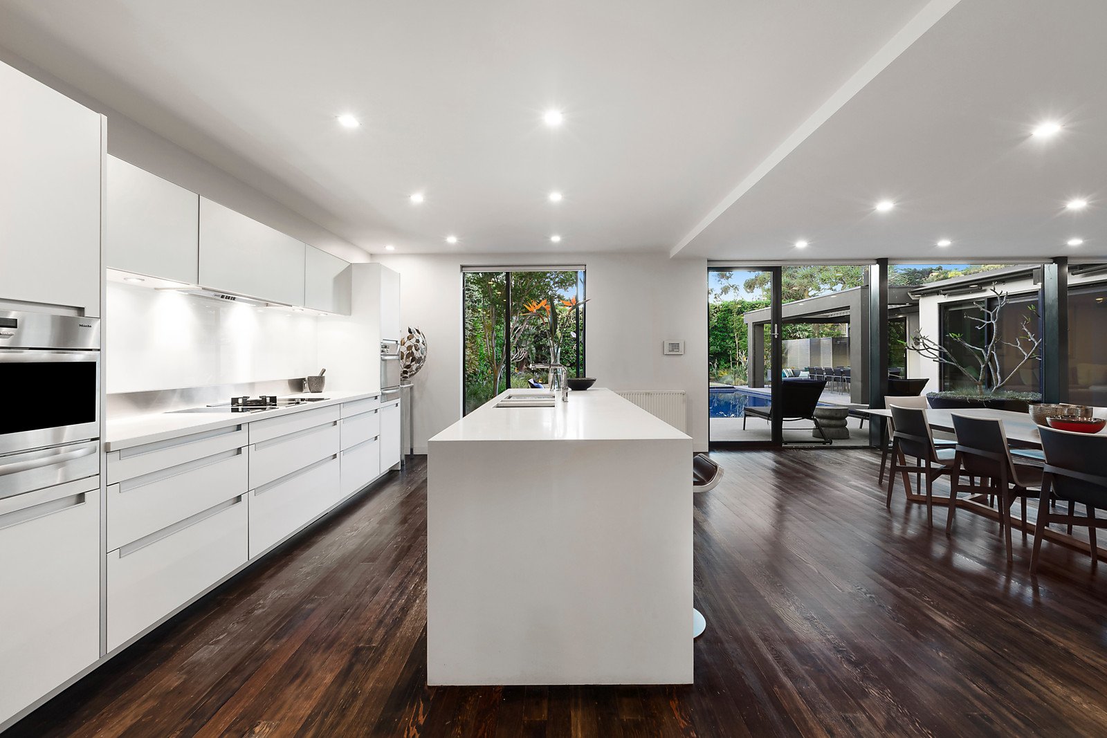 A distinctive façade, attractive gardens and a calming water feature with goldfish precedes a stunning contemporary designer interior. The welcoming entry foyer flows past a flexible formal sitting room with gas fireplace, through to very generously proportioned open plan living and dining and gourmet kitchen boasting Caesarstone benches, butler's pantry and a suite of premium appliances including induction cooktop, dual ovens, warming drawers, steamer, integrated dishwasher, fridge and freezer. Living seamlessly extends out to the sensational north facing outdoor entertaining zone which features an undercover barbeque area, alfresco dining with Velux louvres, strip heaters and automatic sun blind plus a salt water solar heated pool, all surrounded by private easy care gardens. Inside, the entertainment zone includes a built in bar, fully equipped home theatre, bathroom and kitchen.