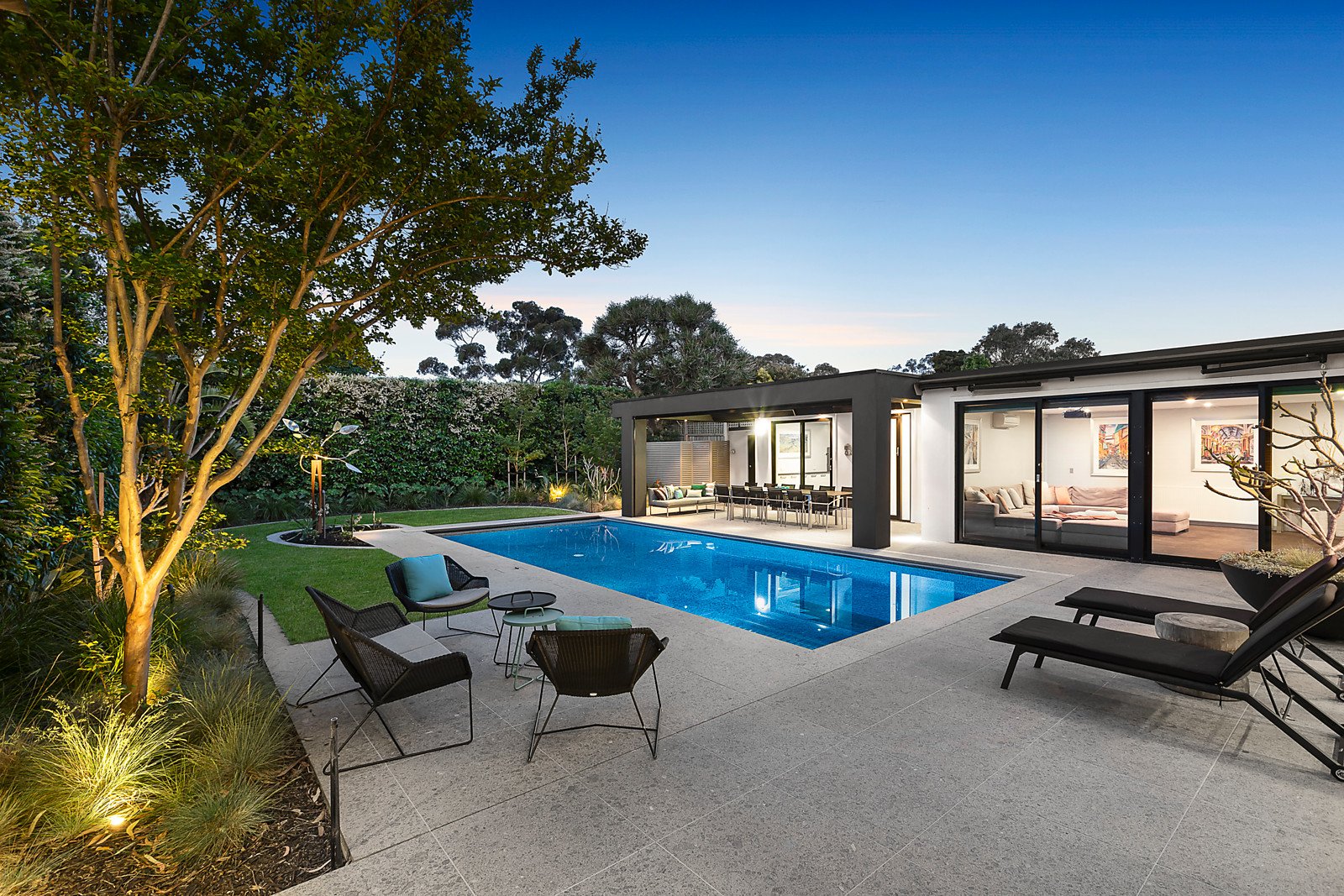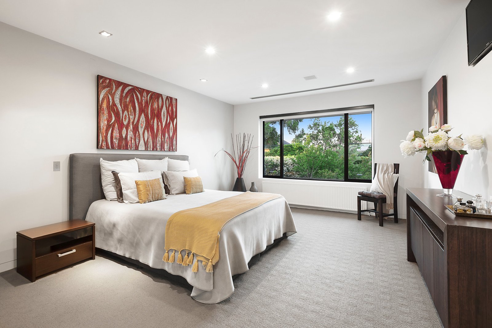 The spacious main bedroom overlooks the pool and gardens and is complete with a dressing room and lavish ensuite showcasing a double vanity, double shower, spa bath and heated towel rails. A second bedroom with ensuite and walk in robe is complemented by a teenager's retreat which leads to two further king sized bedrooms with robes sharing a stylish bathroom. Other attributes of this luxurious home include a generous study or fifth bedroom, ground floor powder room, well equipped laundry, water tanks, zoned air conditioning, hydronic heating, 11KW solar panel system, C-Bus home automation, multiple in built televisions, 4-car garage with storage plus additional off street parking.