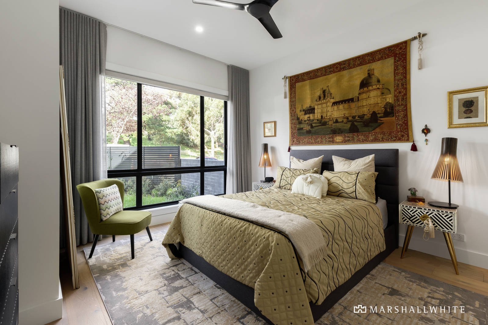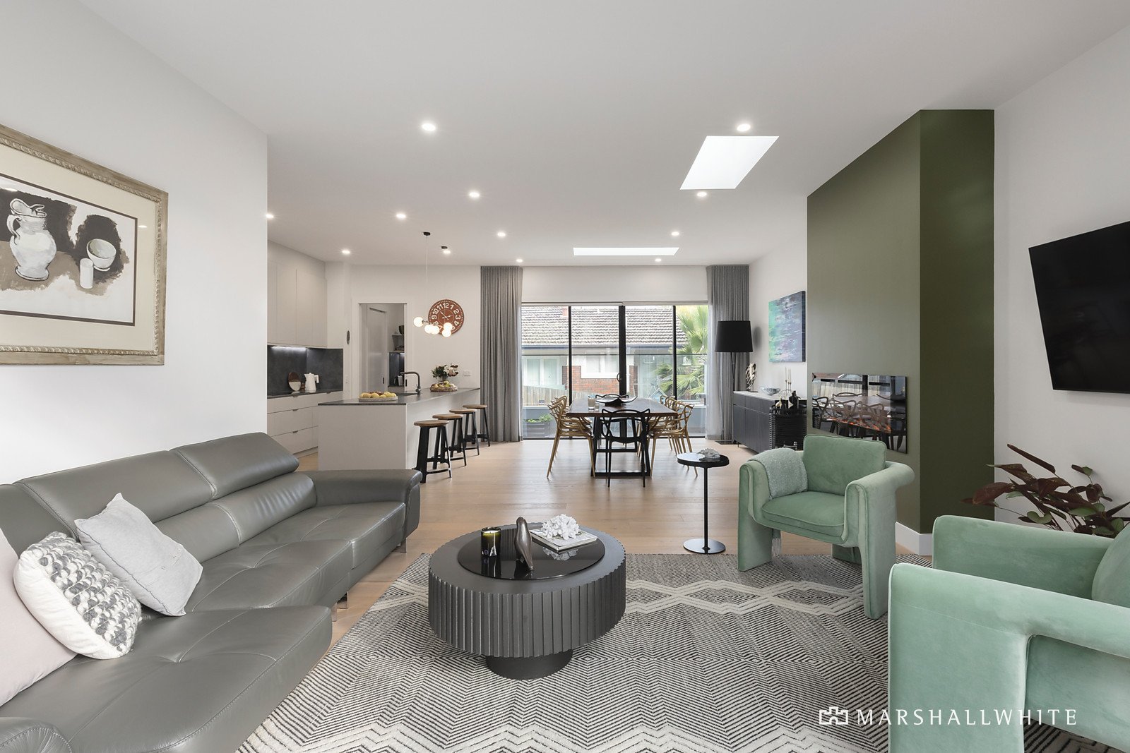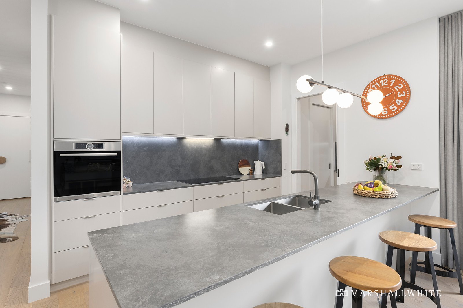 A celebration of light and proportion, under three metre ceilings, the open-plan living area is warmed by an evocative electric fireplace and overseen by a custom-built, gourmet kitchen in which a suite of largely European appliances - including an induction cook top - is complemented by stone benches and a walk-in pantry. Seamlessly connected to both north and south-facing outdoor living areas, the space is open, lofty, and suited to year-round alfresco enjoyment.