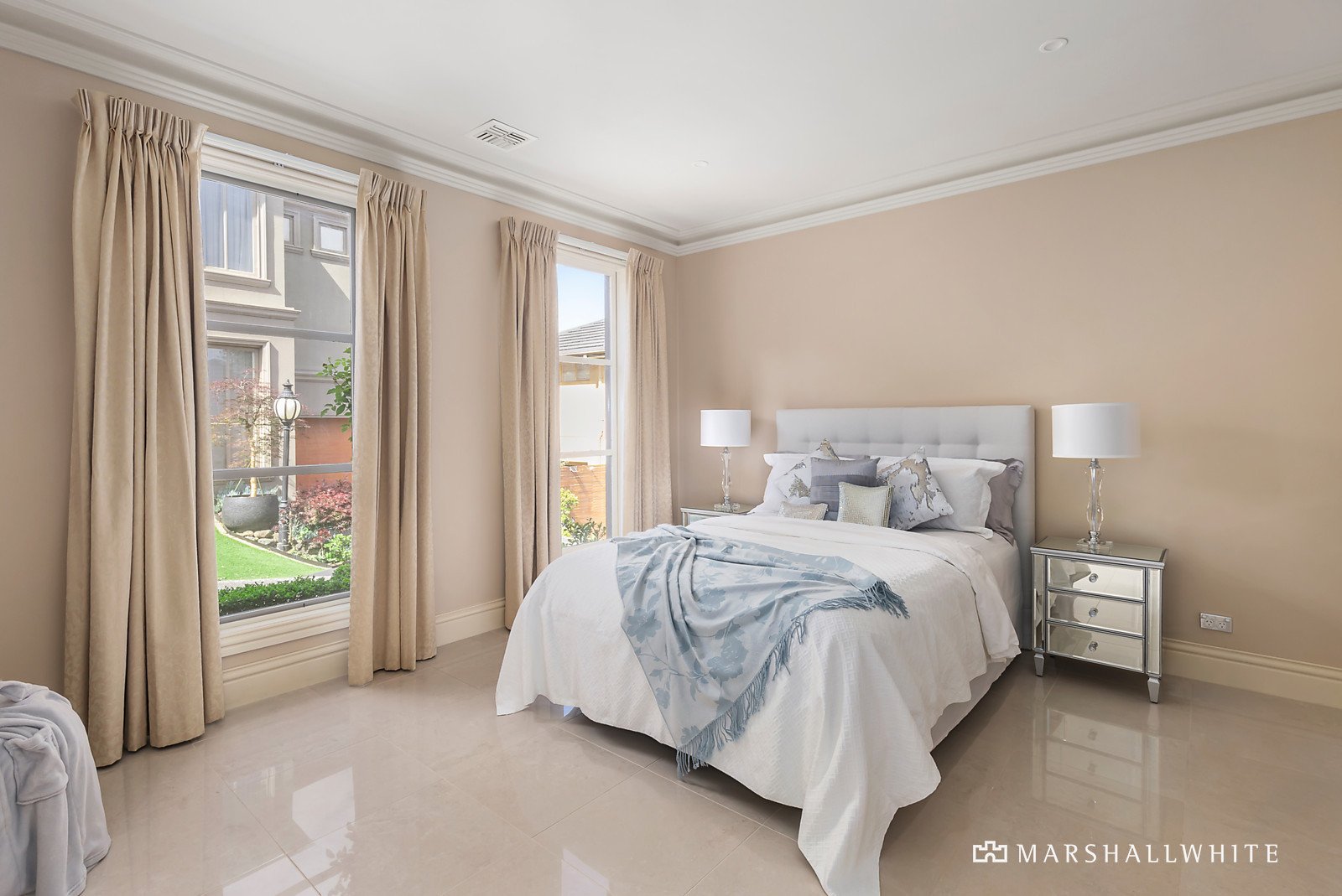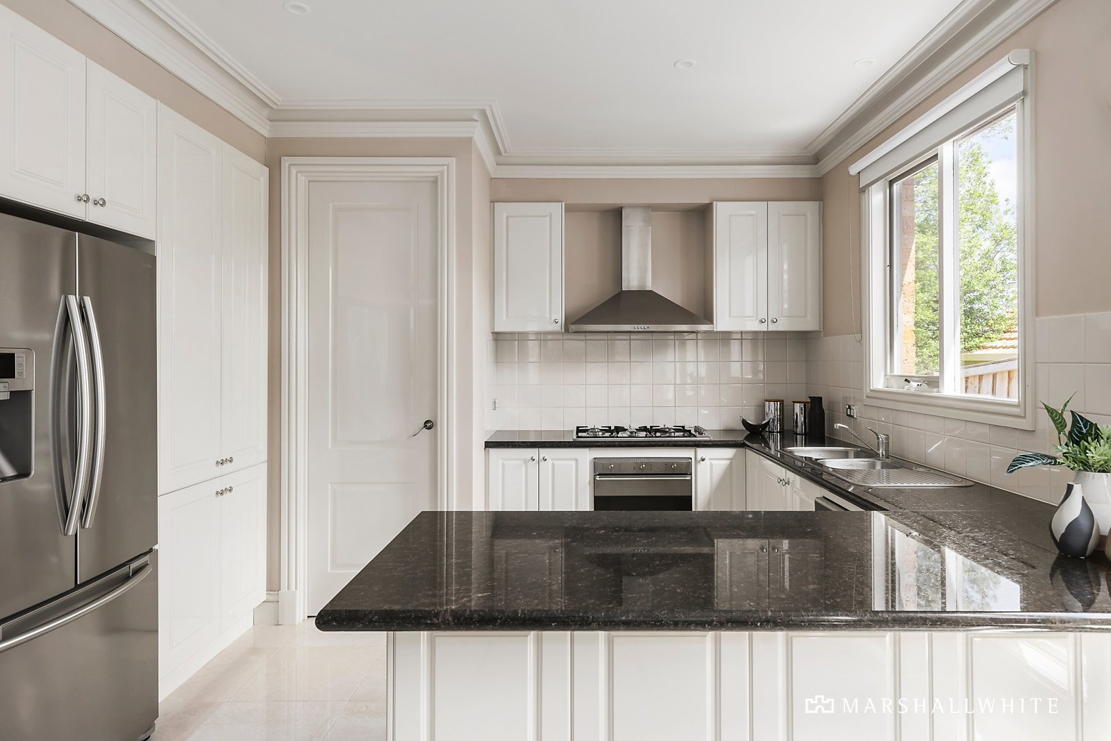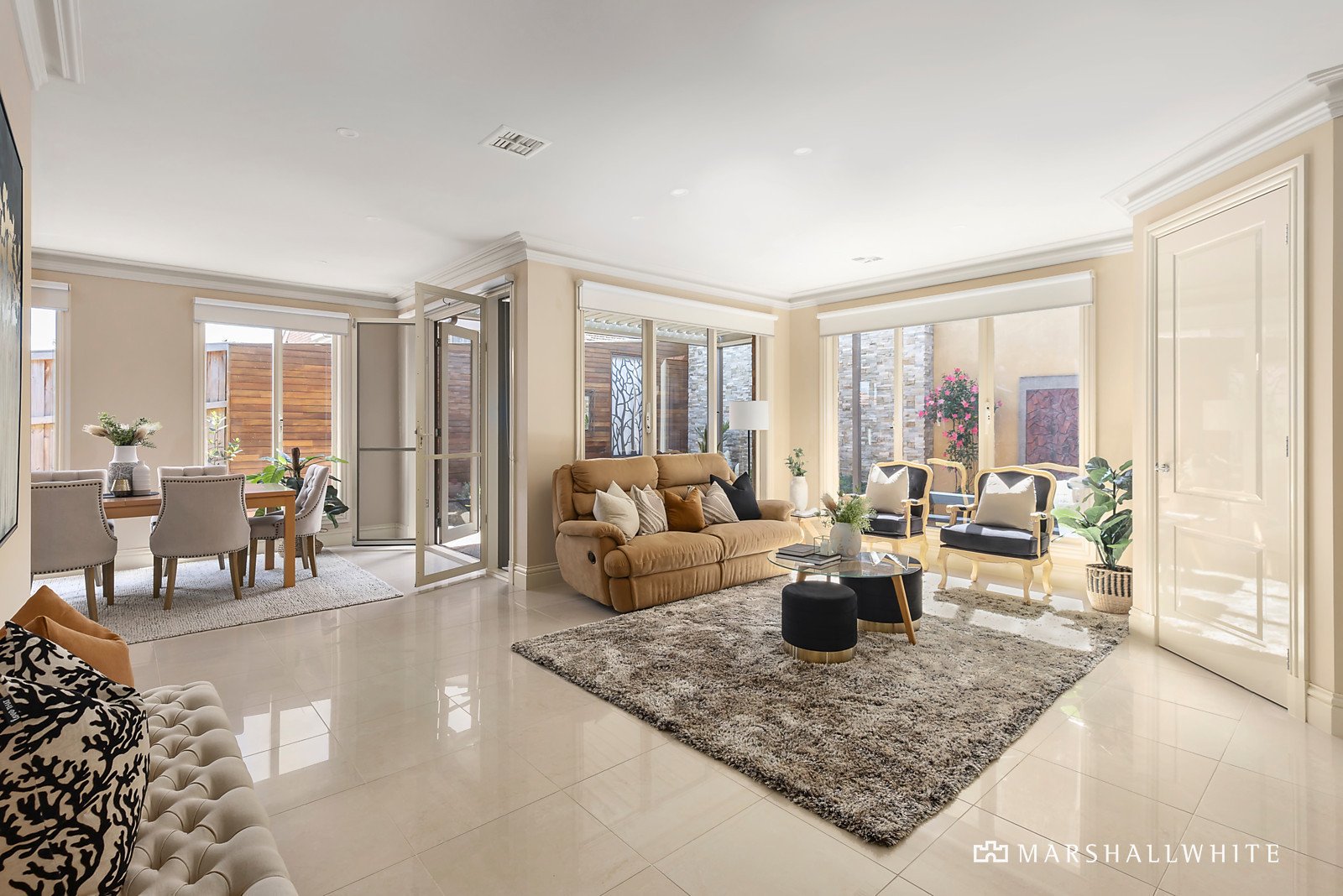 Stone-tiled floors and floor-to-ceiling windows set a sophisticated tone. The formal living and dining areas, bathed in natural light, complement the expansive family room and meals area at the rear of the home. The gourmet kitchen, with granite benches, Smeg appliances, and ample cabinetry, caters to convenience and style. Step outside to a low-maintenance courtyard with pergola, a sun-soaked and beautifully designed retreat for entertaining.