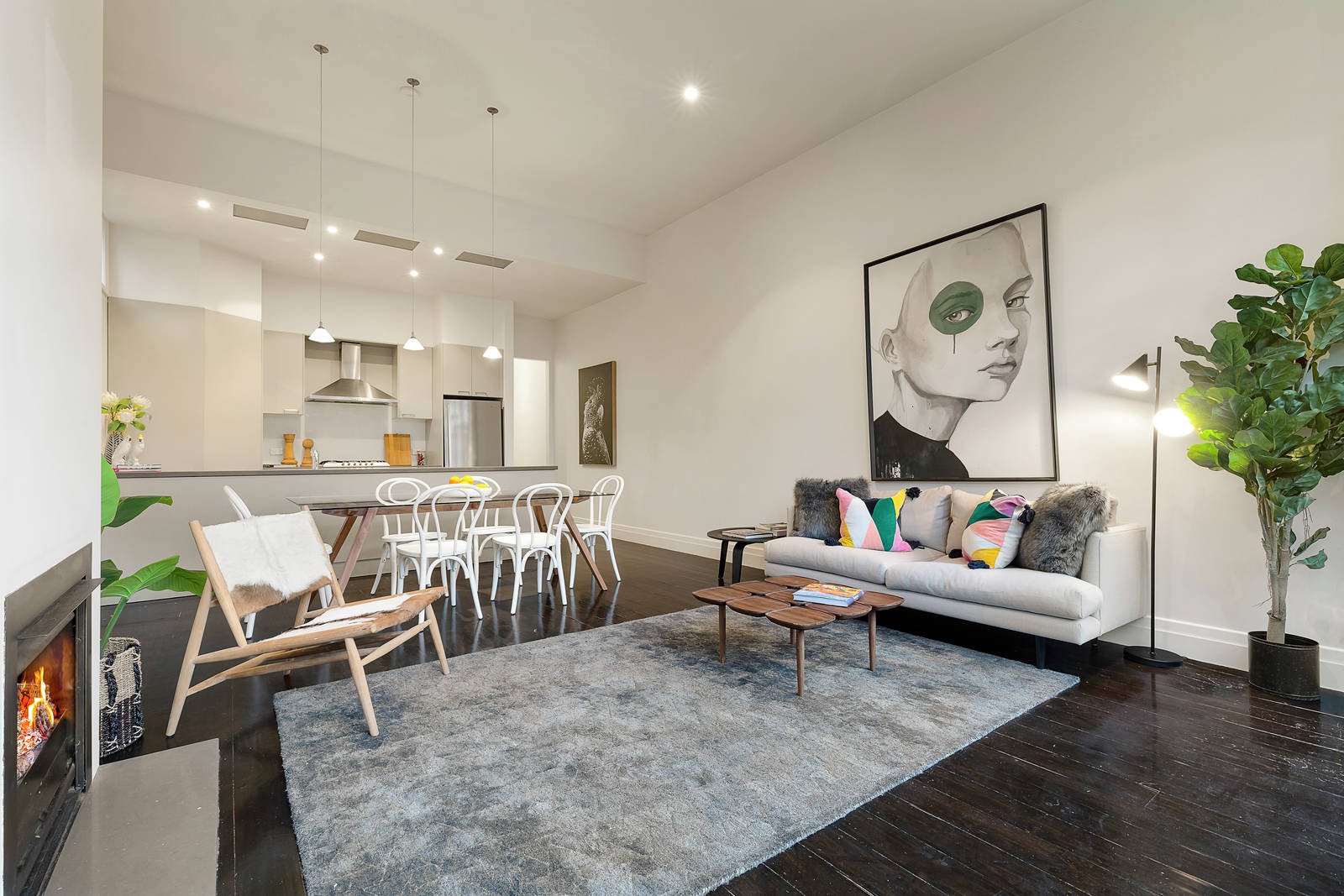 The entrance hall featuring high ceilings introduces three good-sized bedrooms and a bright bathroom with laundry facilities. The generous open plan living room with gas fireplace and entertainers kitchen open through bi-fold door to decked sunny terrace.