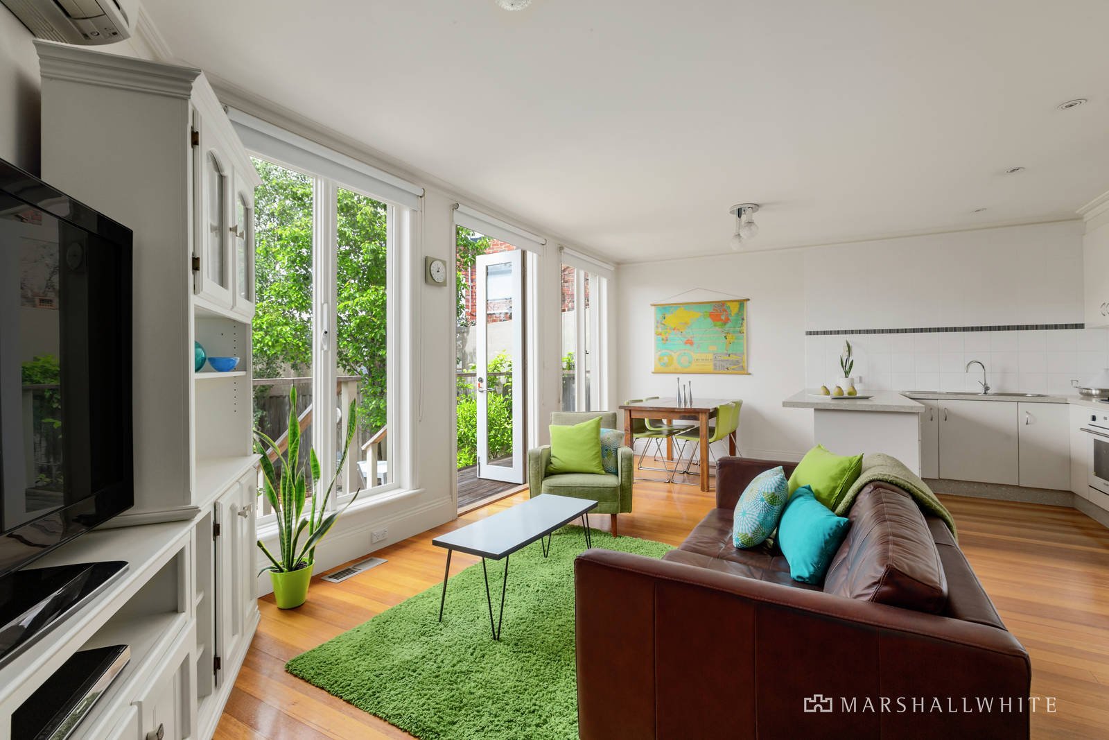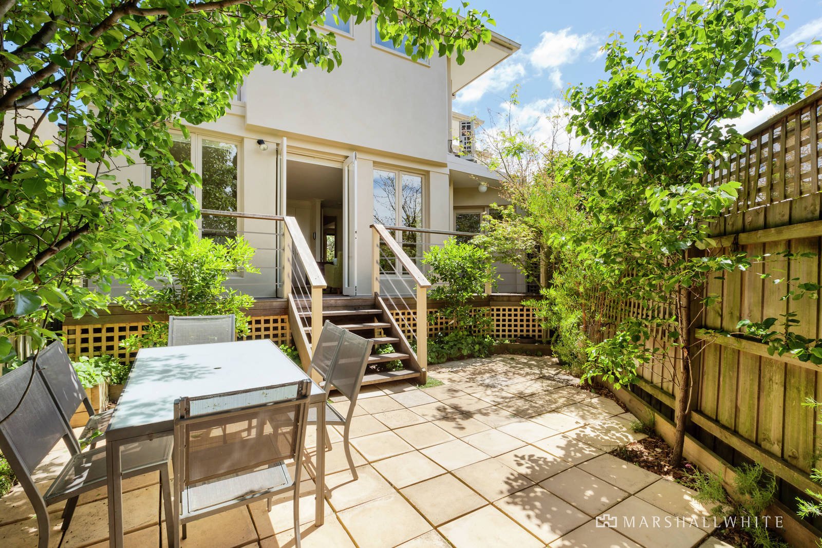 Nestled behind a high walled northwest garden oasis, the central entrance hall flows through to an inviting sitting room and light-filled formal dining room. Featuring hardwood timber floors and bathed in natural light, the open plan living and dining room with a gourmet stone kitchen opens through French doors to a decked verandah and the private leafy northeast garden. Upstairs accommodation comprises a spacious main bedroom with built in robe, en suite and north-facing balcony, two additional bedrooms with built in robes, bright bathroom and a west-facing balcony.