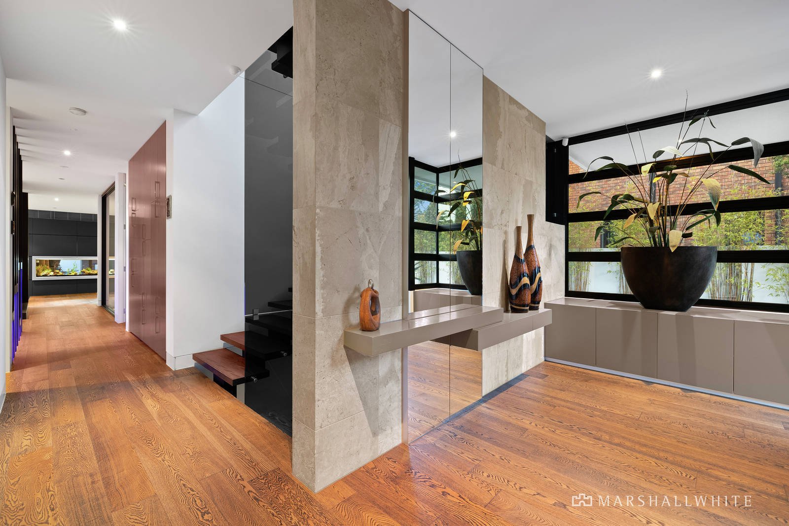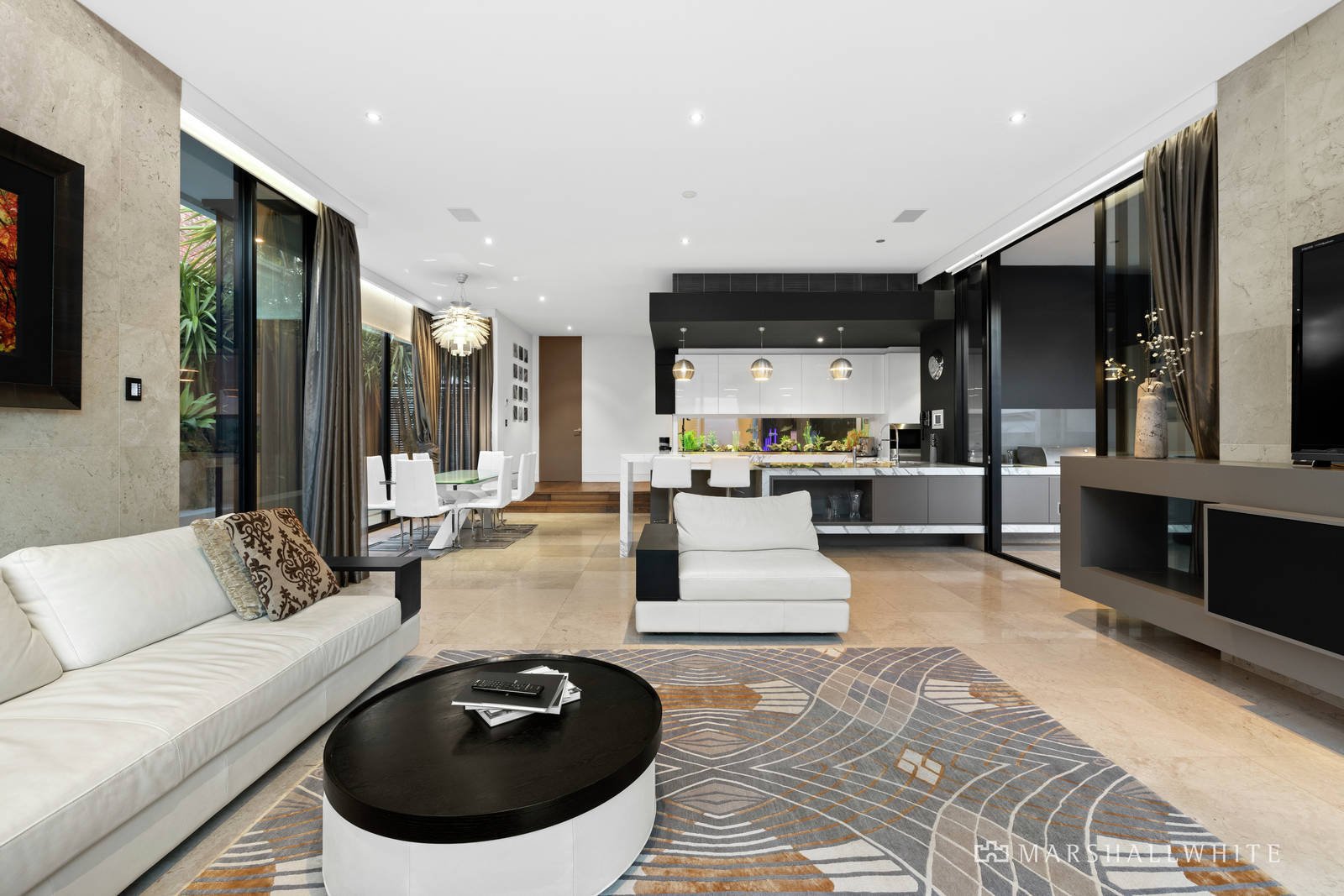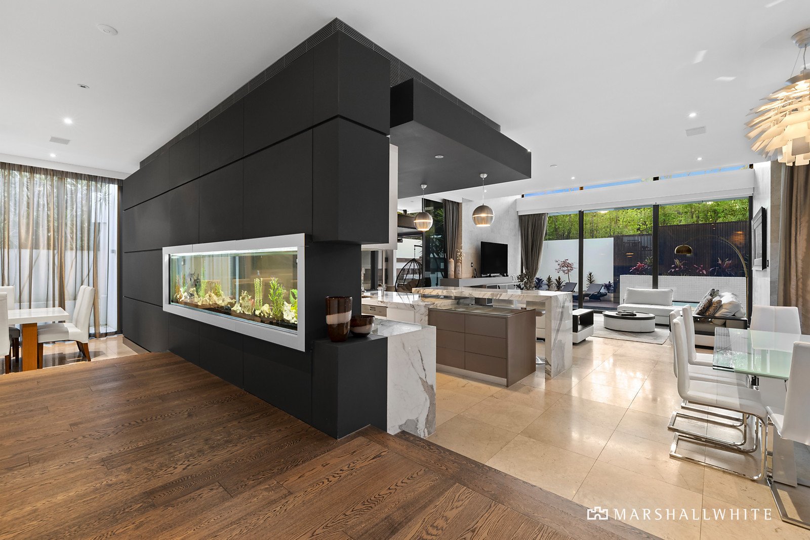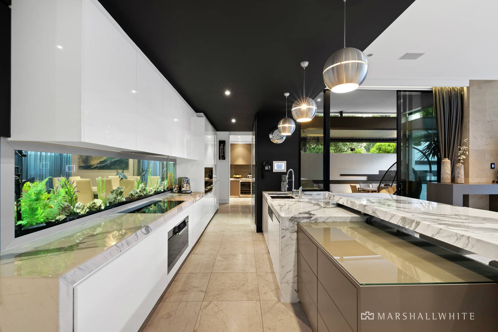 In a feat of contemporary architecture envisioned by renowned Melbourne architect Patrick Gheorgiu, lavish conceptual design has resulted in a luxurious collection of living spaces that will captivate and inspire. Approximately 90 squares of easily maintained living zones are interspersed with multiple landscaped exterior spaces to create a connection with outside. The award winning kitchen is truly one of a kind, featuring calacatta marble benchtops, white emporite cabinetry, a suite of Miele appliances and a feature splashback freshwater tropical fishtank that can be admired from the entry hall and living room.