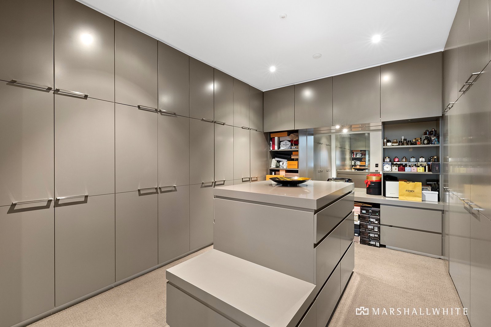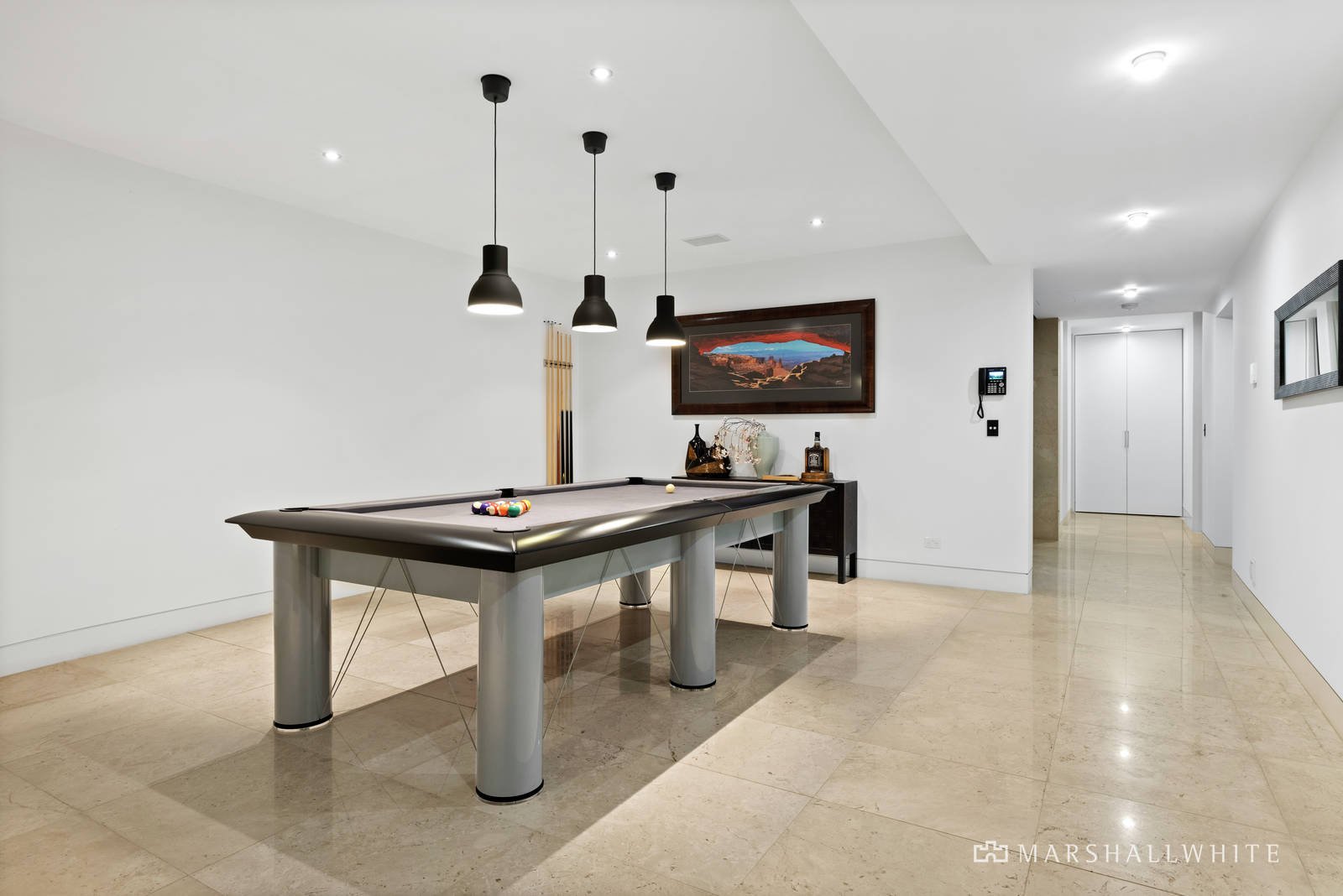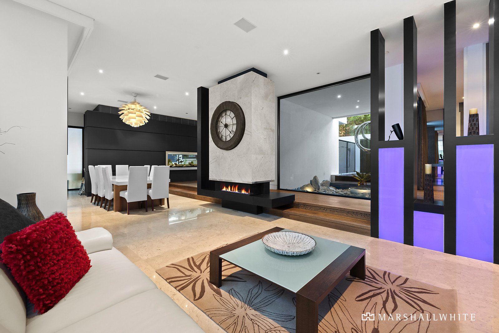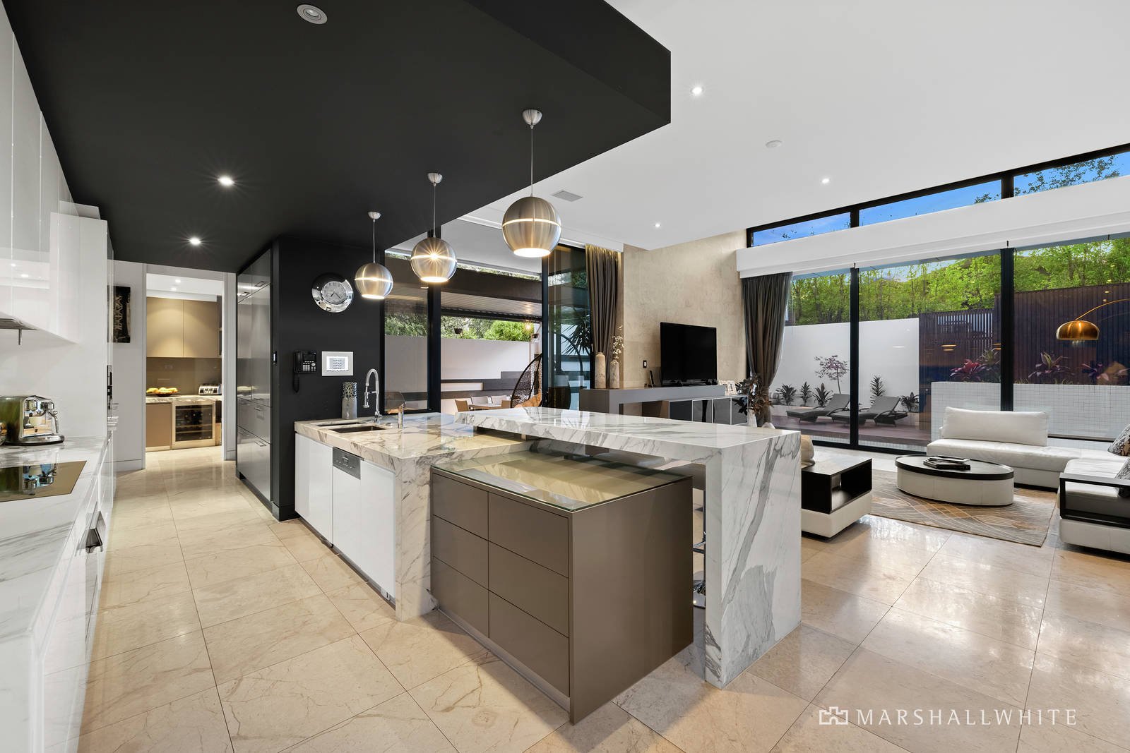 In a feat of contemporary architecture envisioned by renowned Melbourne architect Patrick Gheorgiu, lavish conceptual design has resulted in a luxurious collection of living spaces that will captivate and inspire. Approximately 90 squares of easily maintained living zones are interspersed with multiple landscaped exterior spaces to create a connection with outside. The award winning kitchen is truly one of a kind, featuring calacatta marble benchtops, white emporite cabinetry, a suite of Miele appliances and a feature splashback freshwater tropical fishtank that can be admired from the entry hall and living room.