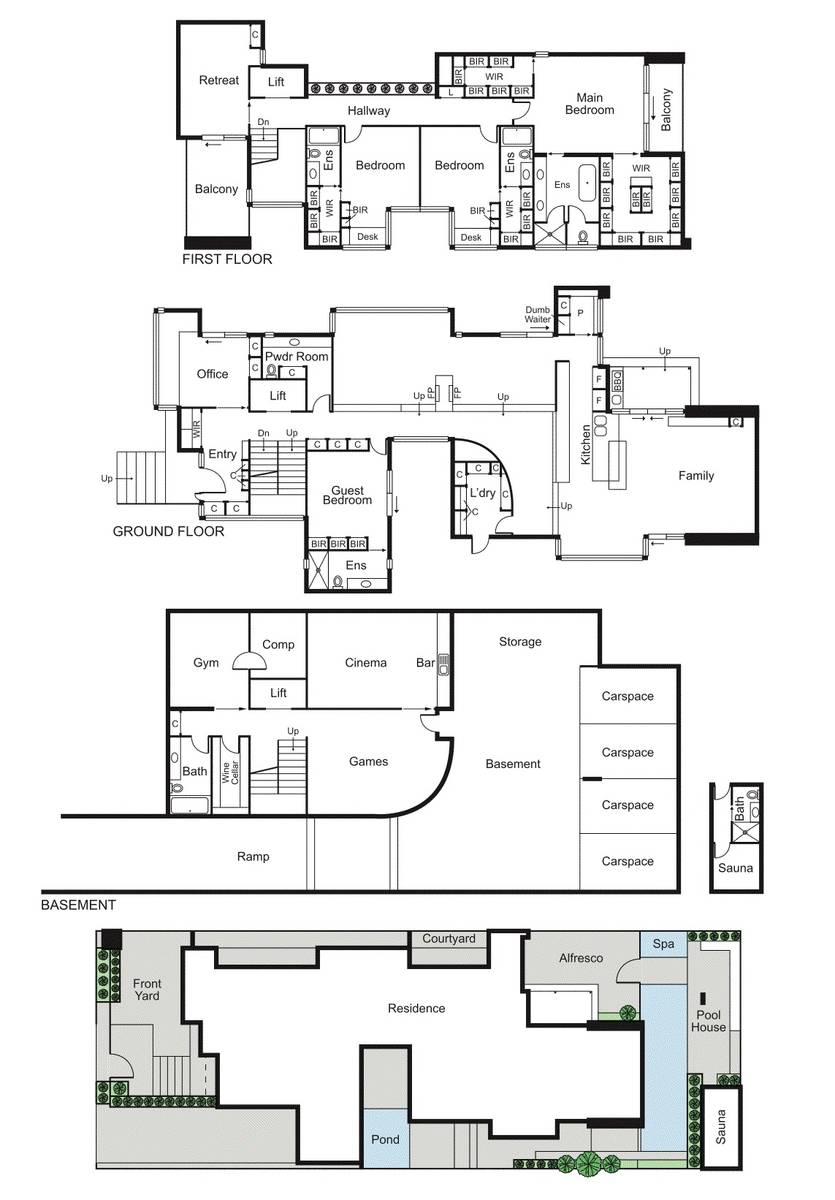 The extravagant main bedroom features two separate walk in robes, an enormous ensuite bathroom and west facing private balcony. Two additional ensuite bedrooms and a retreat complete the first floor. Descend into the luxury basement where a gym, games room, theatre room with bar, and additional bathroom can be found. The garage comfortably fits four vehicles and a convenient dumbwaiter allows baggage transfer to ground level, complemented by a lift to all three floors.