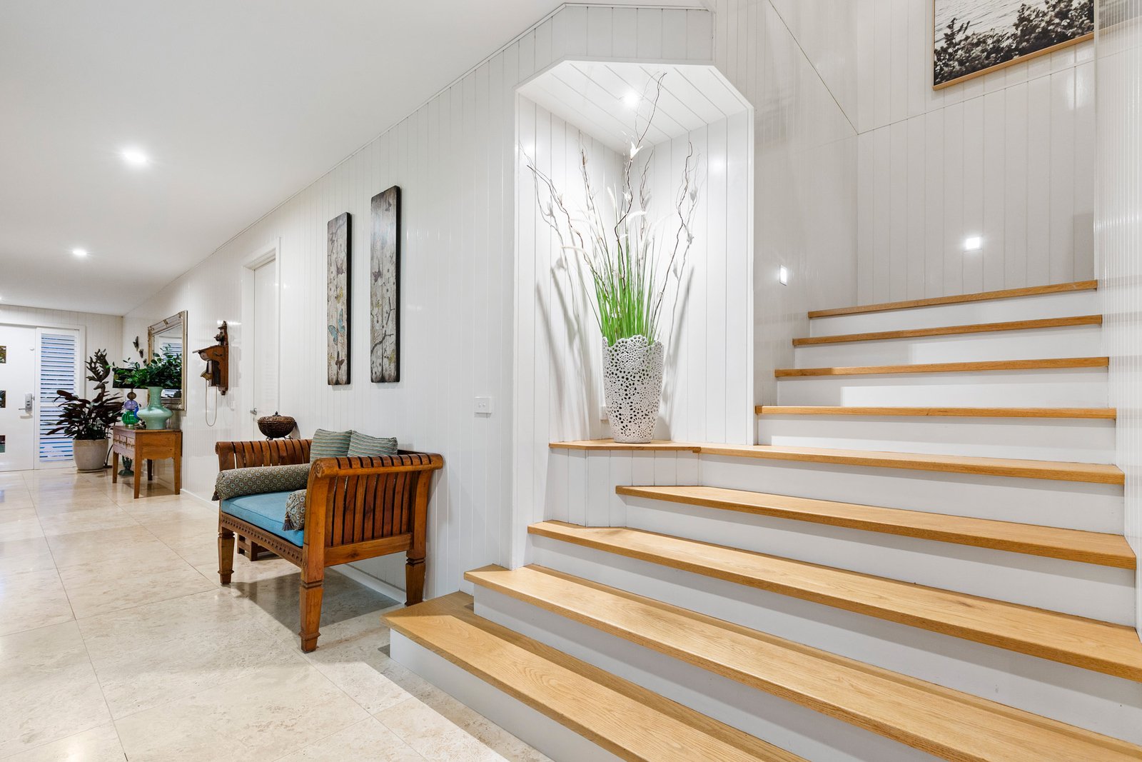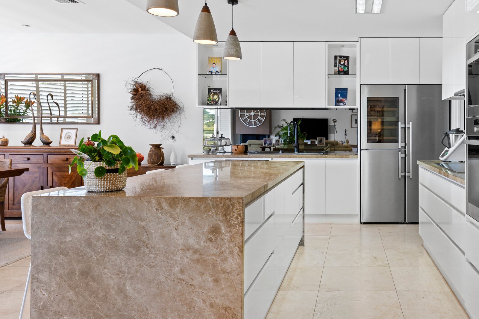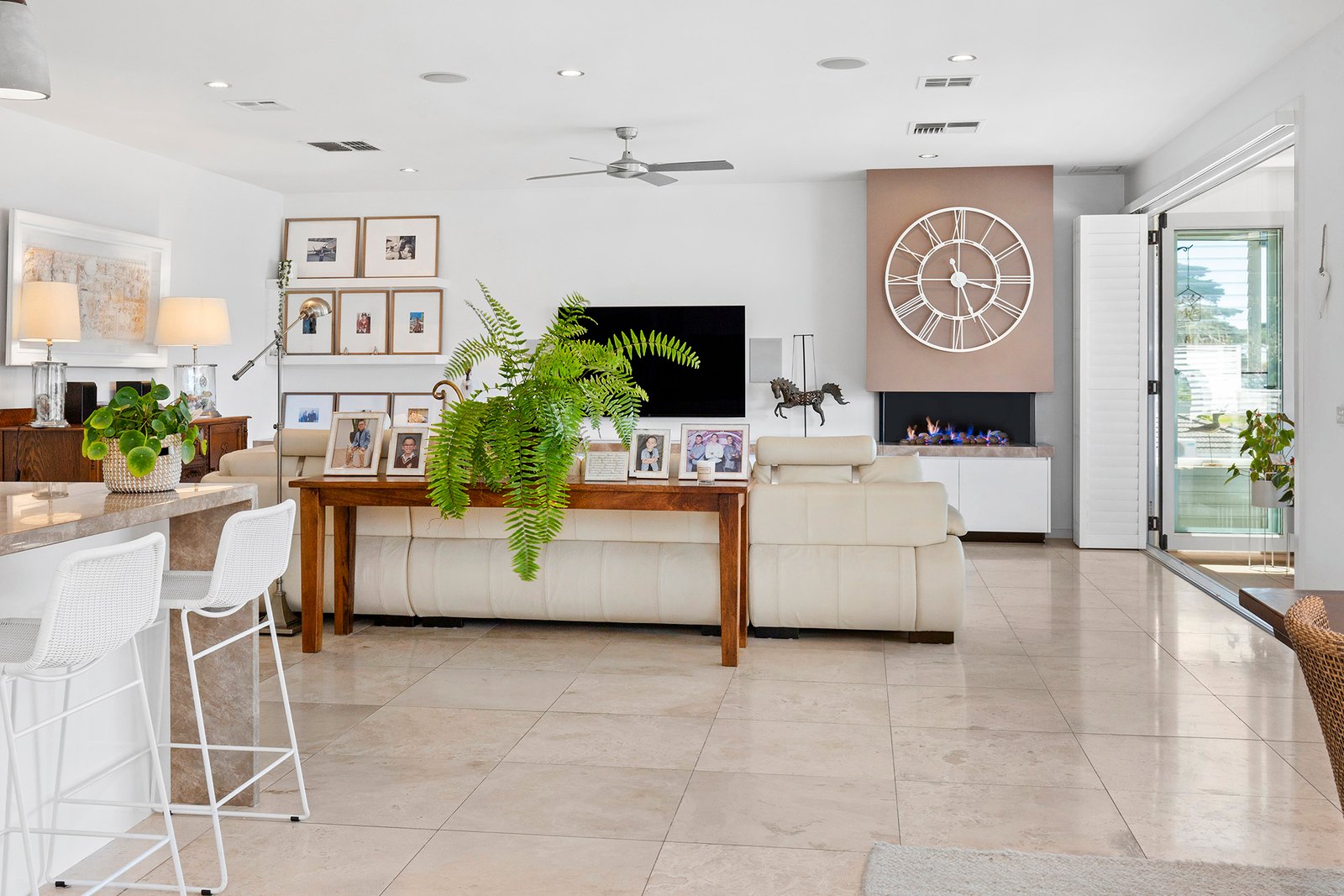 Privately set behind a high fence with an automatic gate and a lush verdant border of magnolia trees, the double-storey sandstone-clad home’s modern Queenslander-inspired aesthetic is enhanced with tropical plantings in low-maintenance gardens. The relaxed, calming ambience continues inside with travertine flooring, plantation shutters, louvre windows, and sandstone walls enriching the generously proportioned home’s light-filled dimensions. Designed to take advantage of the broad Bay vistas across Mornington Park, the main open-plan living and dining area with a stylish gas pebble fireplace is on the upper level, with glass sliding/stacker doors presenting a seamless connection to the semi-enclosed undercover alfresco terrace, perfect for all-season entertaining.