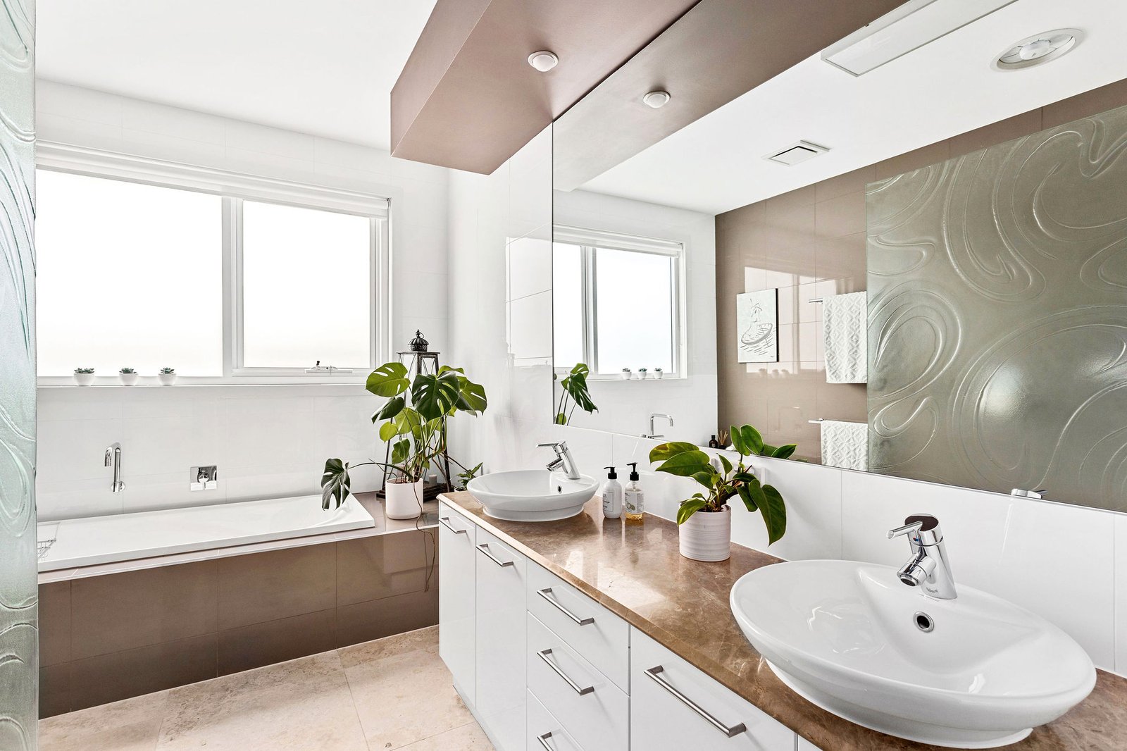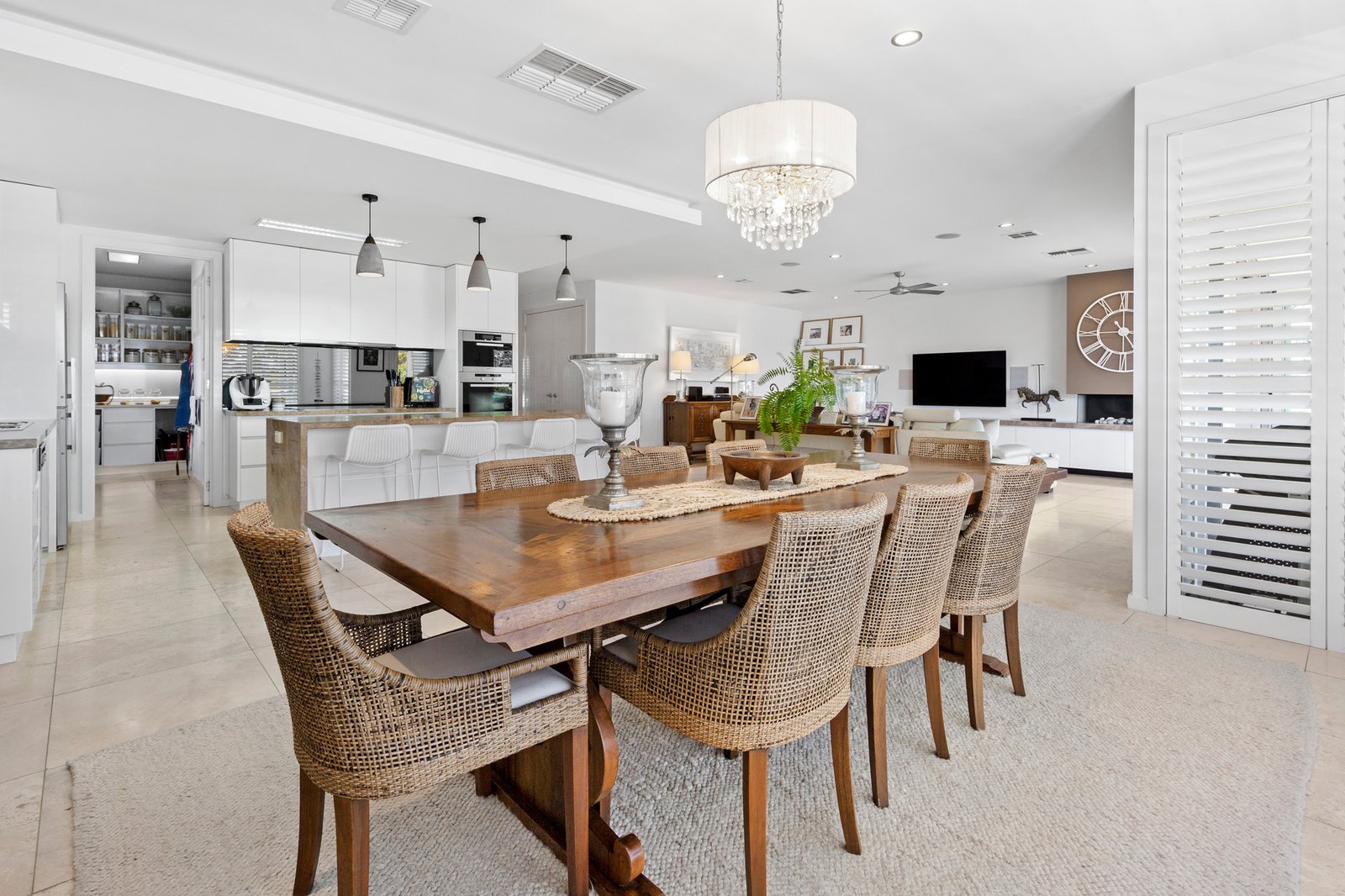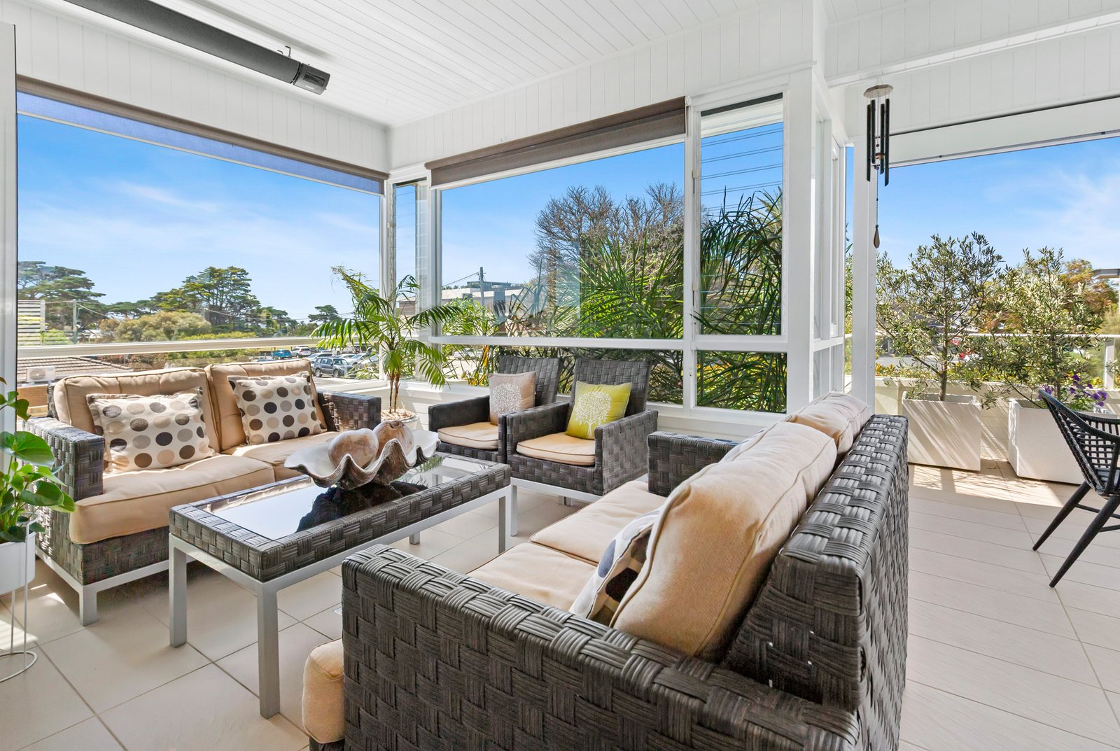 Privately set behind a high fence with an automatic gate and a lush verdant border of magnolia trees, the double-storey sandstone-clad home’s modern Queenslander-inspired aesthetic is enhanced with tropical plantings in low-maintenance gardens. The relaxed, calming ambience continues inside with travertine flooring, plantation shutters, louvre windows, and sandstone walls enriching the generously proportioned home’s light-filled dimensions. Designed to take advantage of the broad Bay vistas across Mornington Park, the main open-plan living and dining area with a stylish gas pebble fireplace is on the upper level, with glass sliding/stacker doors presenting a seamless connection to the semi-enclosed undercover alfresco terrace, perfect for all-season entertaining.