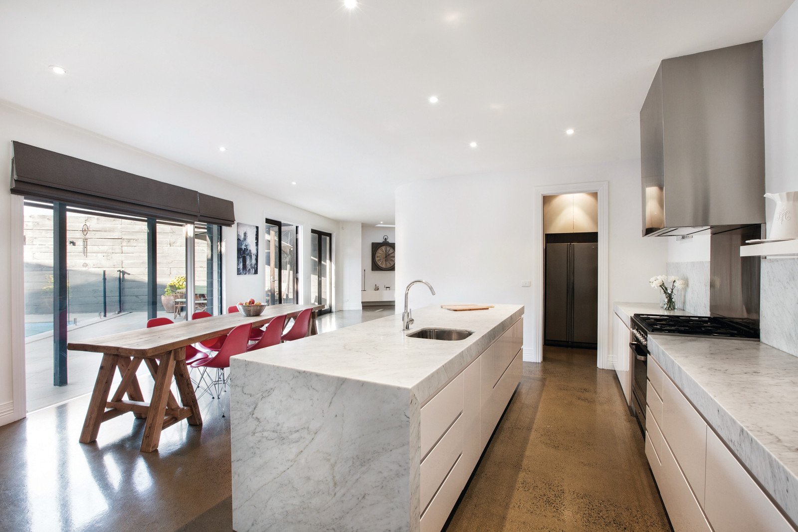 A builder's own home, it stands out from the crowd with its shiplap exterior, spacious interior and outdoor living with a pool, play space and large second-storey terrace. Three living zones are cleverly designed for large-scale entertaining, everyday relaxing and easy-care zoned living. Luxe features are everywhere, with polished concrete floors, streamlined marble kitchen with views out to the pool, family room with gas fireplace and floating cabinetry, and a ground-floor parents' retreat. High ceilings add a spacious dimension to the upstairs bedrooms, and bathrooms are all about style and fine finishes. The upstairs terrace is the perfect spot to watch Dendy Park's Christmas fireworks, downstairs is where you'll find a lounge and study, and everywhere you look you see the latest features.