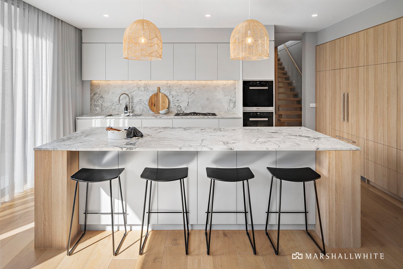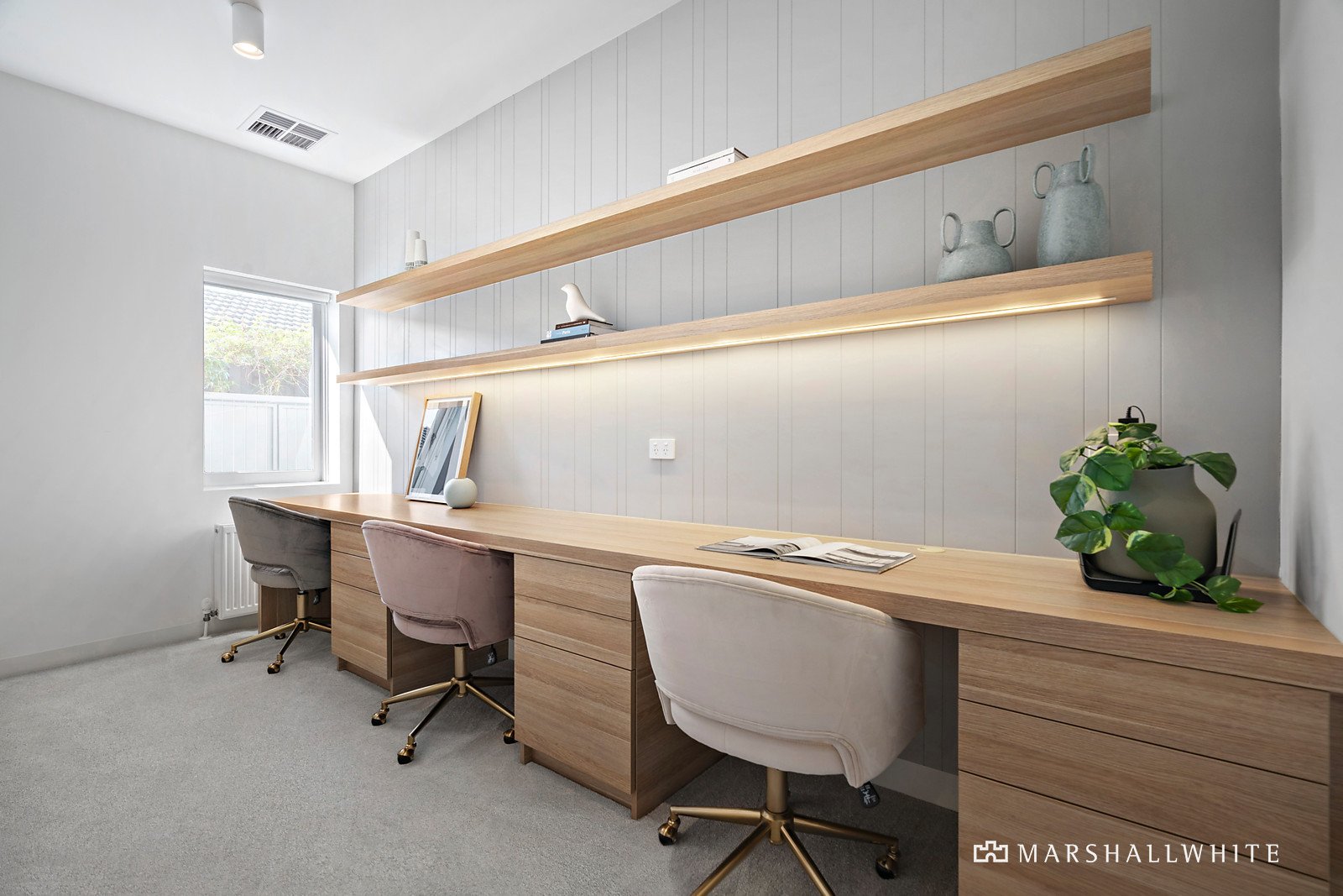 Celebrating the home's northerly aspect, the visionary renovation and extension features a highly engineered custom-designed plunge pool and spa that is set into the home, providing views of the pool from all angles and an abundance of internal light within the main open-plan living and culinary zone. Beautifully appointed interiors by Peronel Kennedy, including sleek custom joinery with elegant timber veneers, and 'Super White' dolomite quartz benchtops in the central kitchen appointed with Miele appliances and an integrated fridge/freezer. Completing the considered ground-level layout is a laundry, linen store, powder room, and fitted home office with three desk pods. Two bedrooms at the front of the house retain the home's original Art Deco features including ornate plasterwork ceilings, and the main bedroom has a new walk-in robe and luxe ensuite. Upstairs is a large plush-carpeted retreat area, and a further two bedrooms with substantial built-in robes, a main bathroom, plus separate powder room.