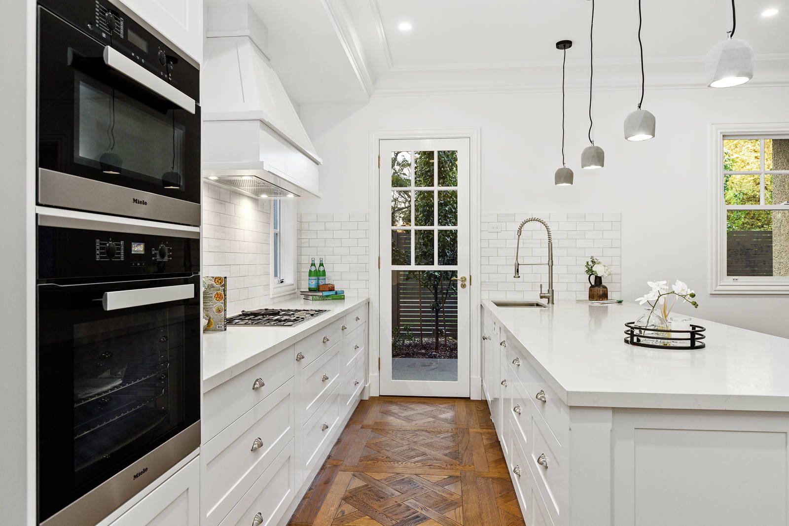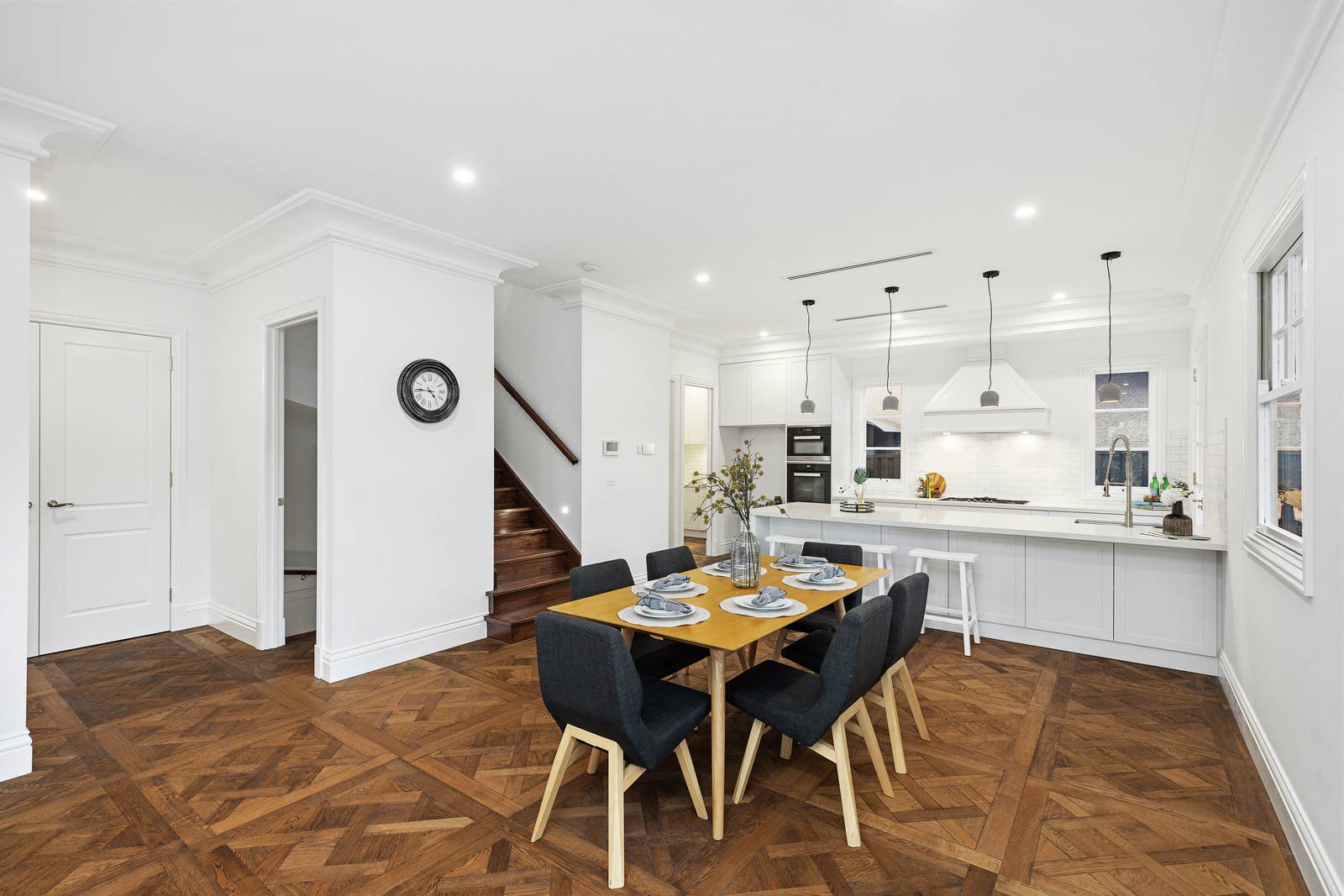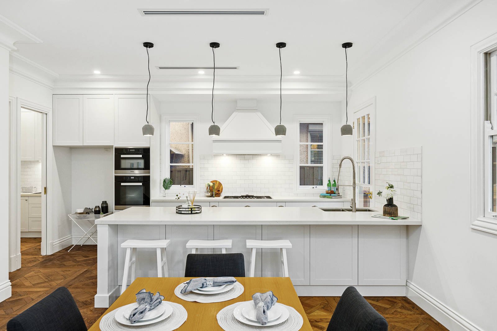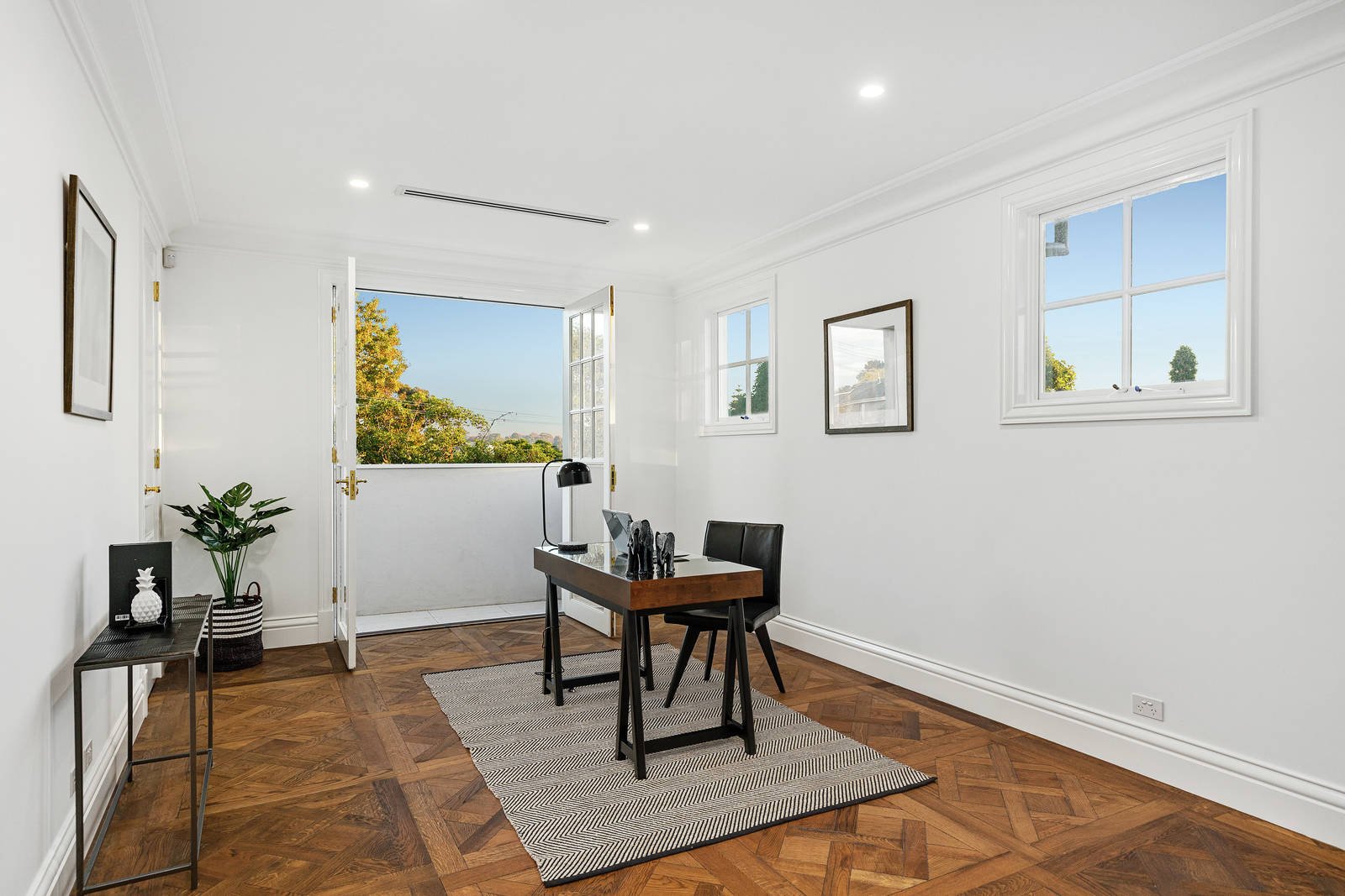 Imposing ornate double doors at the entrance reveal a broad reception hall featuring intricate Petit Versailles oak parquetry and high ceilings. The parquetry continues through to the expansive open plan living and dining room, opening out to a private northeast-facing covered entertaining terrace with a BBQ kitchen. The Hampton's inspired gourmet kitchen is lavishly appointed with stone benches and Dolomite marble splashbacks, Miele appliances, and a fully-equipped butler's pantry. Opulent in scale and finish, the main bedroom with designer ensuite, bath, and walk-in robe sets a benchmark in luxury that is matched upstairs by three additional bedrooms with stylish ensuites and walk-in robes, a large retreat, storeroom, and balcony with expansive city views. On the basement level, there is a sensational home theatre with a wet bar, powder room, gym area, and spacious double garage.